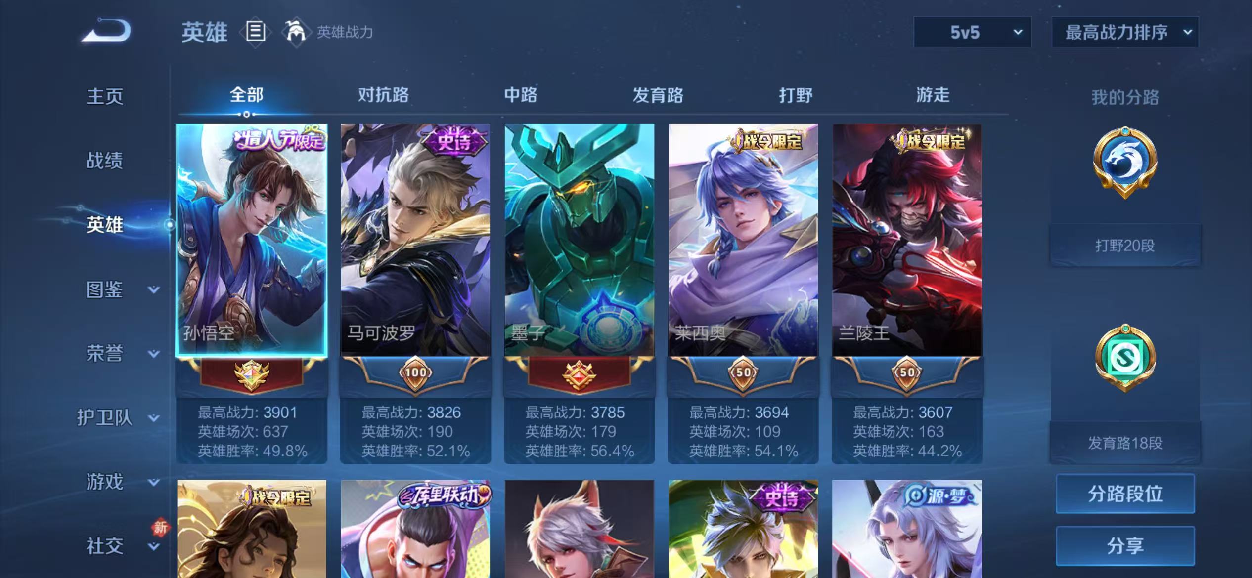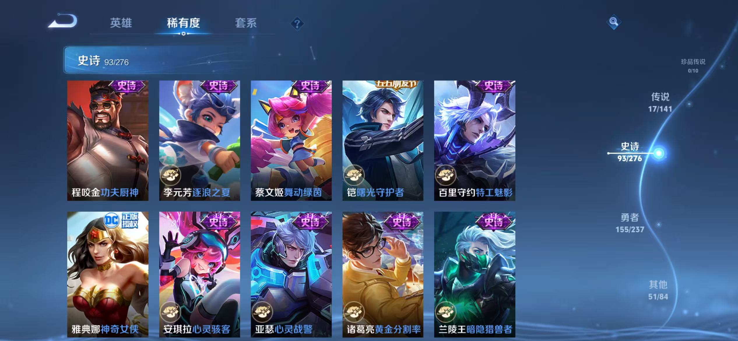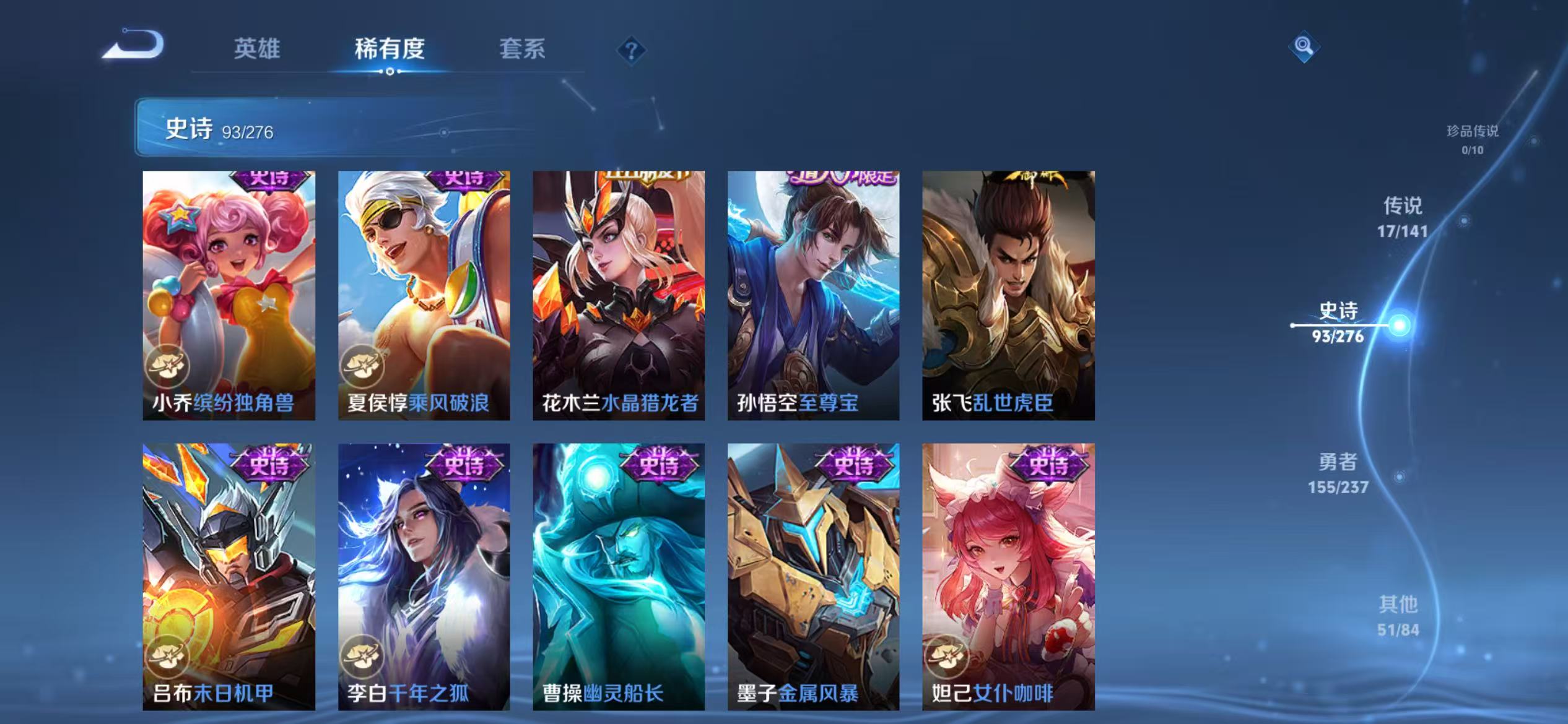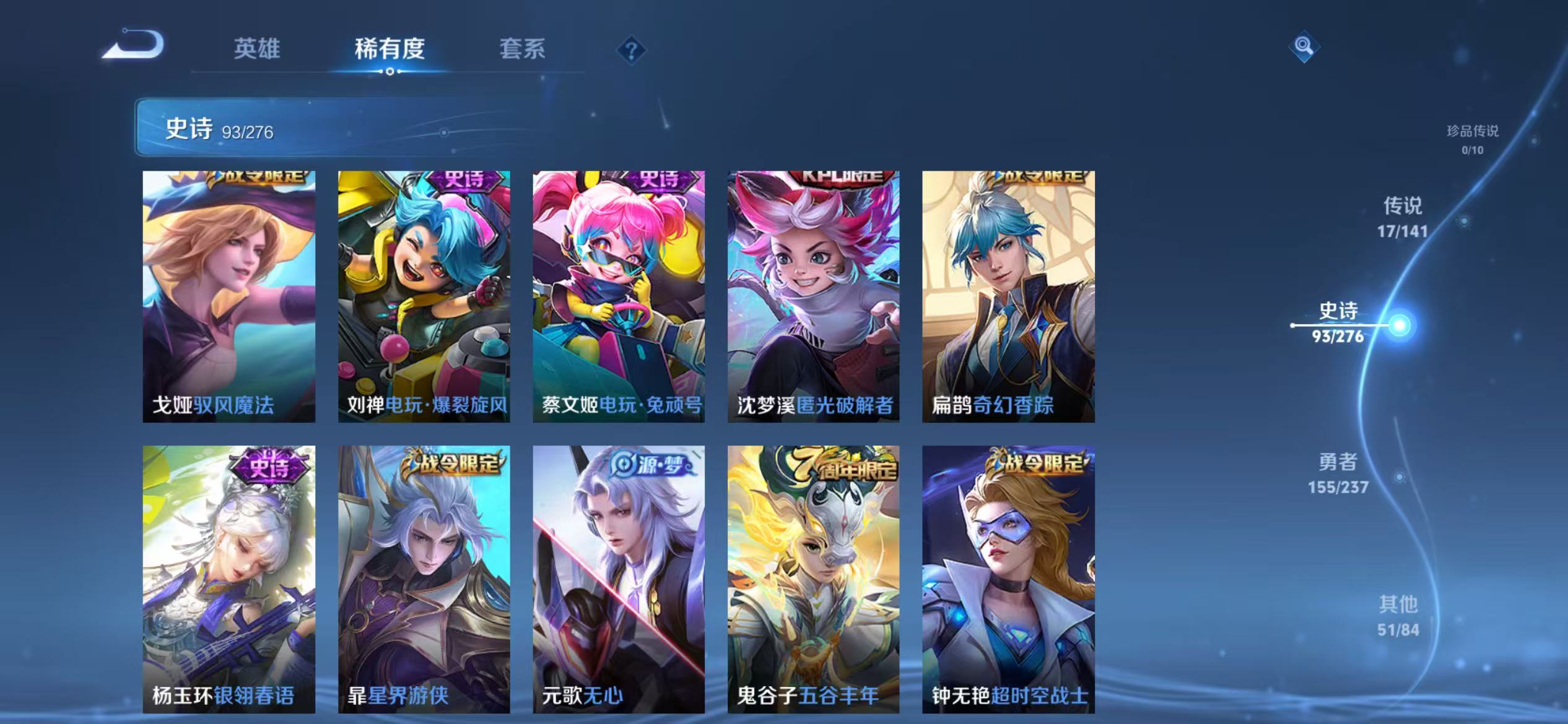 贵族等级:v8皮肤数:317传说品质17 生肖限定4 情人节限定2 荣耀典藏1 英雄数:128