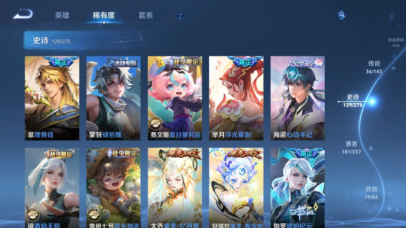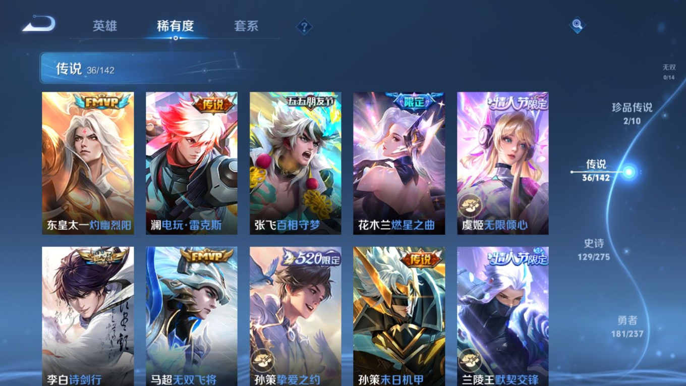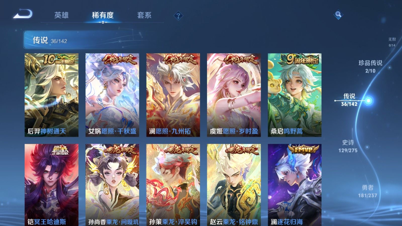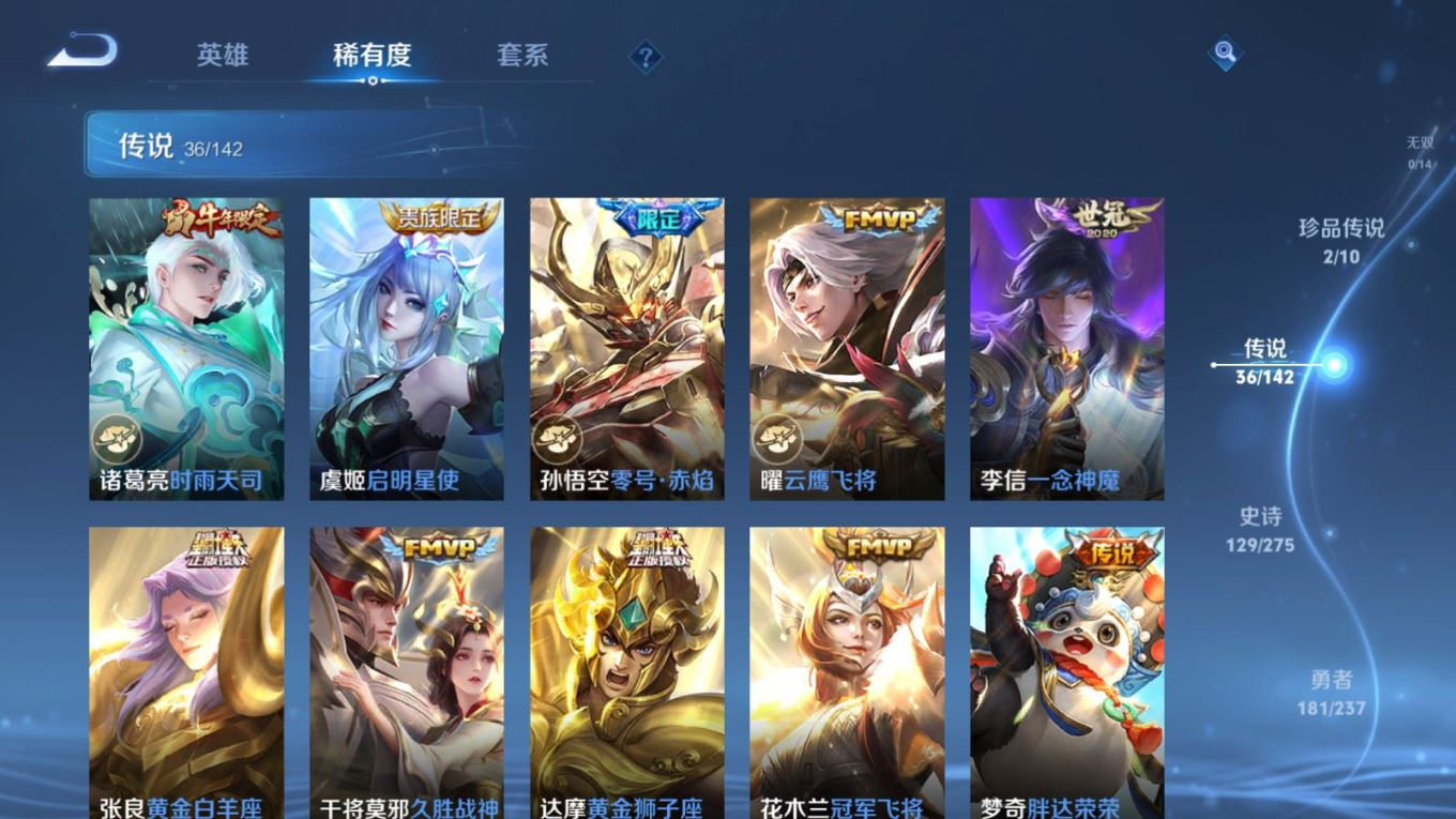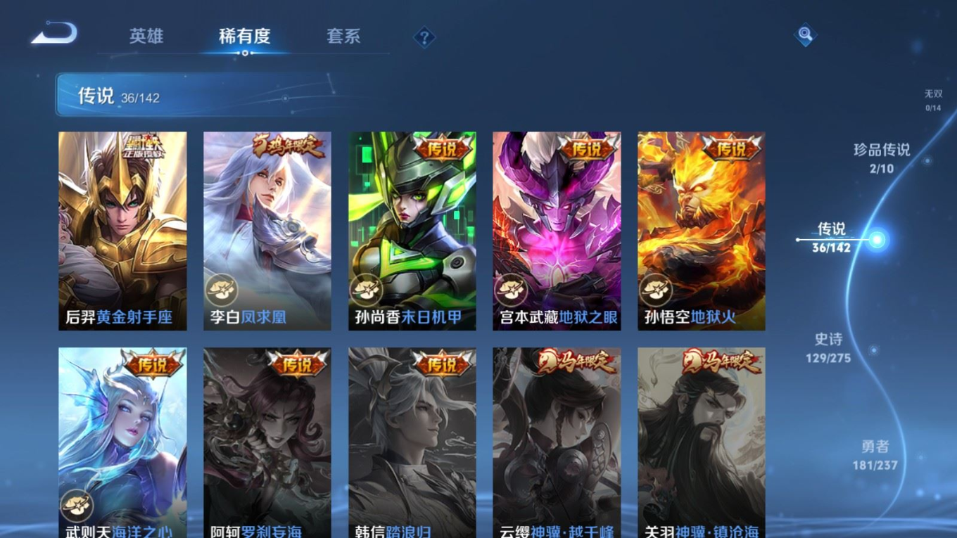 传说品质_后羿_黄金射手座传说品质_后羿_神树通天传说品质_澜_电玩·雷克斯传说品质_澜_逐花归海传说品质_澜_愿照·九州拓传说品质_诸葛亮_时雨天司传说品质_兰陵王_默契交锋传说品质_孙悟空_零号·赤焰传说品质_孙悟空_地狱火传说品质_马超_无双飞将传说品质_武则天_海洋之心传说品质_干将莫邪_久胜战神传说品质_宫本武藏_地狱之眼传说品质_花木兰_冠军飞将传说品质_花木兰_燃星之曲传说品质_李信_一念神魔传说品质_孙尚香_末日机甲传说品质_孙尚香_乘龙·问璇玑传说品质_梦奇_胖达荣荣传说品质_桑启_鸣野蒿传说品质_东皇太一_灼幽烈阳传说品质_张良_黄金白羊座传说品质_女娲_愿照·千秋盛传说品质_李白_凤求凰传说品质_李白_诗剑行传说品质_张飞_百相守梦传说品质_曜_云鹰飞将传说品质_孙策_末日机甲传说品质_孙策_挚爱之约传说品质_孙策_乘龙·淬吴钩传说品质_达摩_黄金狮子座传说品质_铠_冥王哈迪斯传说品质_虞姬_无限倾心传说品质_虞姬_愿照·岁时盈传说品质_虞姬_启明星使传说品质_赵云_乘龙·铭钟鼎