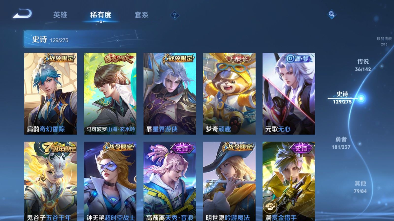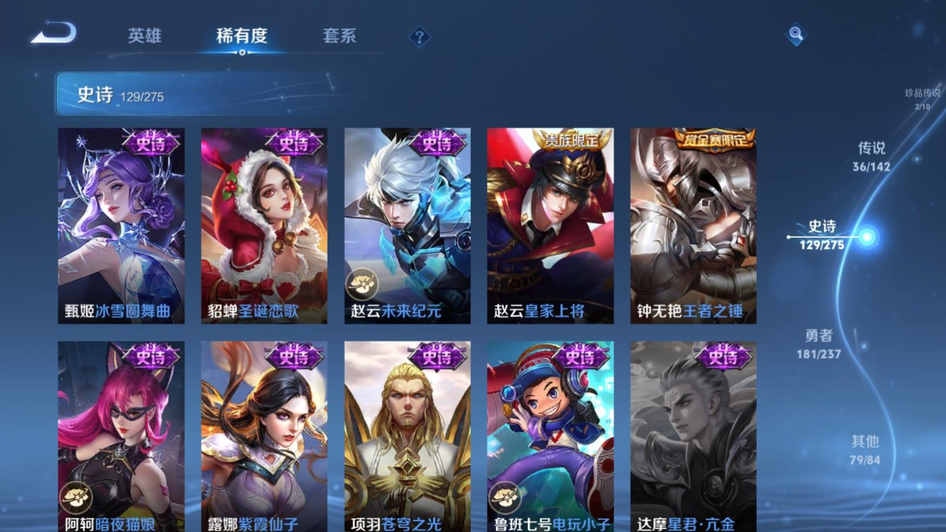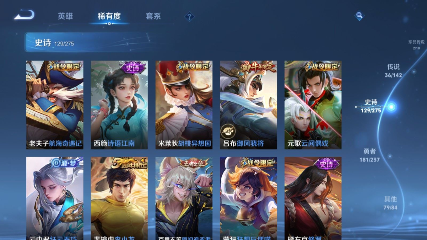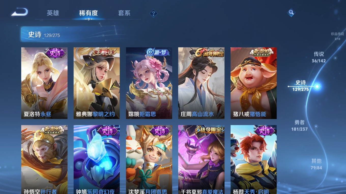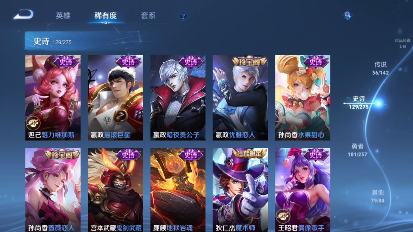 传说品质_后羿_黄金射手座传说品质_后羿_神树通天传说品质_澜_电玩·雷克斯传说品质_澜_逐花归海传说品质_澜_愿照·九州拓传说品质_诸葛亮_时雨天司传说品质_兰陵王_默契交锋传说品质_孙悟空_零号·赤焰传说品质_孙悟空_地狱火传说品质_马超_无双飞将传说品质_武则天_海洋之心传说品质_干将莫邪_久胜战神传说品质_宫本武藏_地狱之眼传说品质_花木兰_冠军飞将传说品质_花木兰_燃星之曲传说品质_李信_一念神魔传说品质_孙尚香_末日机甲传说品质_孙尚香_乘龙·问璇玑传说品质_梦奇_胖达荣荣传说品质_桑启_鸣野蒿传说品质_东皇太一_灼幽烈阳传说品质_张良_黄金白羊座传说品质_女娲_愿照·千秋盛传说品质_李白_凤求凰传说品质_李白_诗剑行传说品质_张飞_百相守梦传说品质_曜_云鹰飞将传说品质_孙策_末日机甲传说品质_孙策_挚爱之约传说品质_孙策_乘龙·淬吴钩传说品质_达摩_黄金狮子座传说品质_铠_冥王哈迪斯传说品质_虞姬_无限倾心传说品质_虞姬_愿照·岁时盈传说品质_虞姬_启明星使传说品质_赵云_乘龙·铭钟鼎