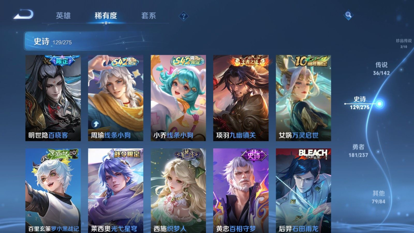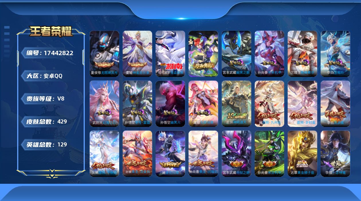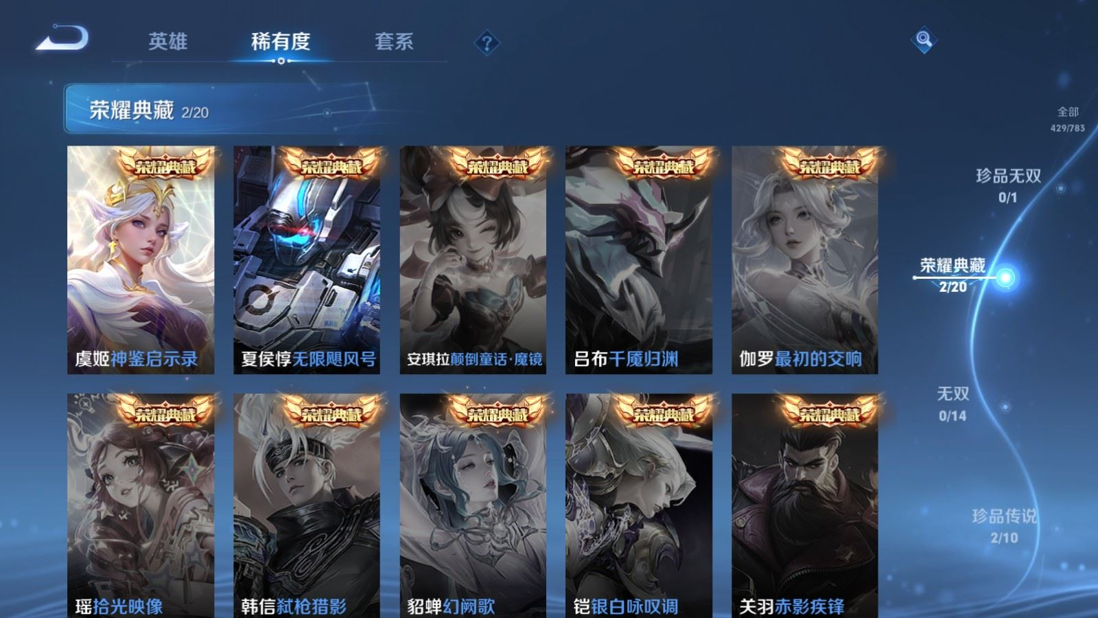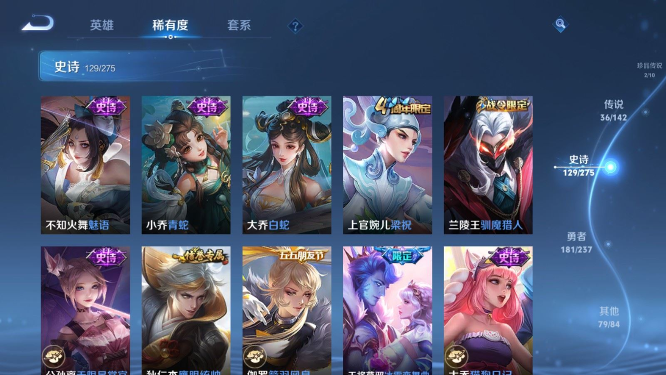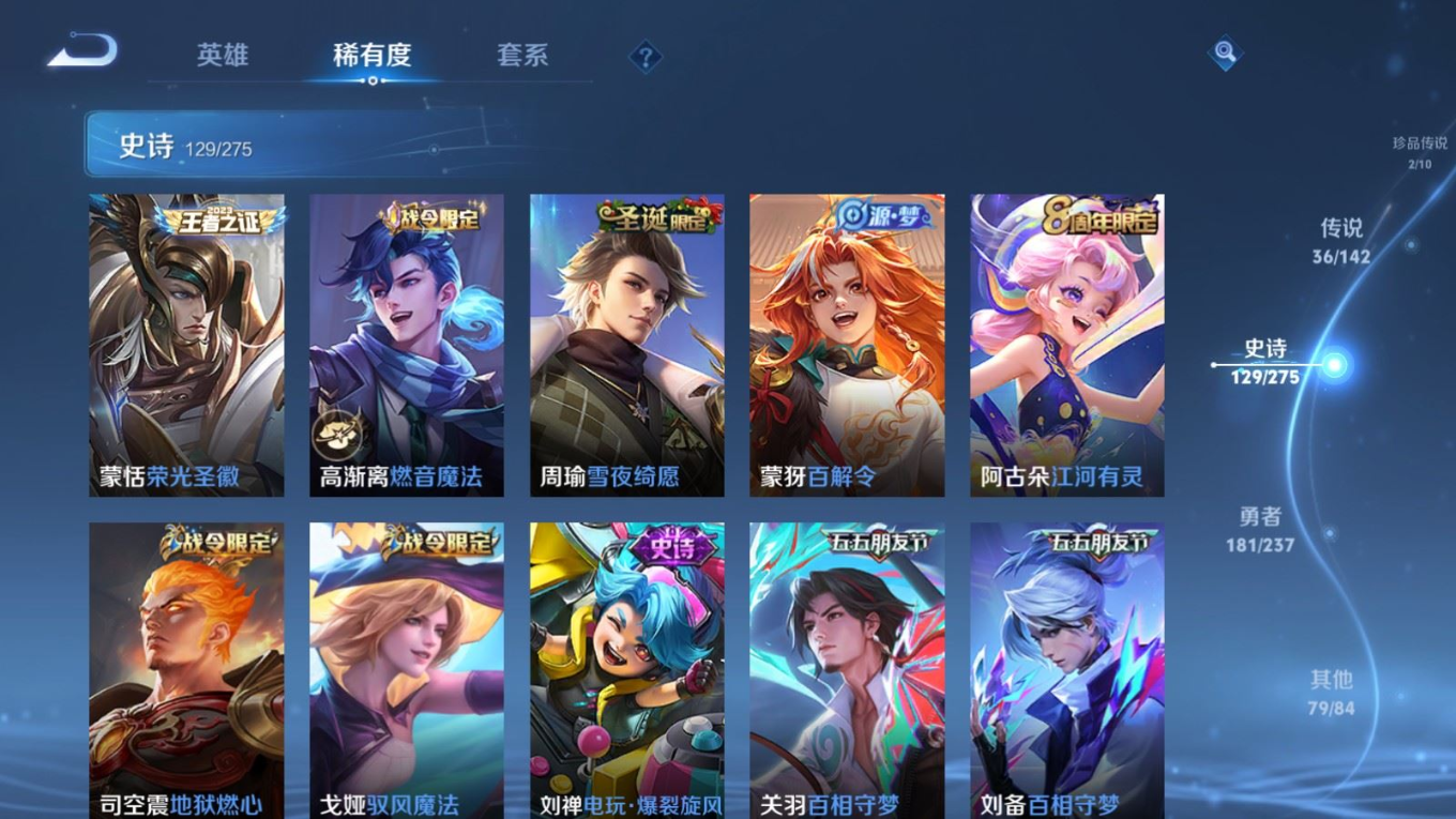 传说品质_后羿_黄金射手座传说品质_后羿_神树通天传说品质_澜_电玩·雷克斯传说品质_澜_逐花归海传说品质_澜_愿照·九州拓传说品质_诸葛亮_时雨天司传说品质_兰陵王_默契交锋传说品质_孙悟空_零号·赤焰传说品质_孙悟空_地狱火传说品质_马超_无双飞将传说品质_武则天_海洋之心传说品质_干将莫邪_久胜战神传说品质_宫本武藏_地狱之眼传说品质_花木兰_冠军飞将传说品质_花木兰_燃星之曲传说品质_李信_一念神魔传说品质_孙尚香_末日机甲传说品质_孙尚香_乘龙·问璇玑传说品质_梦奇_胖达荣荣传说品质_桑启_鸣野蒿传说品质_东皇太一_灼幽烈阳传说品质_张良_黄金白羊座传说品质_女娲_愿照·千秋盛传说品质_李白_凤求凰传说品质_李白_诗剑行传说品质_张飞_百相守梦传说品质_曜_云鹰飞将传说品质_孙策_末日机甲传说品质_孙策_挚爱之约传说品质_孙策_乘龙·淬吴钩传说品质_达摩_黄金狮子座传说品质_铠_冥王哈迪斯传说品质_虞姬_无限倾心传说品质_虞姬_愿照·岁时盈传说品质_虞姬_启明星使传说品质_赵云_乘龙·铭钟鼎
