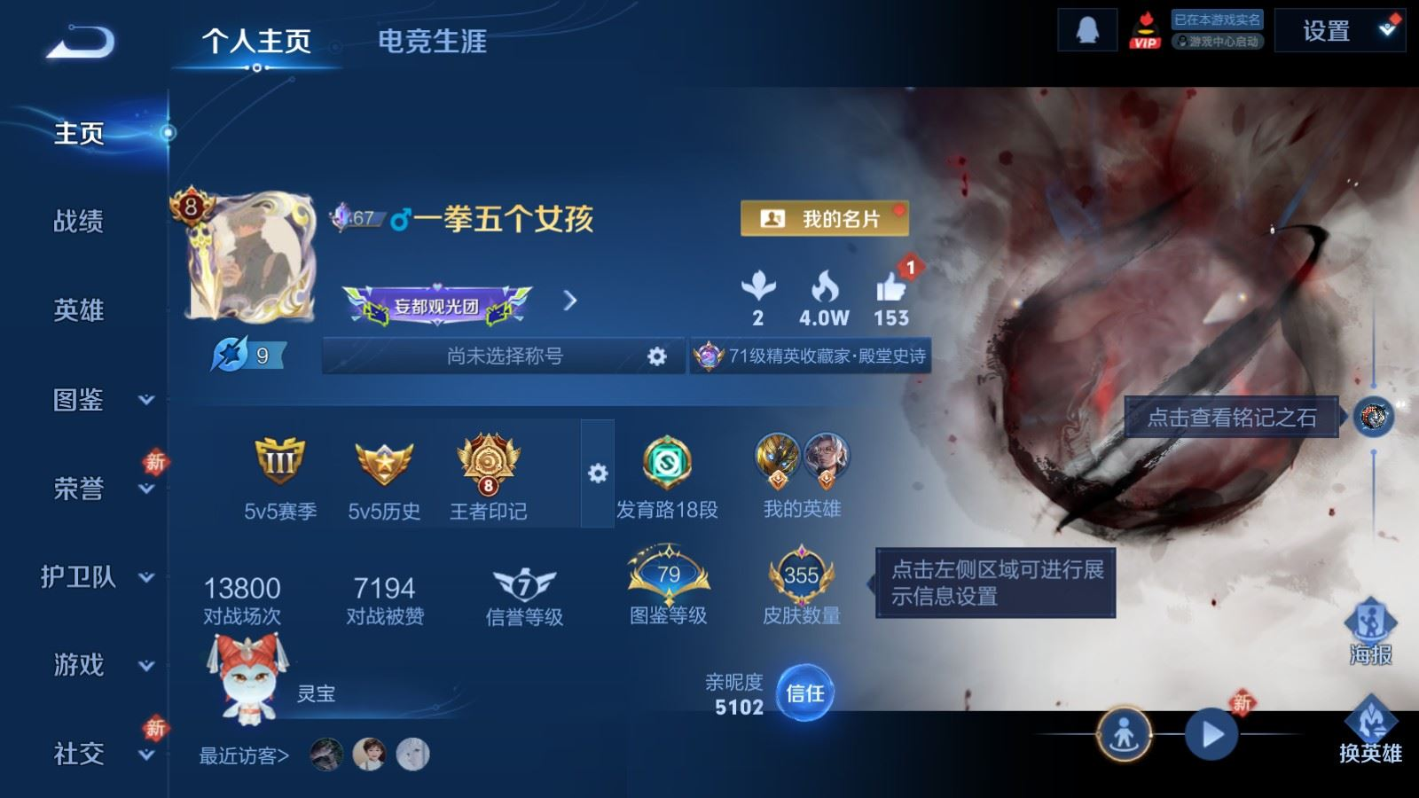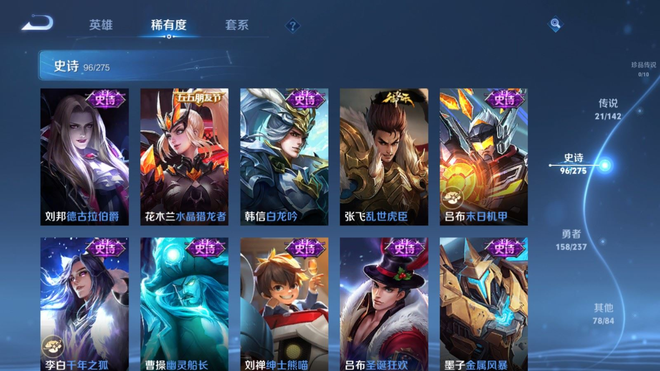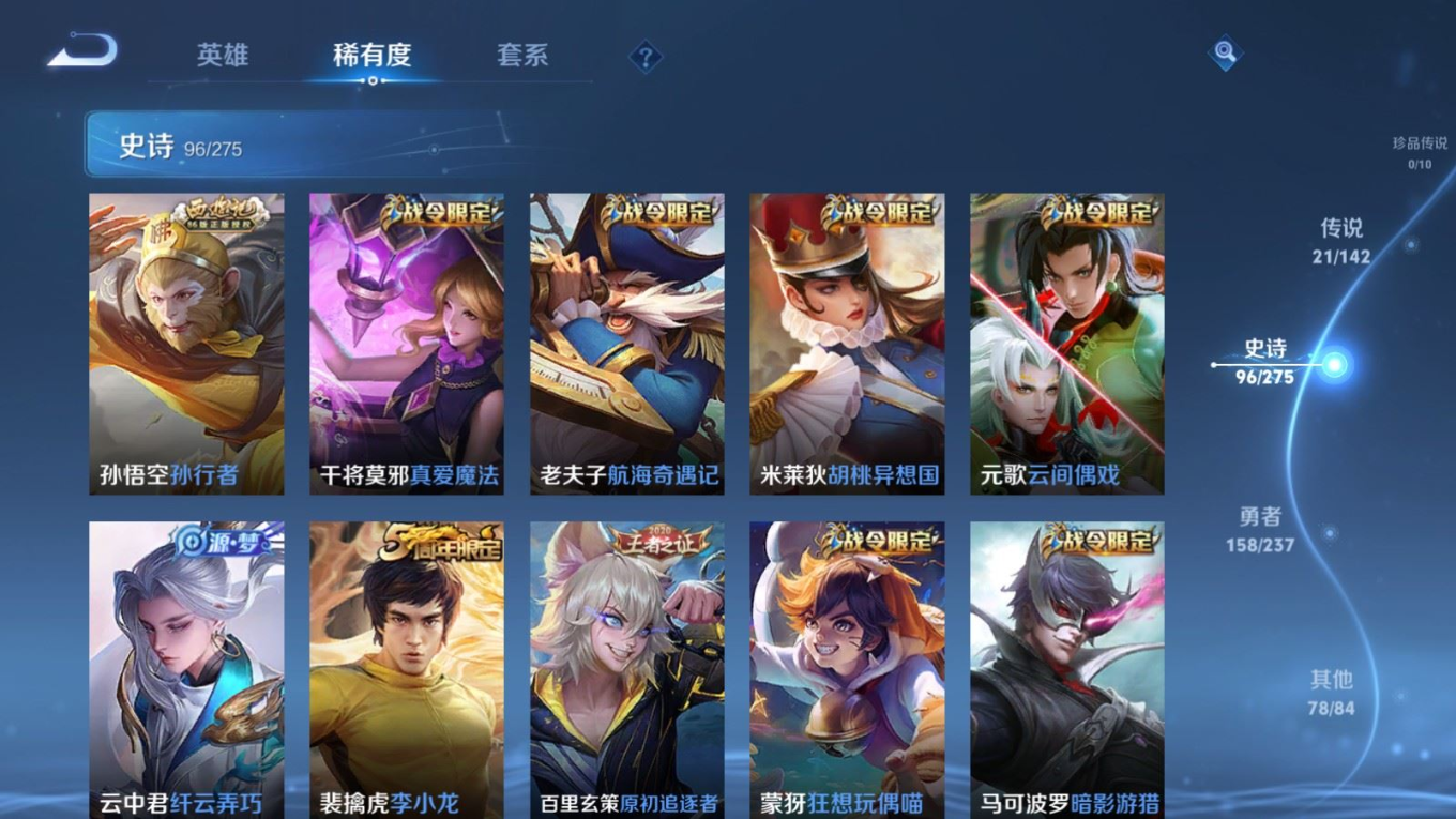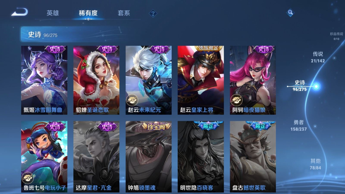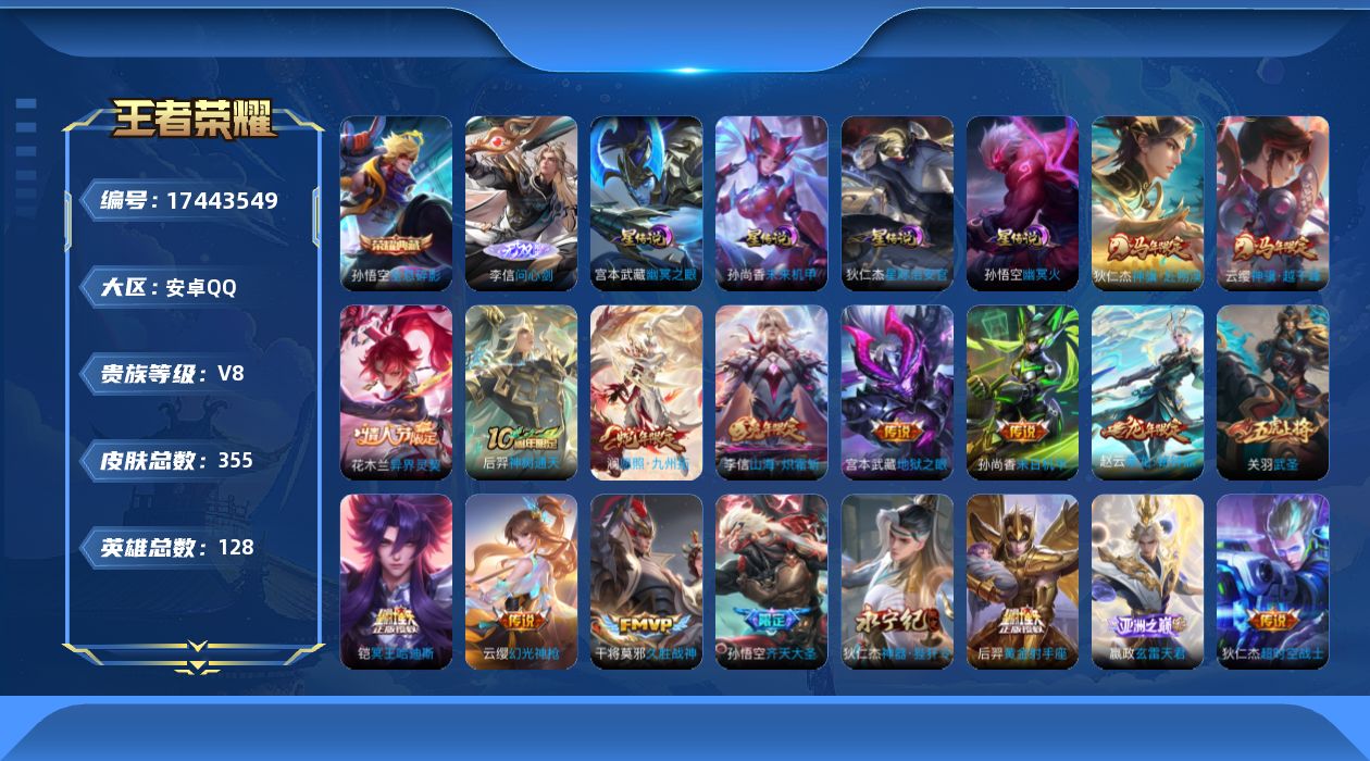 贵族等级:v8皮肤数:355传说品质21 生肖限定6 情人节限定2 荣耀典藏1 无双1 英雄数:128