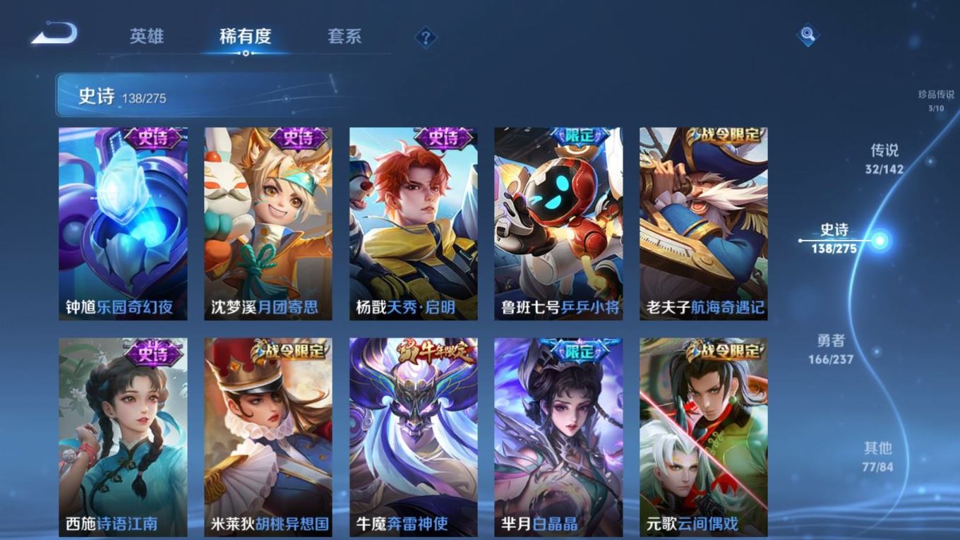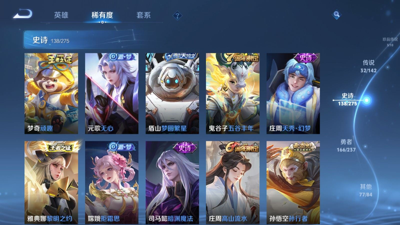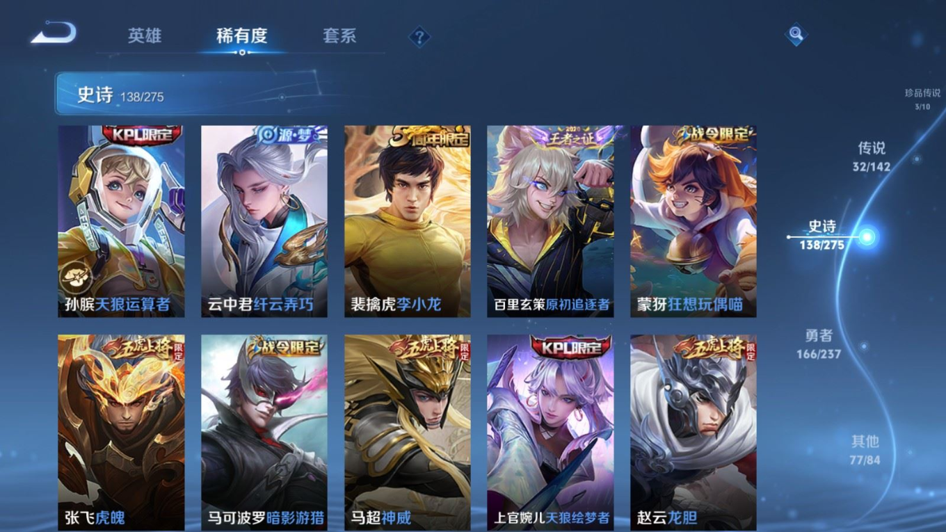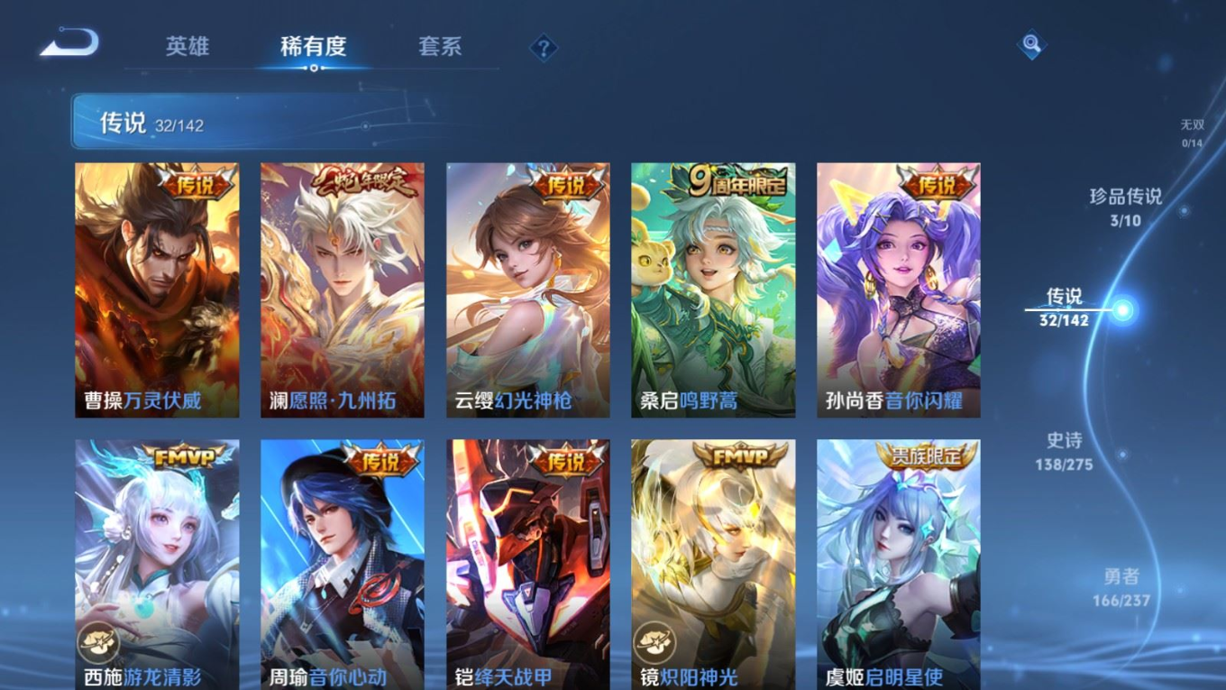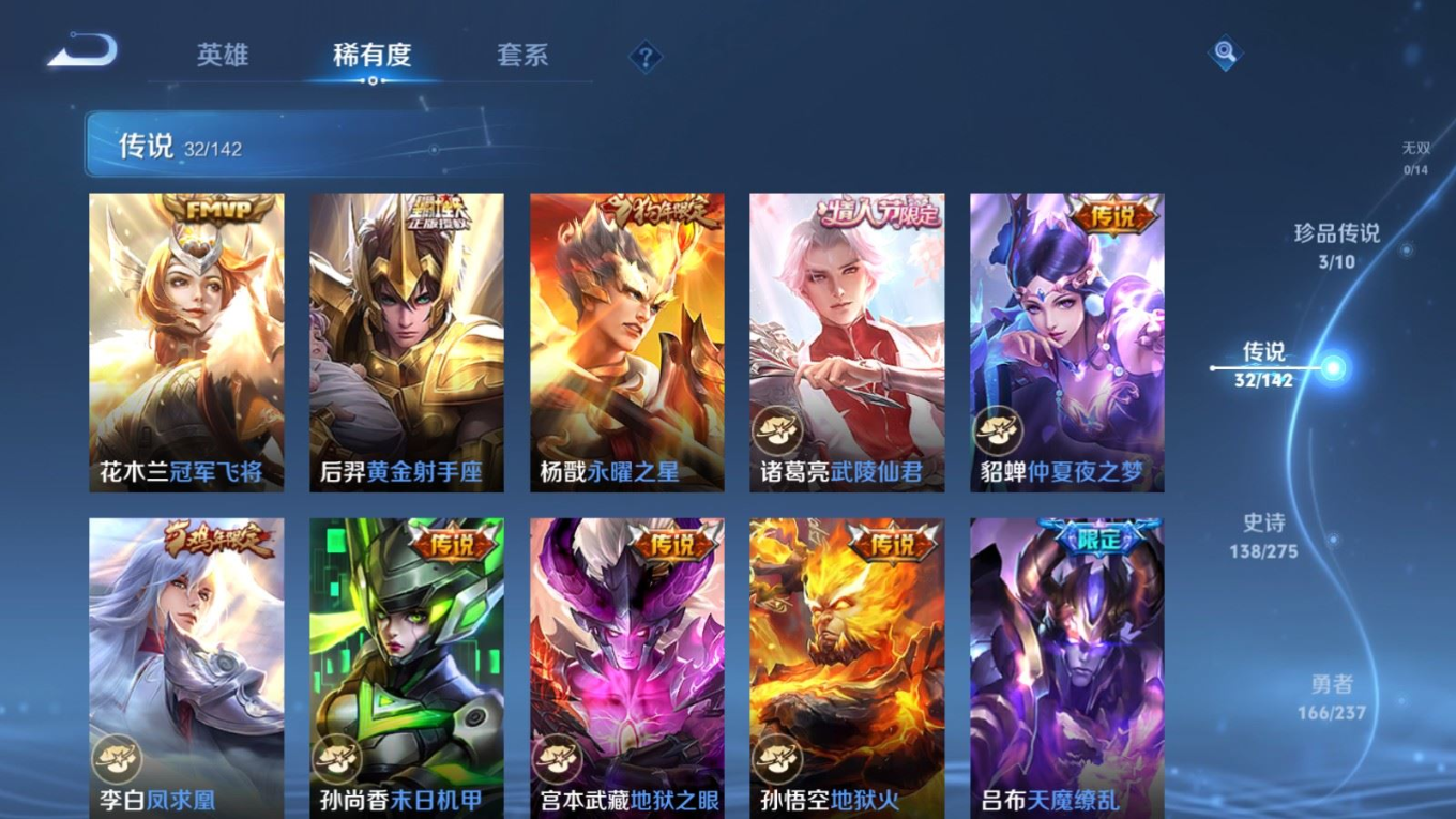 传说品质_后羿_黄金射手座传说品质_关羽_武圣传说品质_澜_愿照·九州拓传说品质_诸葛亮_武陵仙君传说品质_孙悟空_地狱火传说品质_吕布_天魔缭乱传说品质_武则天_海洋之心传说品质_杨戬_永曜之星传说品质_干将莫邪_久胜战神传说品质_宫本武藏_地狱之眼传说品质_西施_游龙清影传说品质_周瑜_音你心动传说品质_花木兰_冠军飞将传说品质_镜_炽阳神光传说品质_貂蝉_仲夏夜之梦传说品质_李信_一念神魔传说品质_孙尚香_末日机甲传说品质_孙尚香_音你闪耀传说品质_桑启_鸣野蒿传说品质_刘备_时之恋人传说品质_张良_黄金白羊座传说品质_云缨_幻光神枪传说品质_李白_凤求凰传说品质_曹操_万灵伏威传说品质_伽罗_太华传说品质_曜_云鹰飞将传说品质_狄仁杰_超时空战士传说品质_达摩_黄金狮子座传说品质_铠_绛天战甲传说品质_虞姬_云霓雀翎传说品质_虞姬_启明星使传说品质_百里玄策_白虎志
