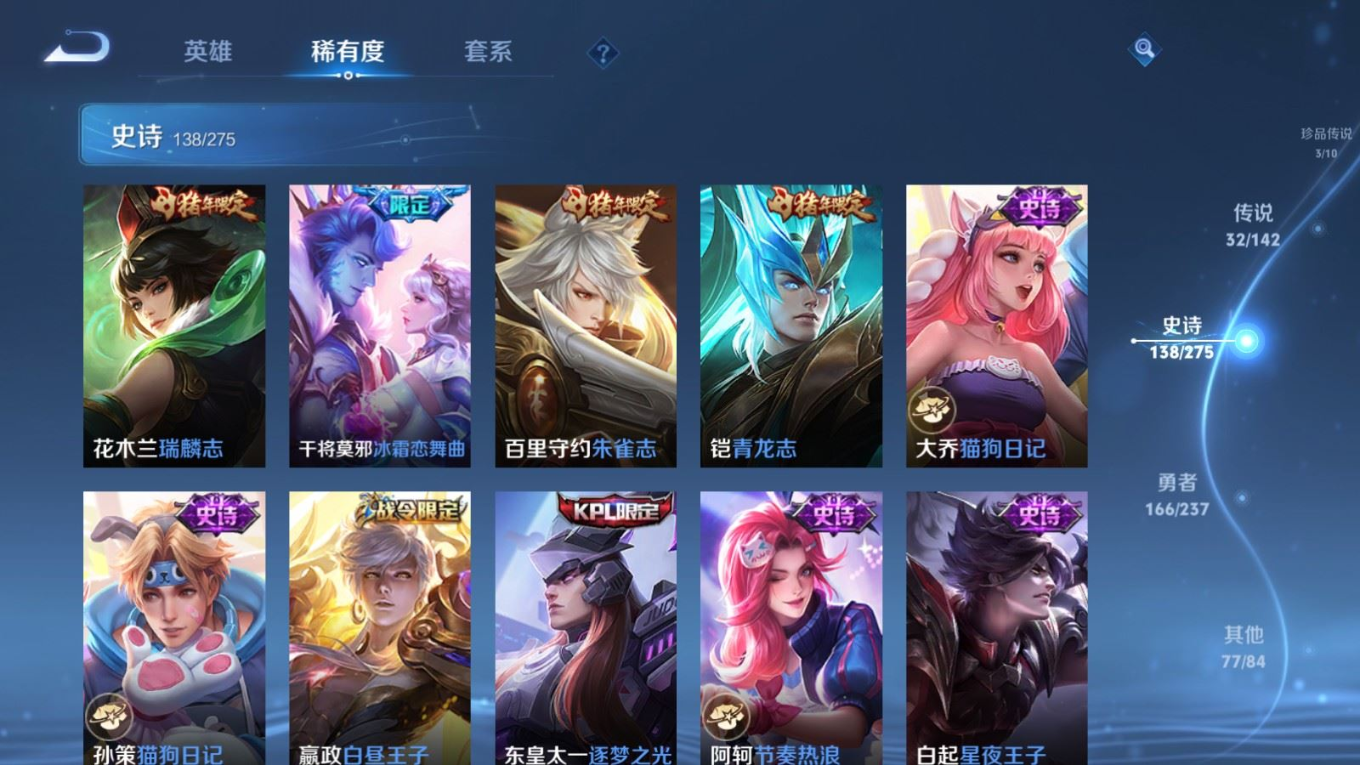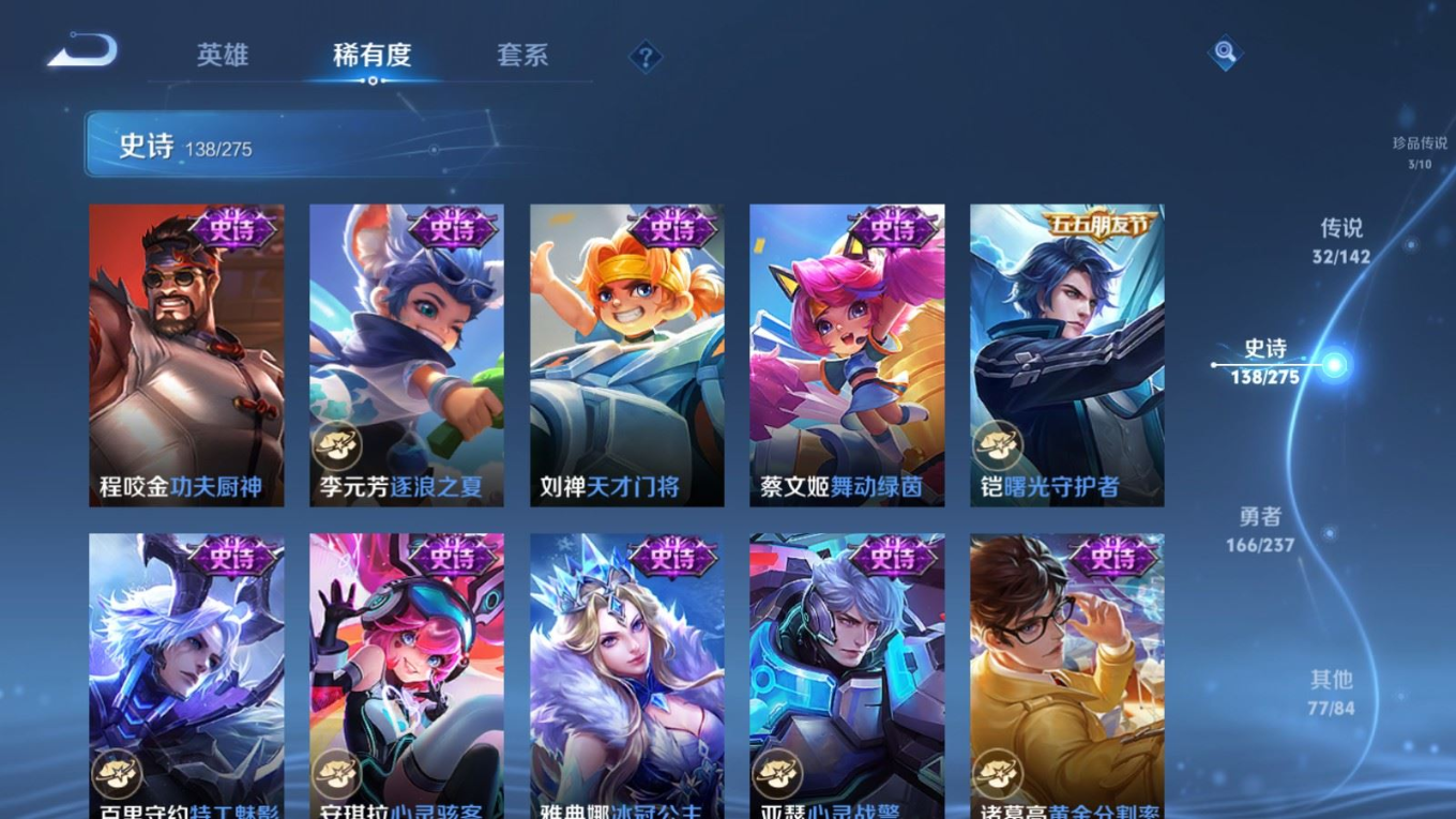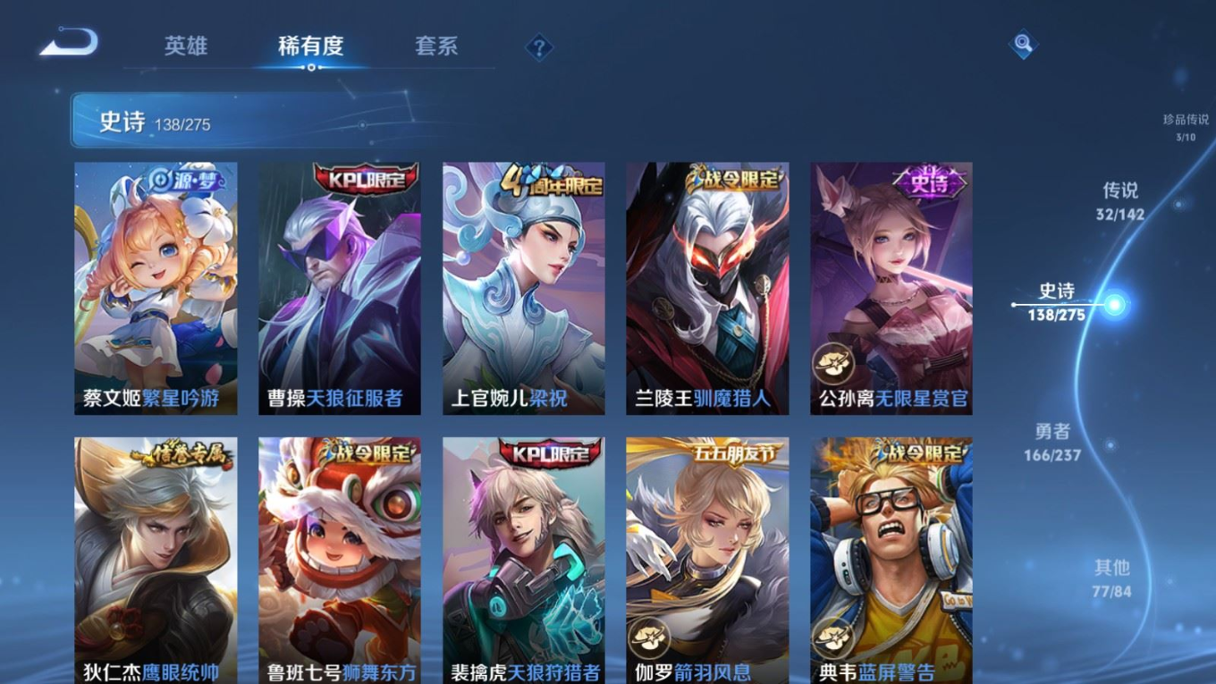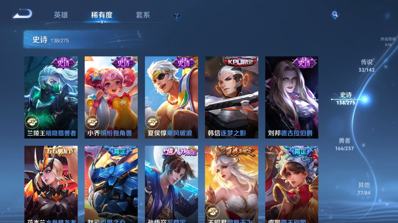 传说品质_后羿_黄金射手座传说品质_关羽_武圣传说品质_澜_愿照·九州拓传说品质_诸葛亮_武陵仙君传说品质_孙悟空_地狱火传说品质_吕布_天魔缭乱传说品质_武则天_海洋之心传说品质_杨戬_永曜之星传说品质_干将莫邪_久胜战神传说品质_宫本武藏_地狱之眼传说品质_西施_游龙清影传说品质_周瑜_音你心动传说品质_花木兰_冠军飞将传说品质_镜_炽阳神光传说品质_貂蝉_仲夏夜之梦传说品质_李信_一念神魔传说品质_孙尚香_末日机甲传说品质_孙尚香_音你闪耀传说品质_桑启_鸣野蒿传说品质_刘备_时之恋人传说品质_张良_黄金白羊座传说品质_云缨_幻光神枪传说品质_李白_凤求凰传说品质_曹操_万灵伏威传说品质_伽罗_太华传说品质_曜_云鹰飞将传说品质_狄仁杰_超时空战士传说品质_达摩_黄金狮子座传说品质_铠_绛天战甲传说品质_虞姬_云霓雀翎传说品质_虞姬_启明星使传说品质_百里玄策_白虎志