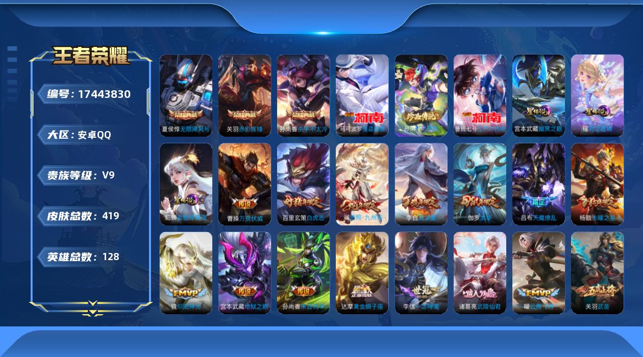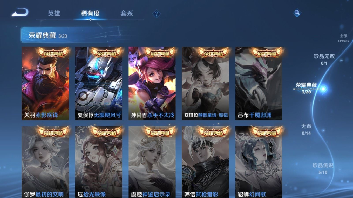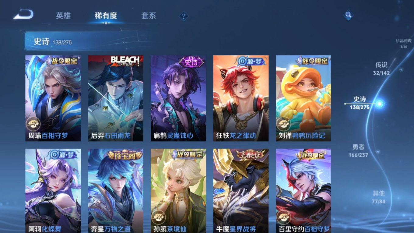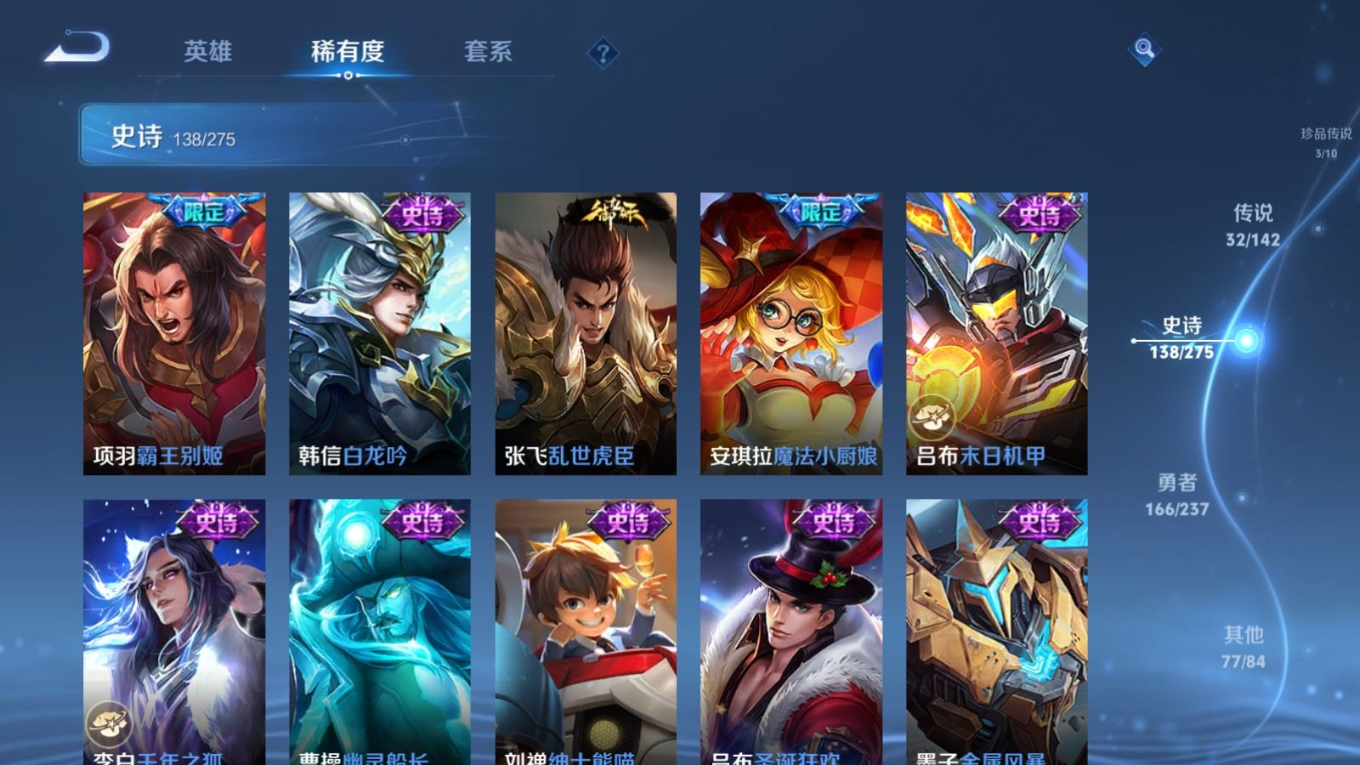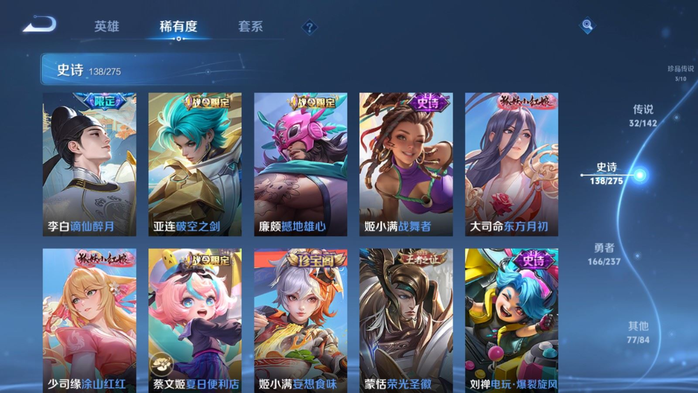 传说品质_后羿_黄金射手座传说品质_关羽_武圣传说品质_澜_愿照·九州拓传说品质_诸葛亮_武陵仙君传说品质_孙悟空_地狱火传说品质_吕布_天魔缭乱传说品质_武则天_海洋之心传说品质_杨戬_永曜之星传说品质_干将莫邪_久胜战神传说品质_宫本武藏_地狱之眼传说品质_西施_游龙清影传说品质_周瑜_音你心动传说品质_花木兰_冠军飞将传说品质_镜_炽阳神光传说品质_貂蝉_仲夏夜之梦传说品质_李信_一念神魔传说品质_孙尚香_末日机甲传说品质_孙尚香_音你闪耀传说品质_桑启_鸣野蒿传说品质_刘备_时之恋人传说品质_张良_黄金白羊座传说品质_云缨_幻光神枪传说品质_李白_凤求凰传说品质_曹操_万灵伏威传说品质_伽罗_太华传说品质_曜_云鹰飞将传说品质_狄仁杰_超时空战士传说品质_达摩_黄金狮子座传说品质_铠_绛天战甲传说品质_虞姬_云霓雀翎传说品质_虞姬_启明星使传说品质_百里玄策_白虎志