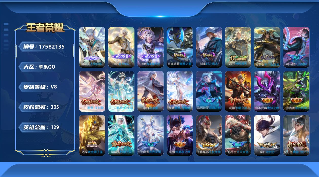 传说品质_后羿_无尽星芒传说品质_后羿_神树通天传说品质_诸葛亮_时雨天司传说品质_孙悟空_齐天大圣传说品质_孙悟空_地狱火传说品质_吕布_怒海麟威传说品质_武则天_海洋之心传说品质_杨戬_永曜之星传说品质_干将莫邪_久胜战神传说品质_宫本武藏_地狱之眼传说品质_貂蝉_仲夏夜之梦传说品质_孙尚香_末日机甲传说品质_孙尚香_音你闪耀传说品质_孙尚香_异界灵契传说品质_小乔_音你心动传说品质_司马懿_九山相柳传说品质_刘备_时之恋人传说品质_女娲_愿照·千秋盛传说品质_马可波罗_深海之息传说品质_妲己_愿照·众生和传说品质_李白_凤求凰传说品质_李白_诗剑行传说品质_大司命_死亡执政官传说品质_孙策_挚爱之约传说品质_狄仁杰_神器·狴犴令传说品质_达摩_黄金狮子座传说品质_虞姬_云霓雀翎传说品质_虞姬_愿照·岁时盈传说品质_虞姬_启明星使传说品质_李元芳_飞鸢探春