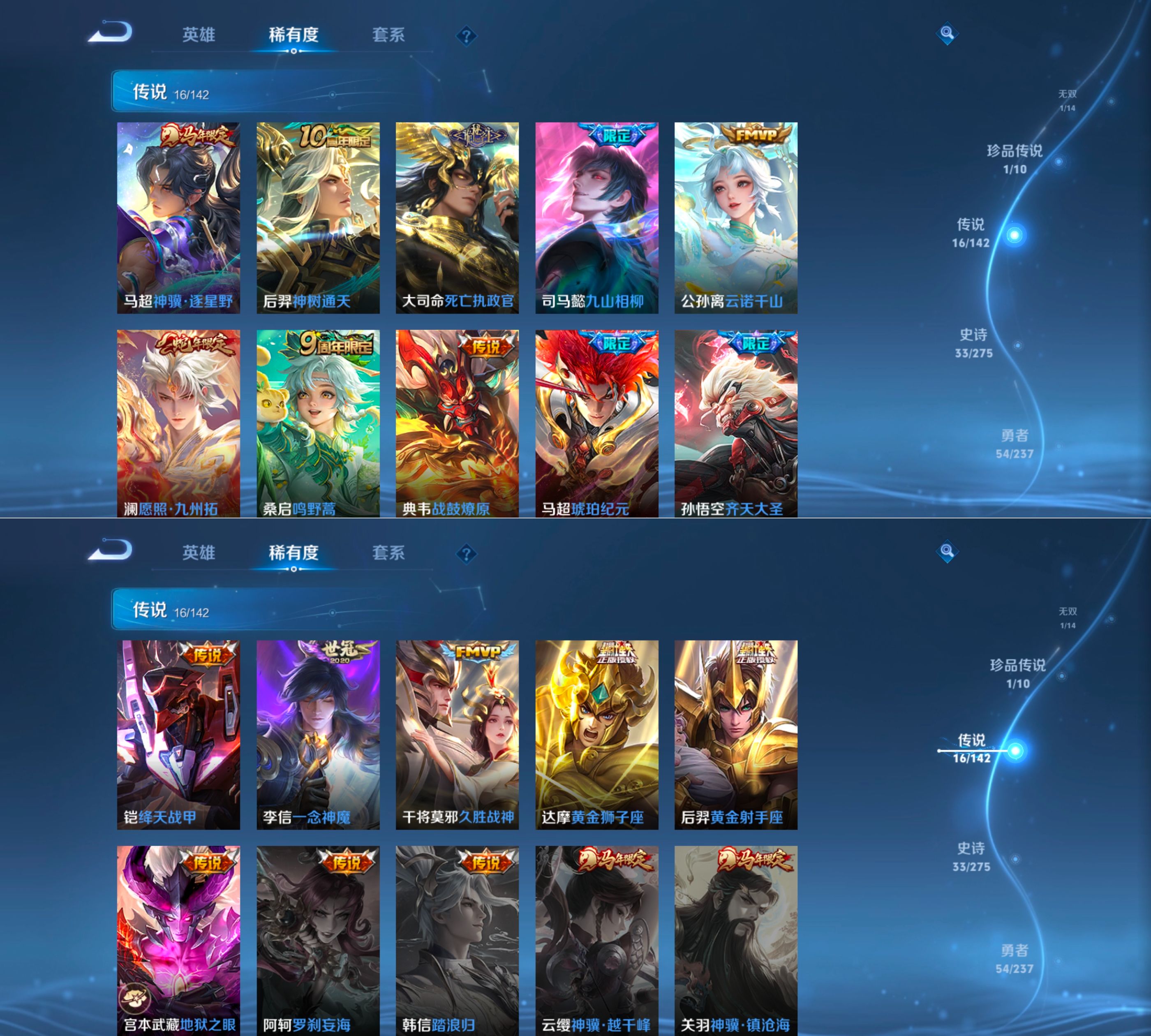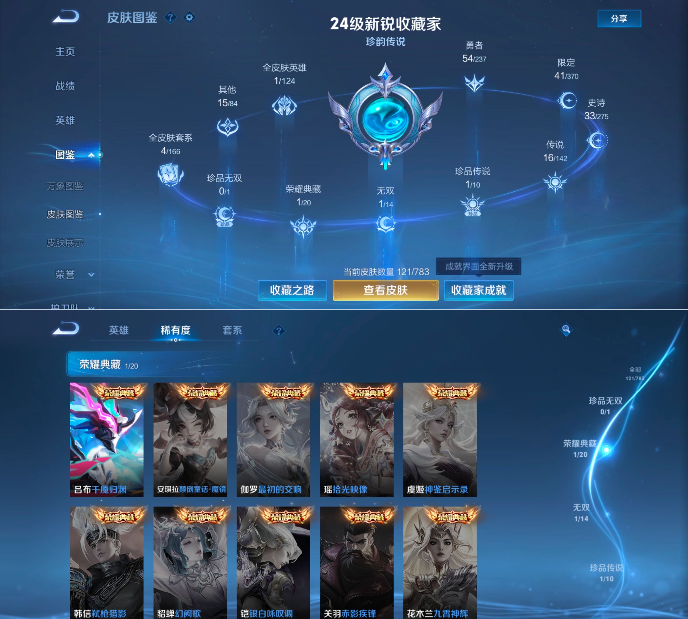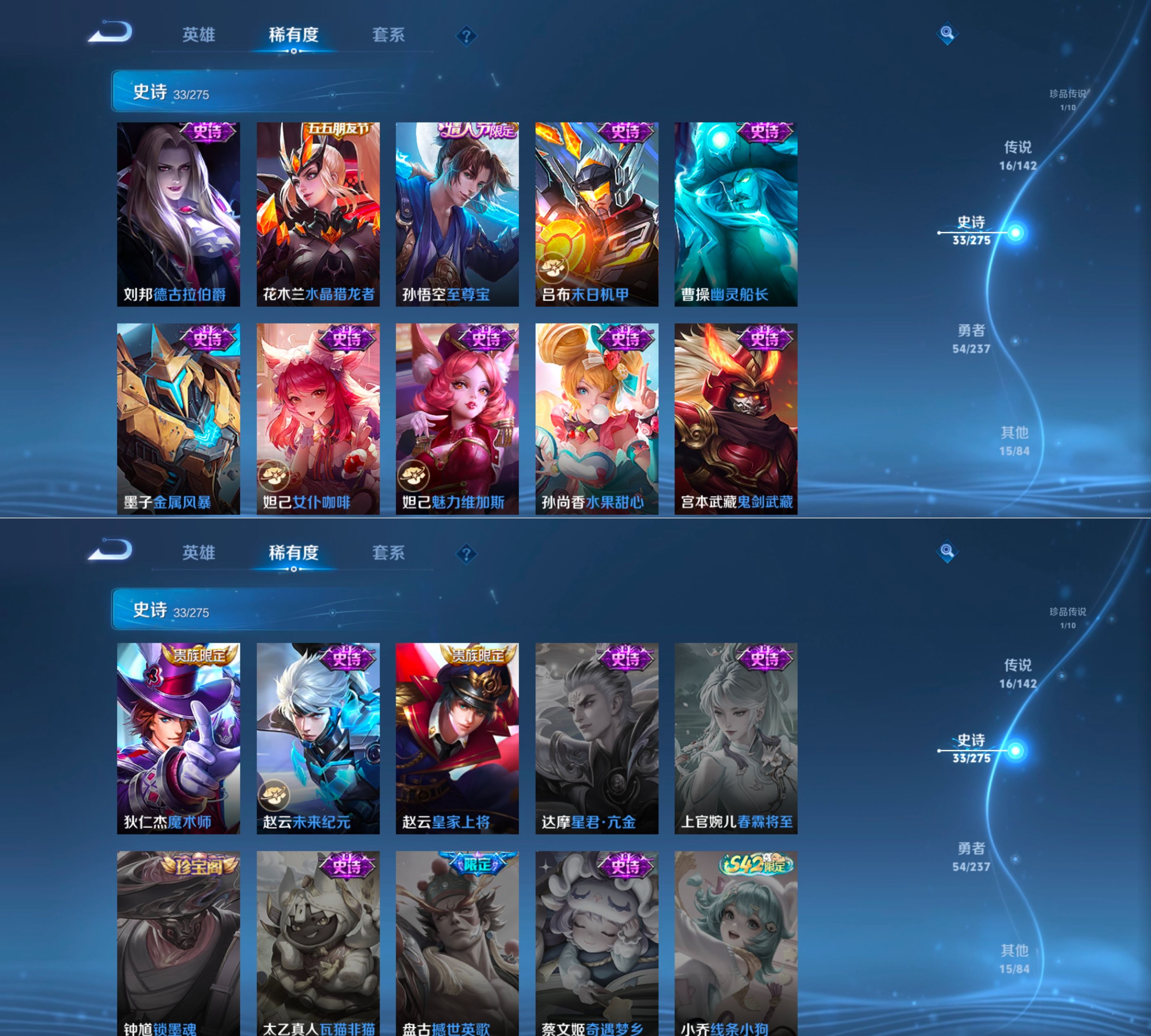 贵族等级:v7皮肤数:122传说品质16 生肖限定2 情人节限定1 荣耀典藏1 无双1 珍品传说1 英雄数:125