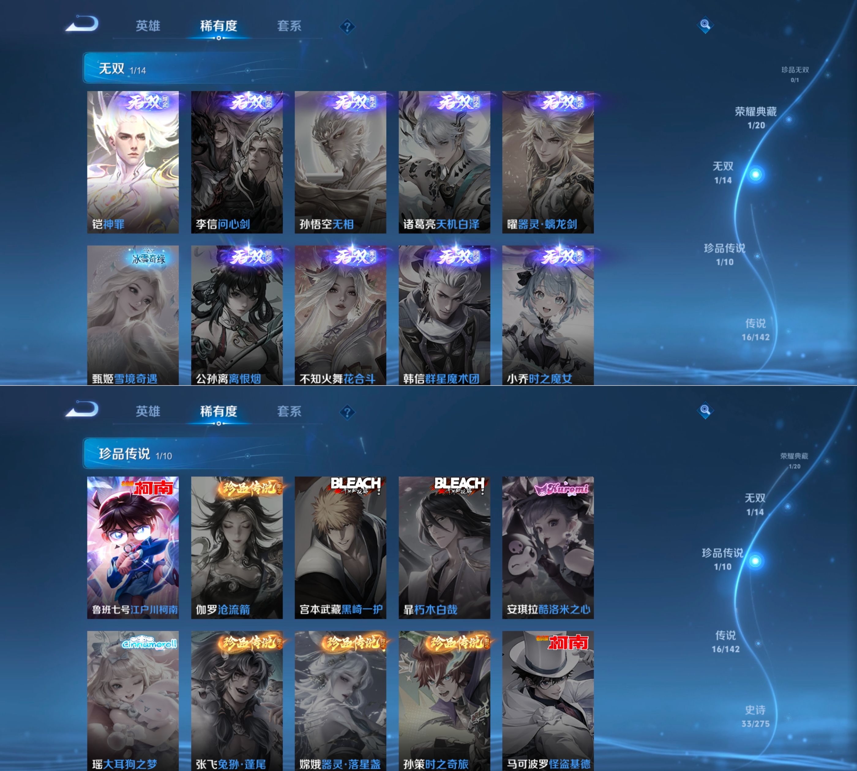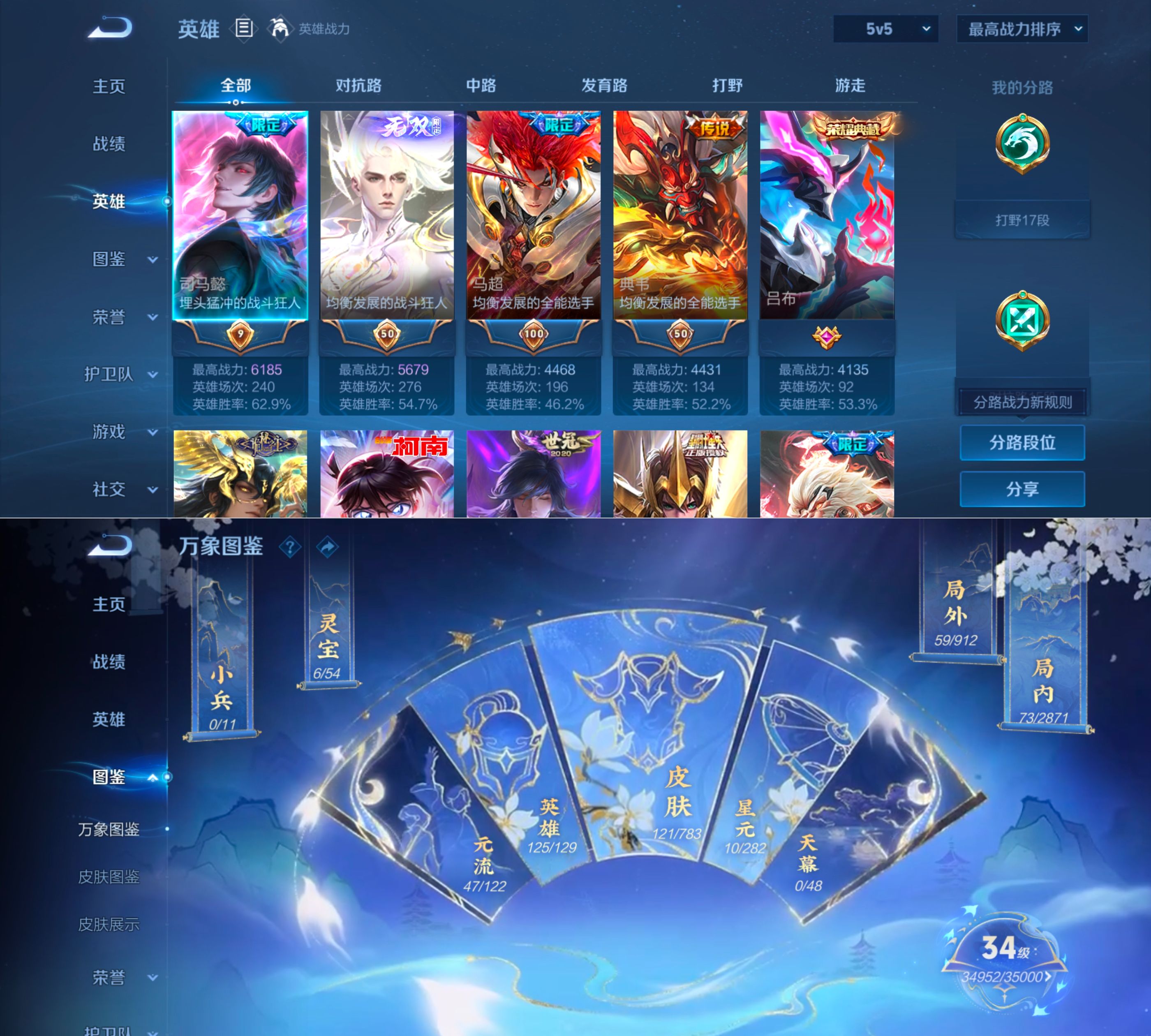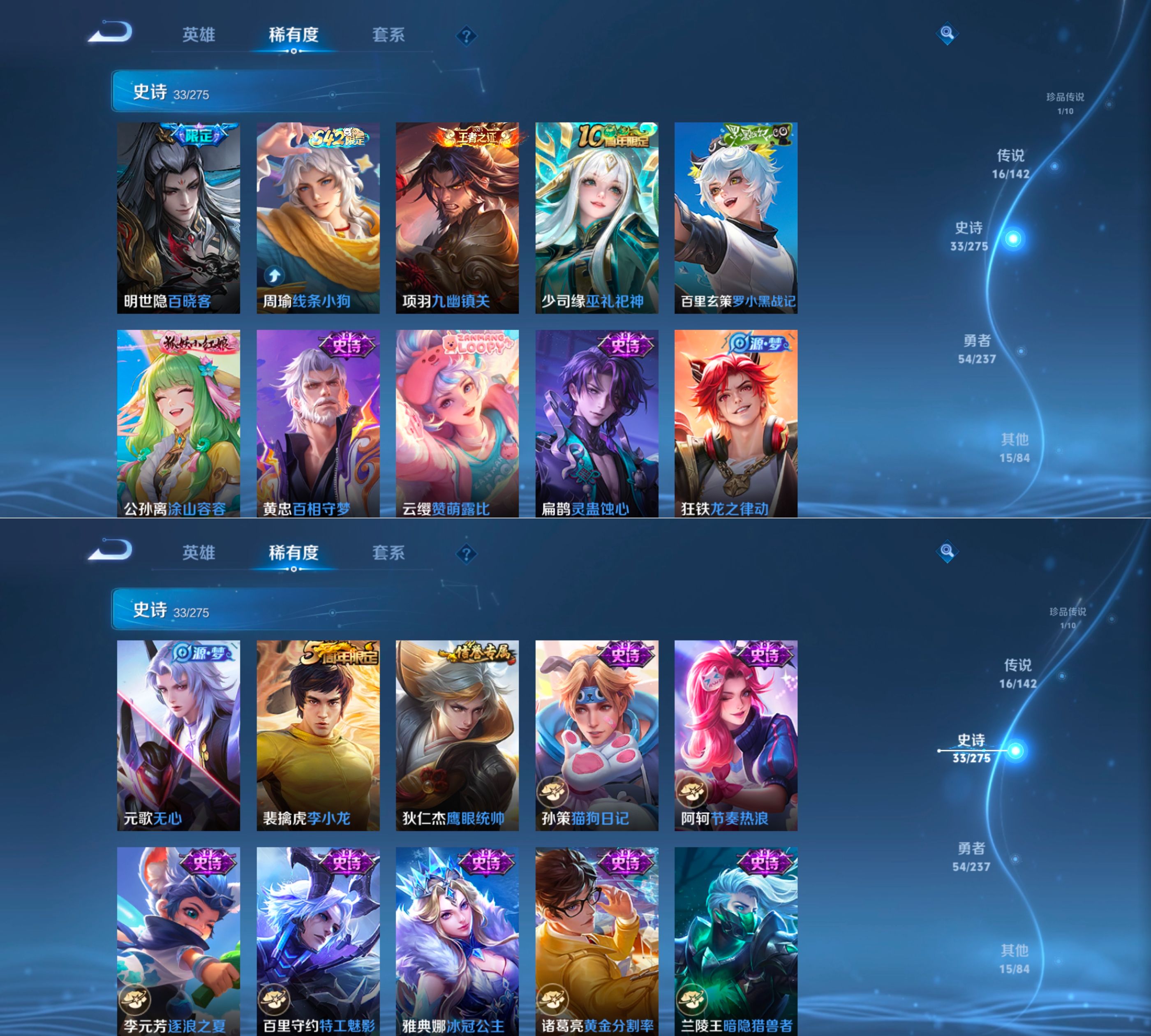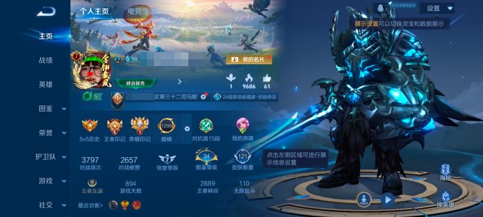 贵族等级:v7皮肤数:122传说品质16 生肖限定2 情人节限定1 荣耀典藏1 无双1 珍品传说1 英雄数:125