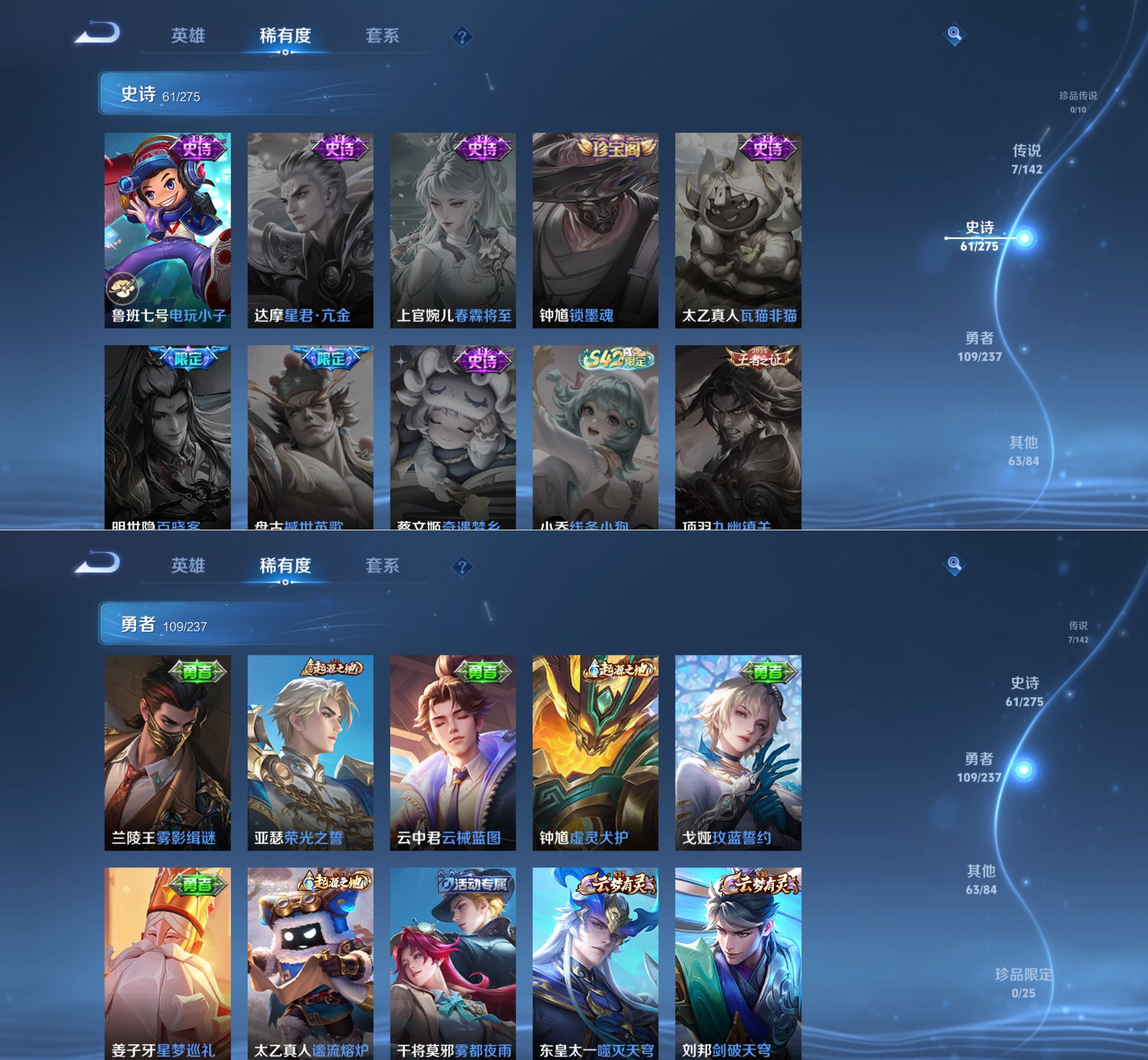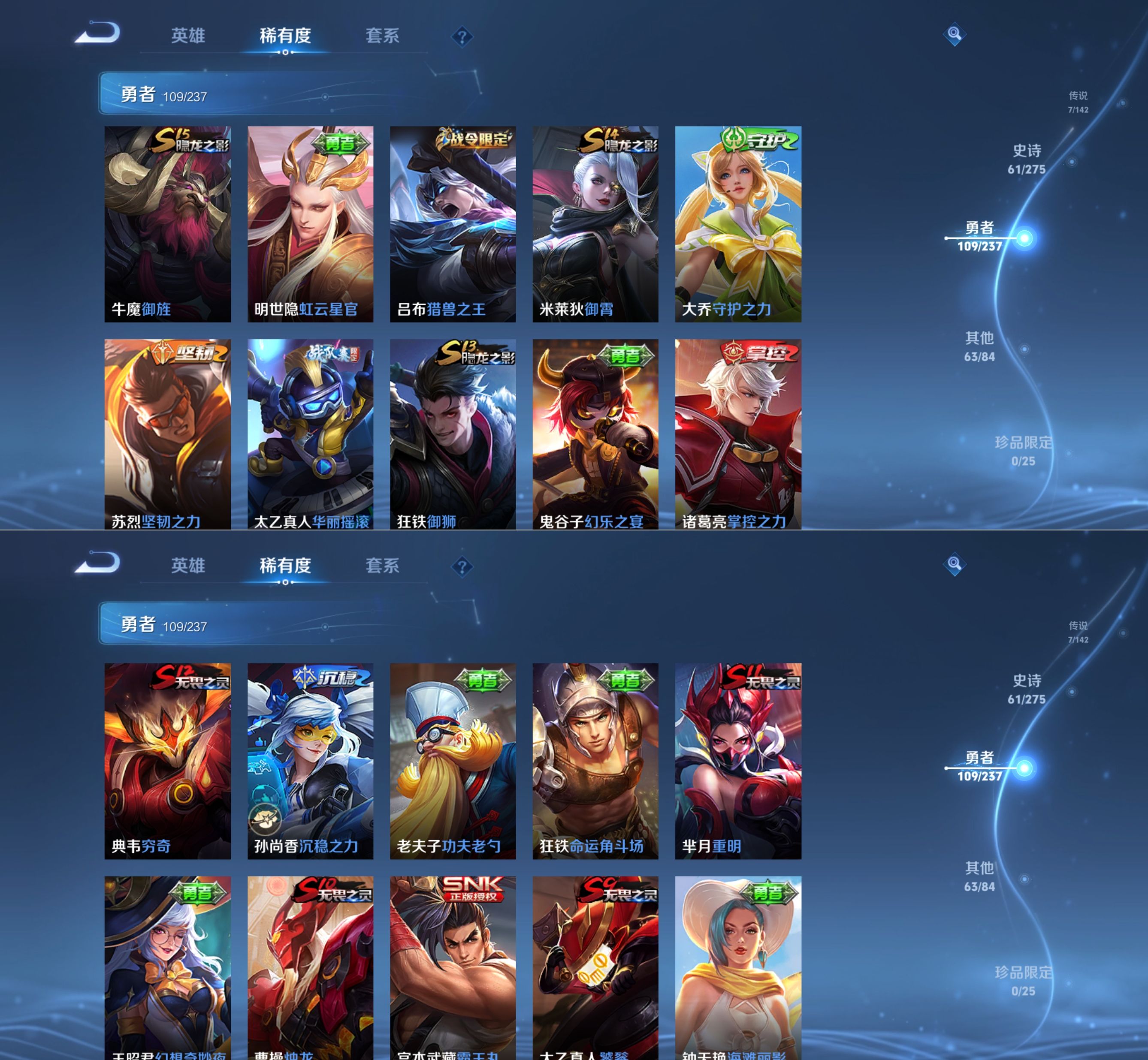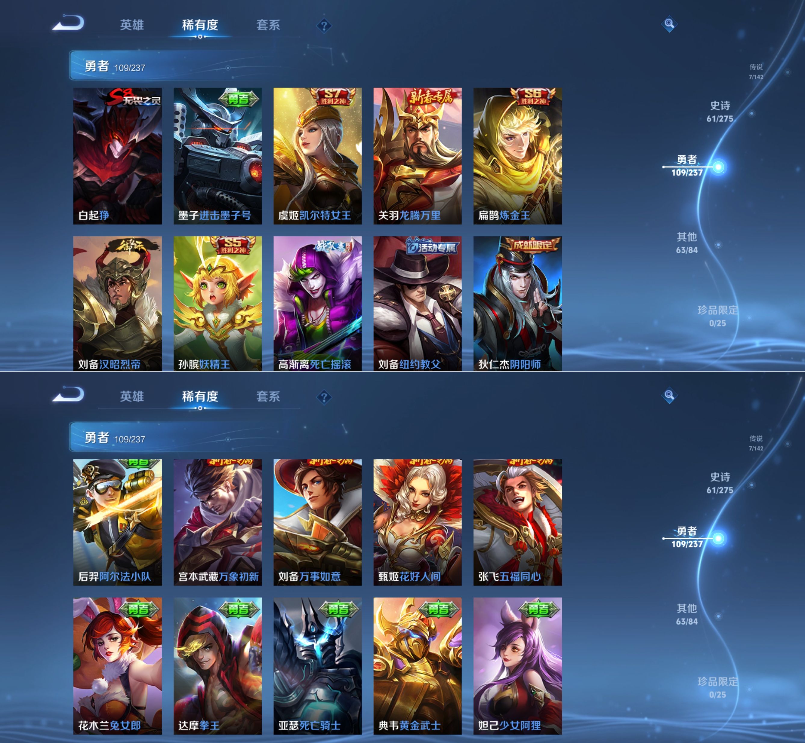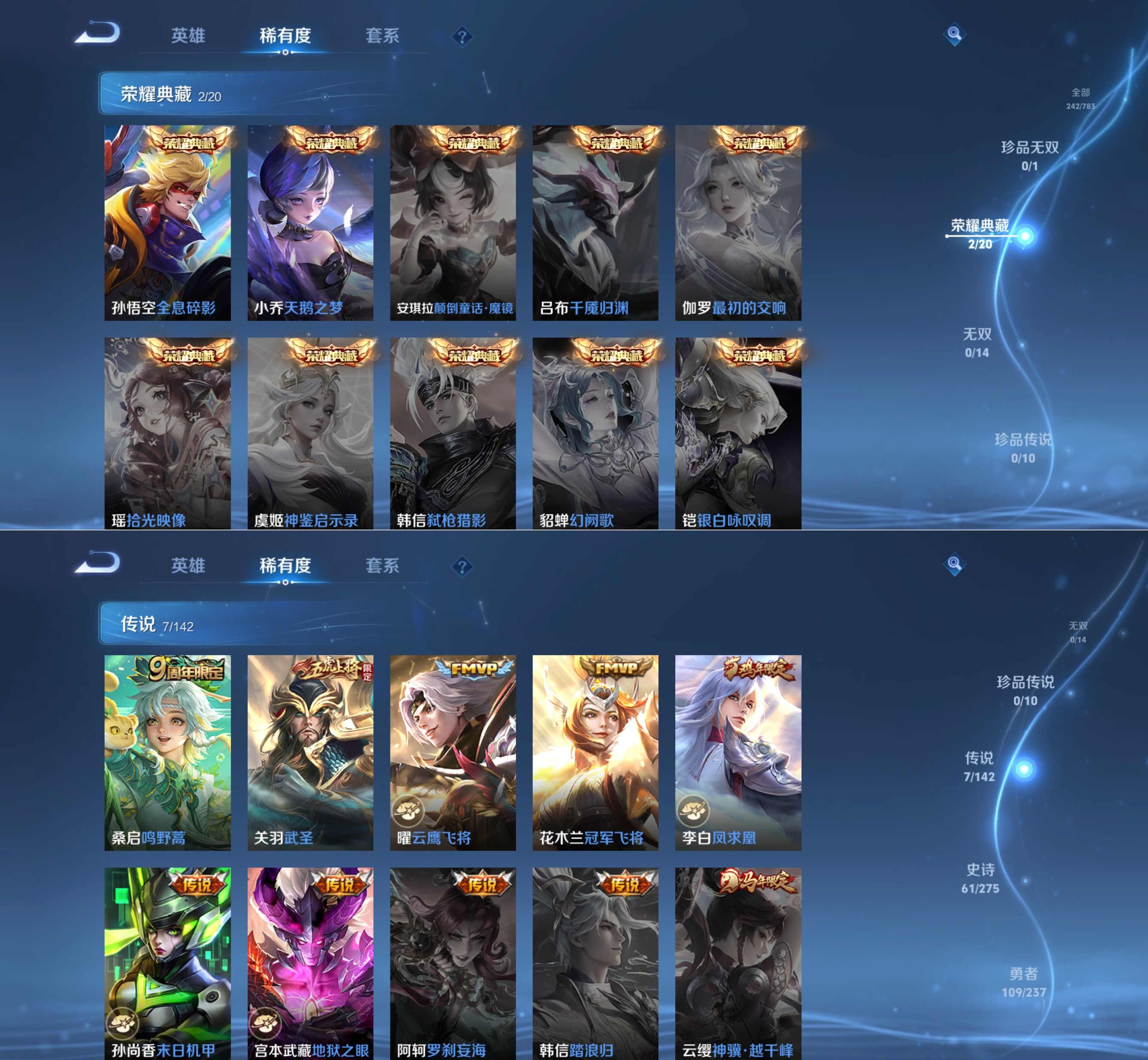贵族等级:v7皮肤数:242传说品质7 情人节限定1 荣耀典藏2 生肖限定1 英雄数:127
