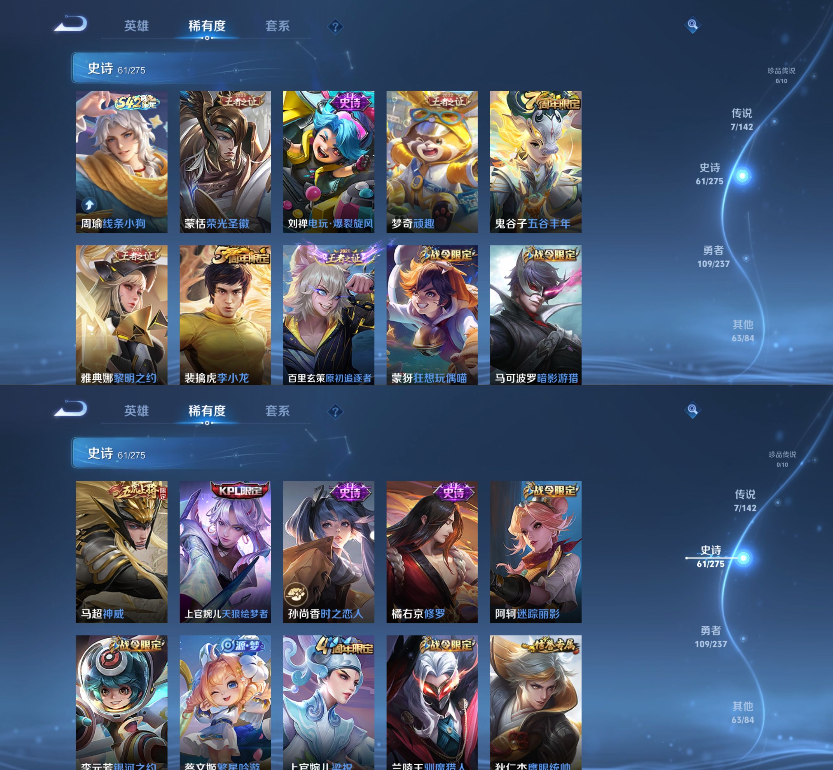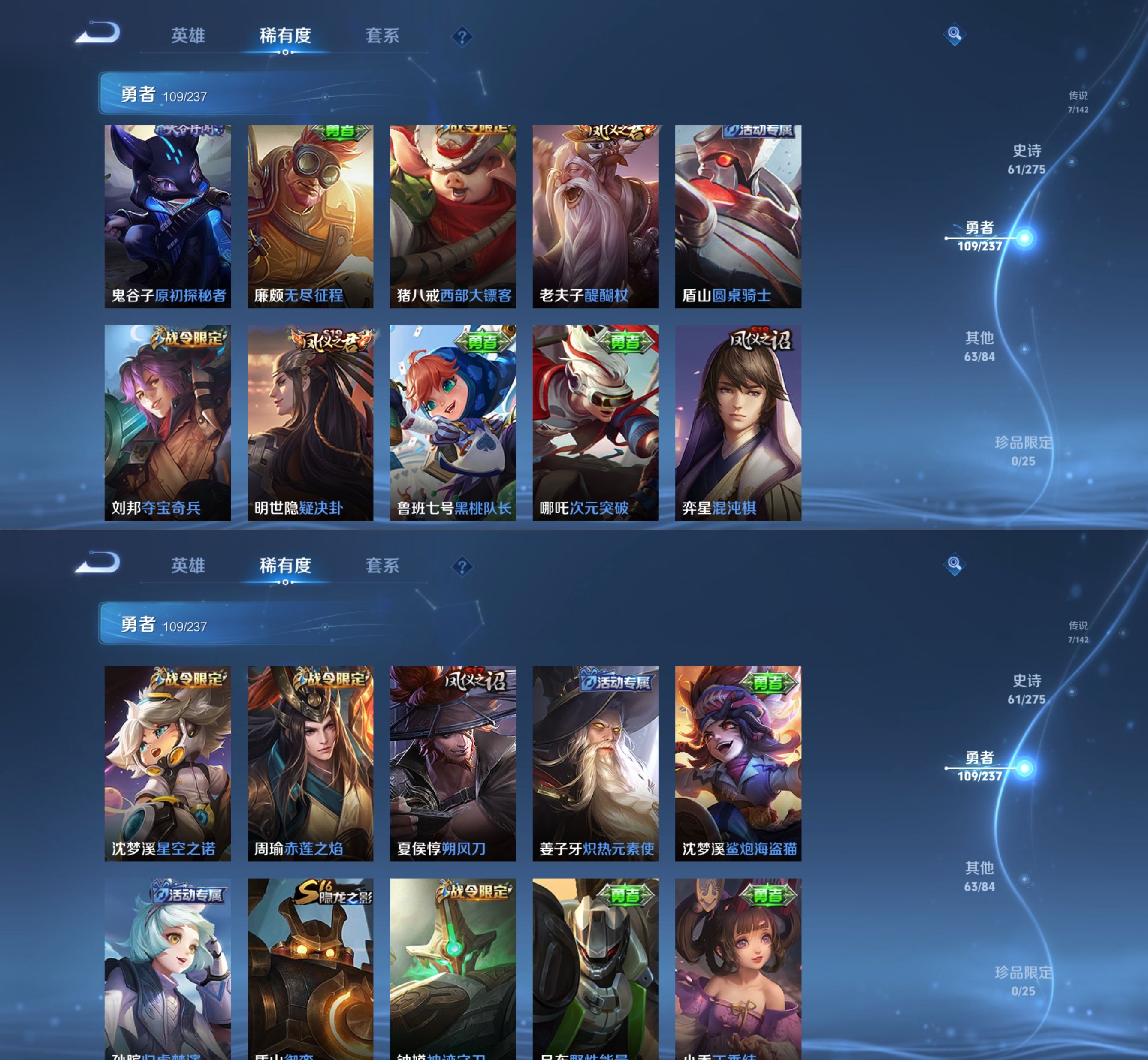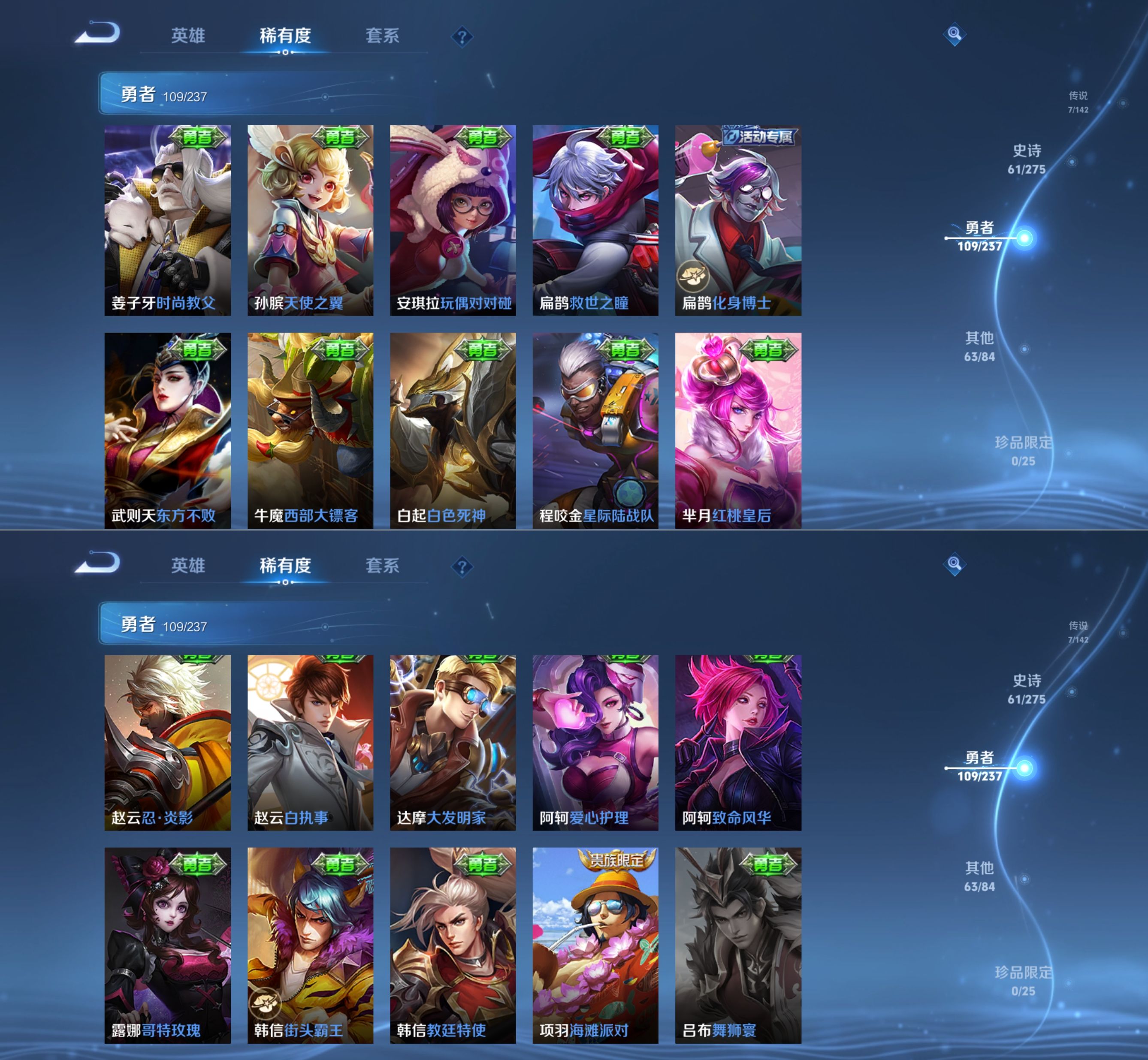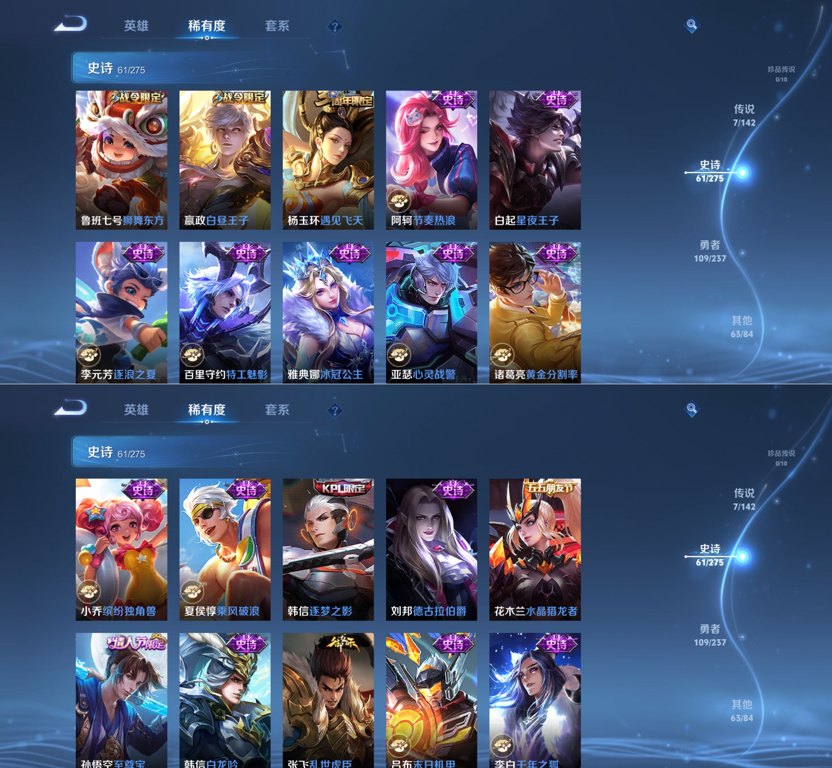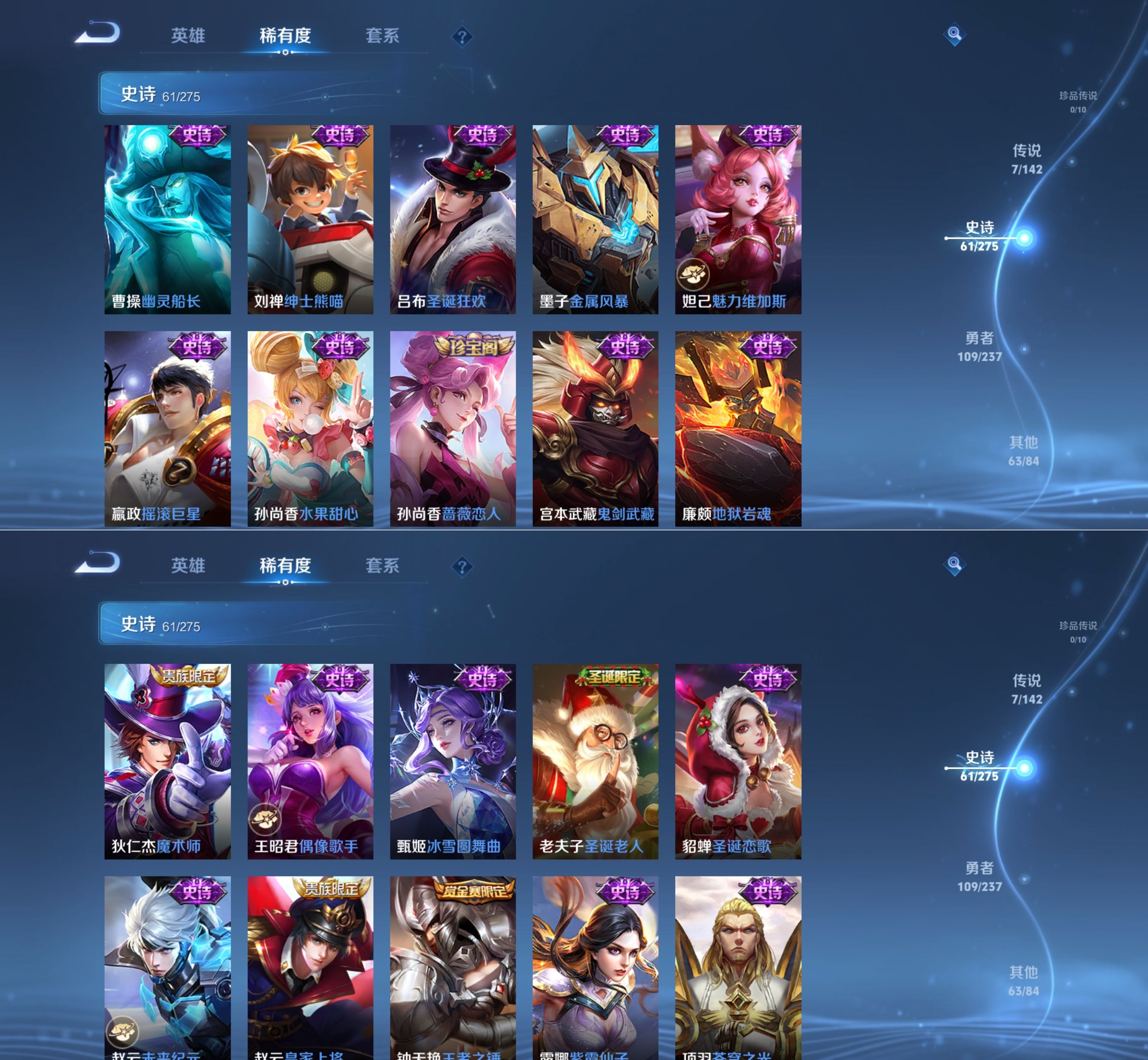贵族等级:v7皮肤数:242传说品质7 情人节限定1 荣耀典藏2 生肖限定1 英雄数:127