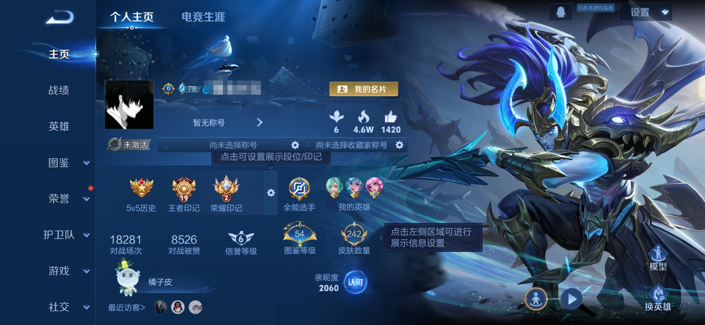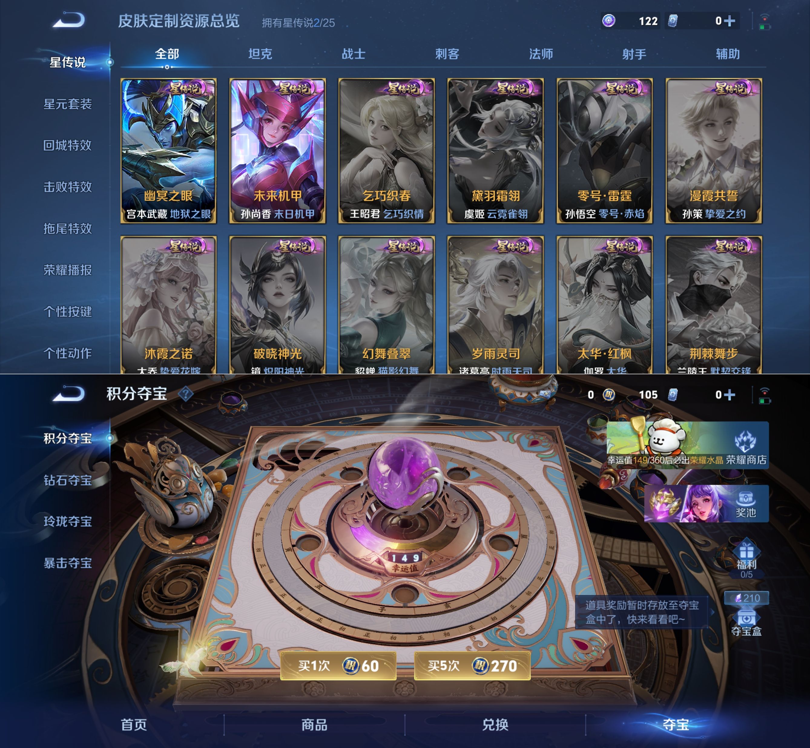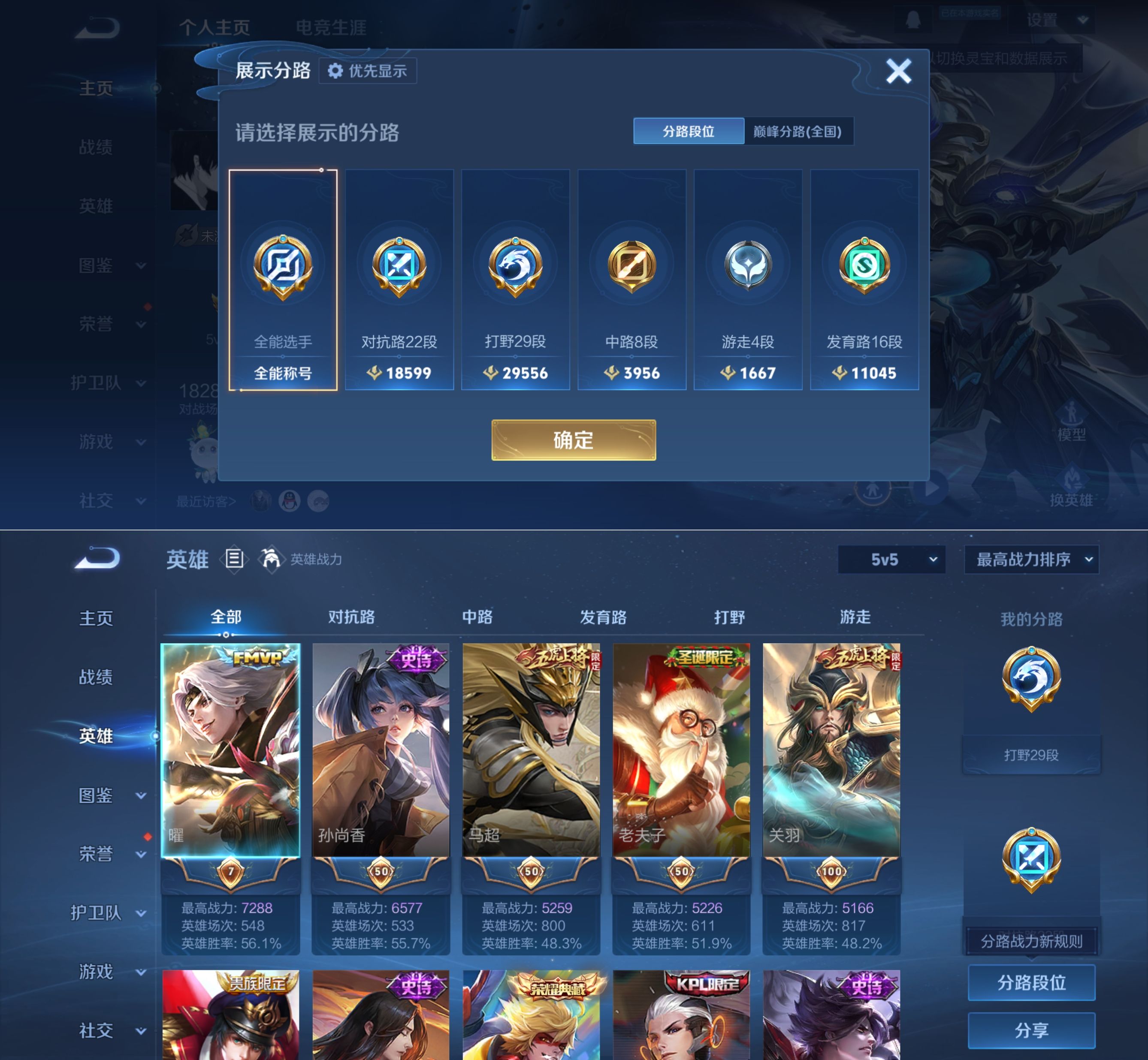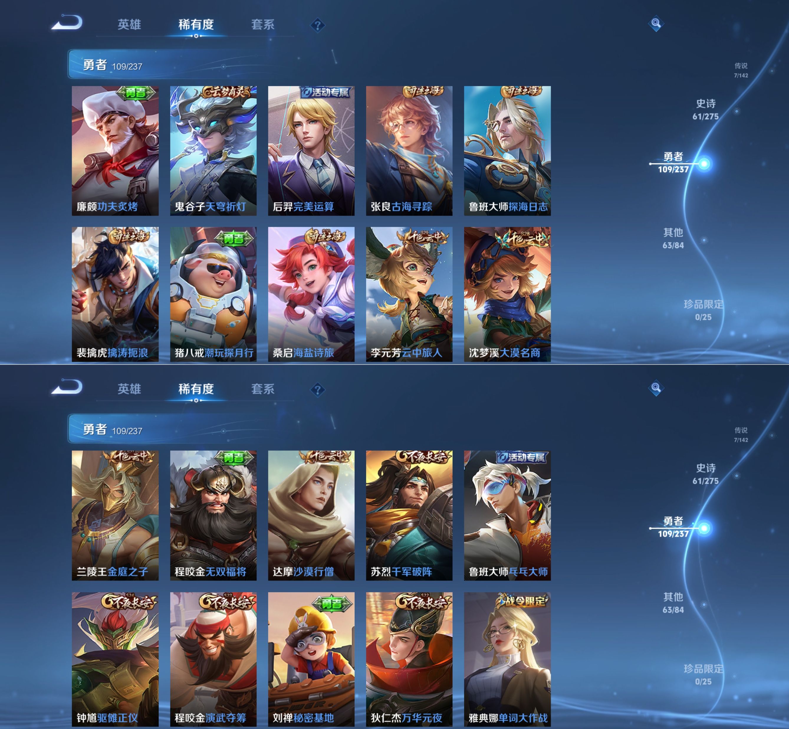 贵族等级:v7皮肤数:242传说品质7 情人节限定1 荣耀典藏2 生肖限定1 英雄数:127