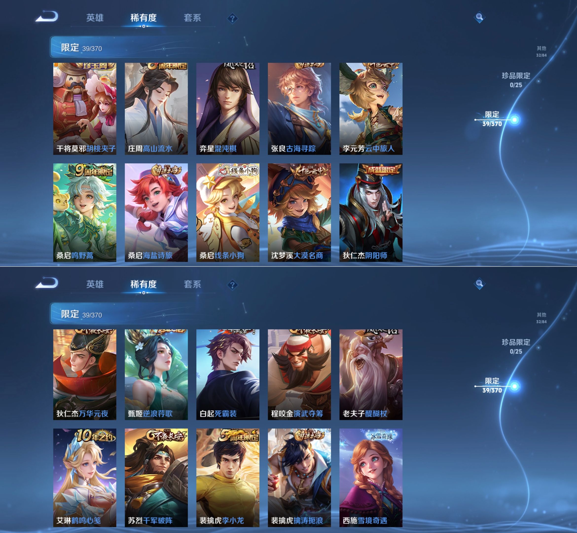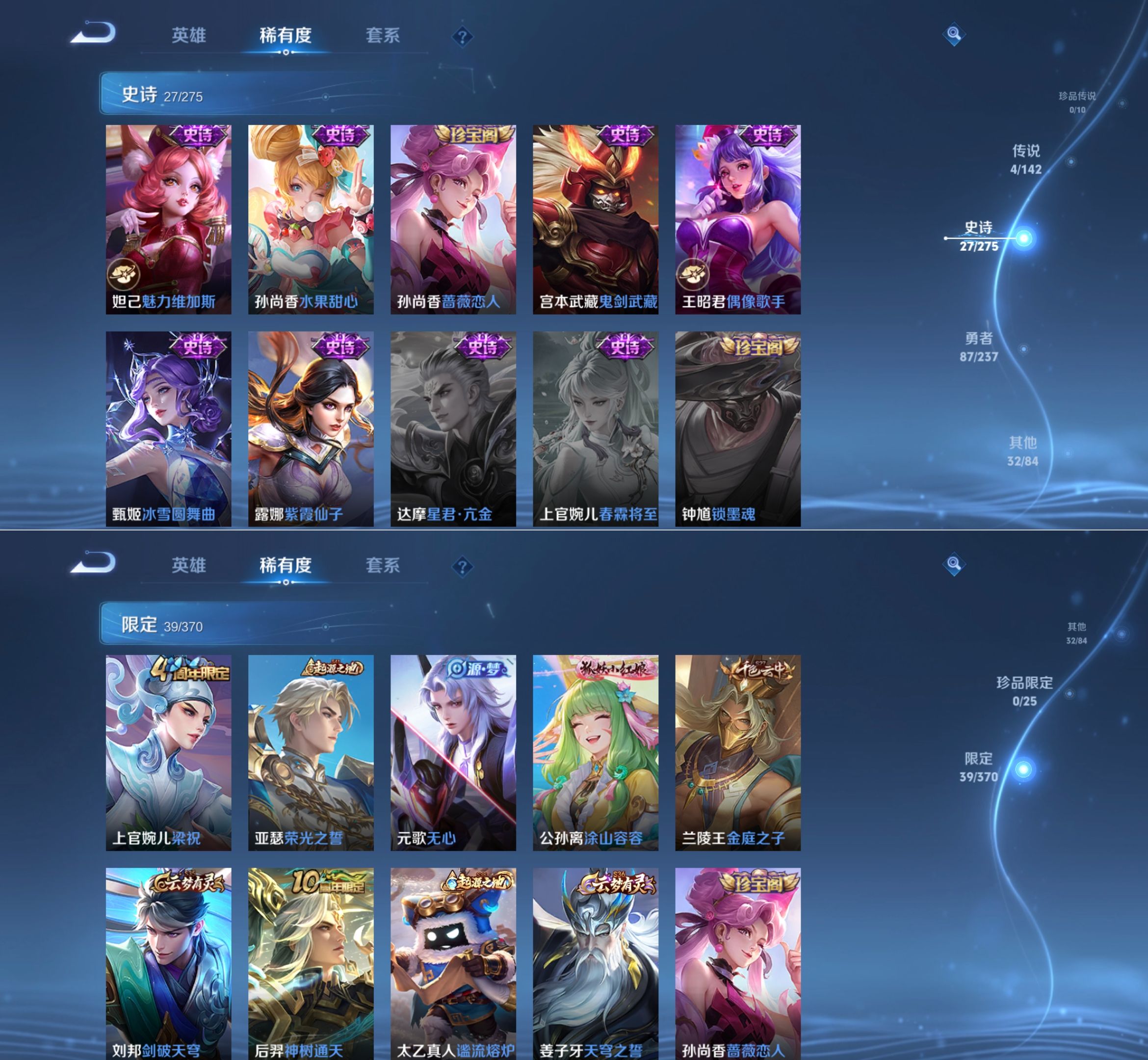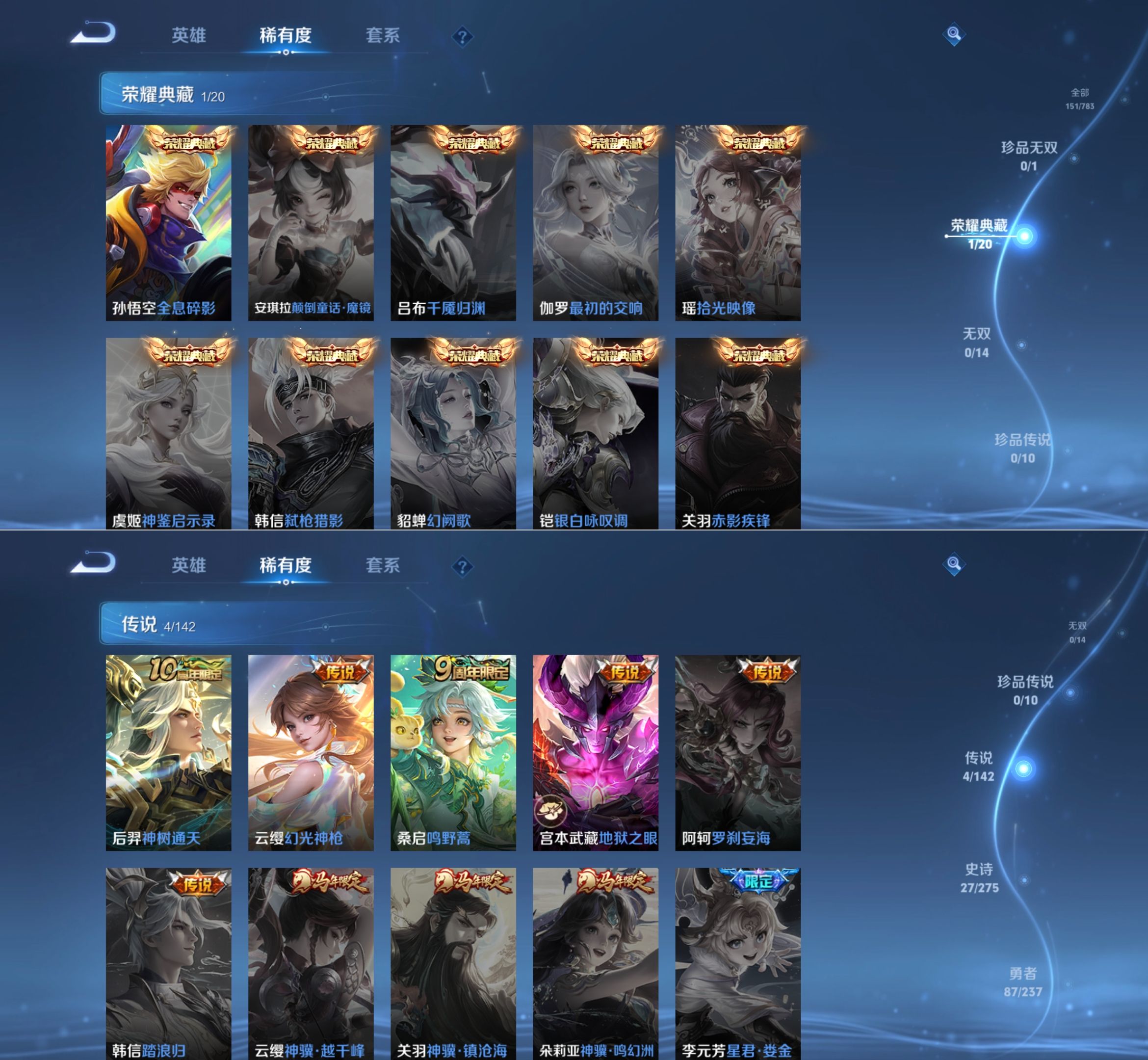 贵族等级:v4皮肤数:151传说品质4 荣耀典藏1 生肖限定2 英雄数:127