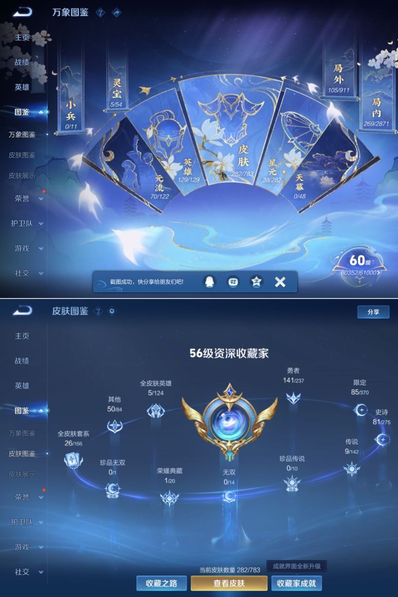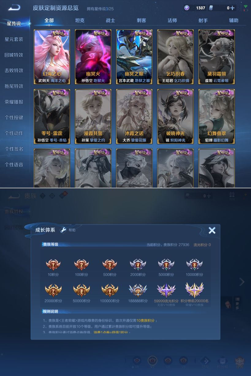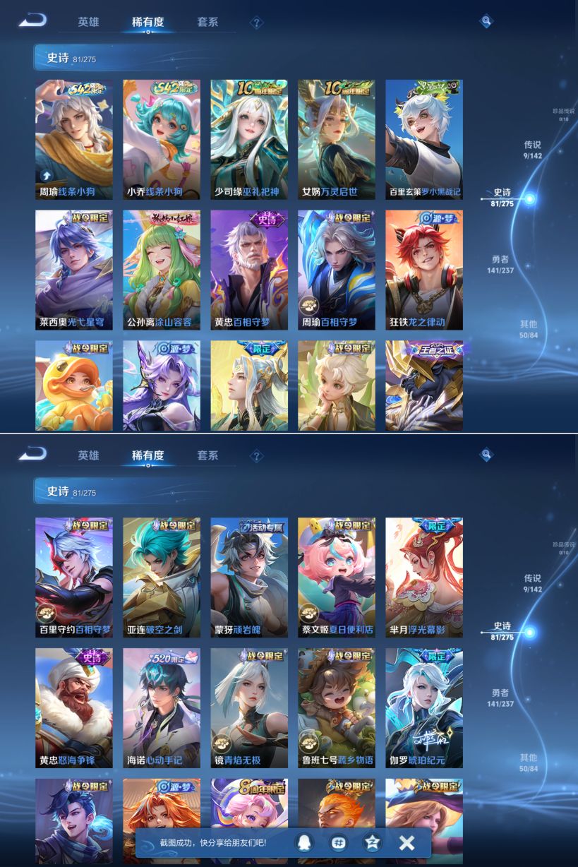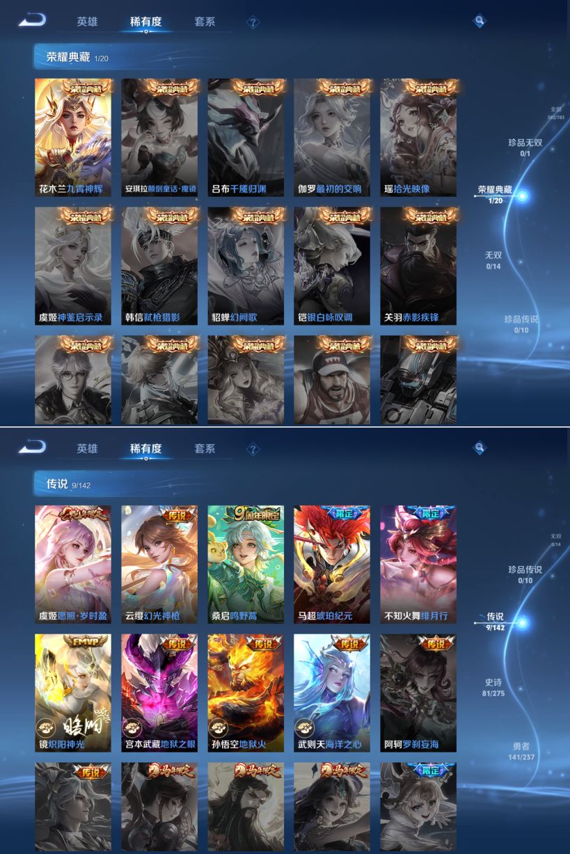 贵族等级:v7皮肤数:282传说品质9 荣耀典藏1 生肖限定2 英雄数:129