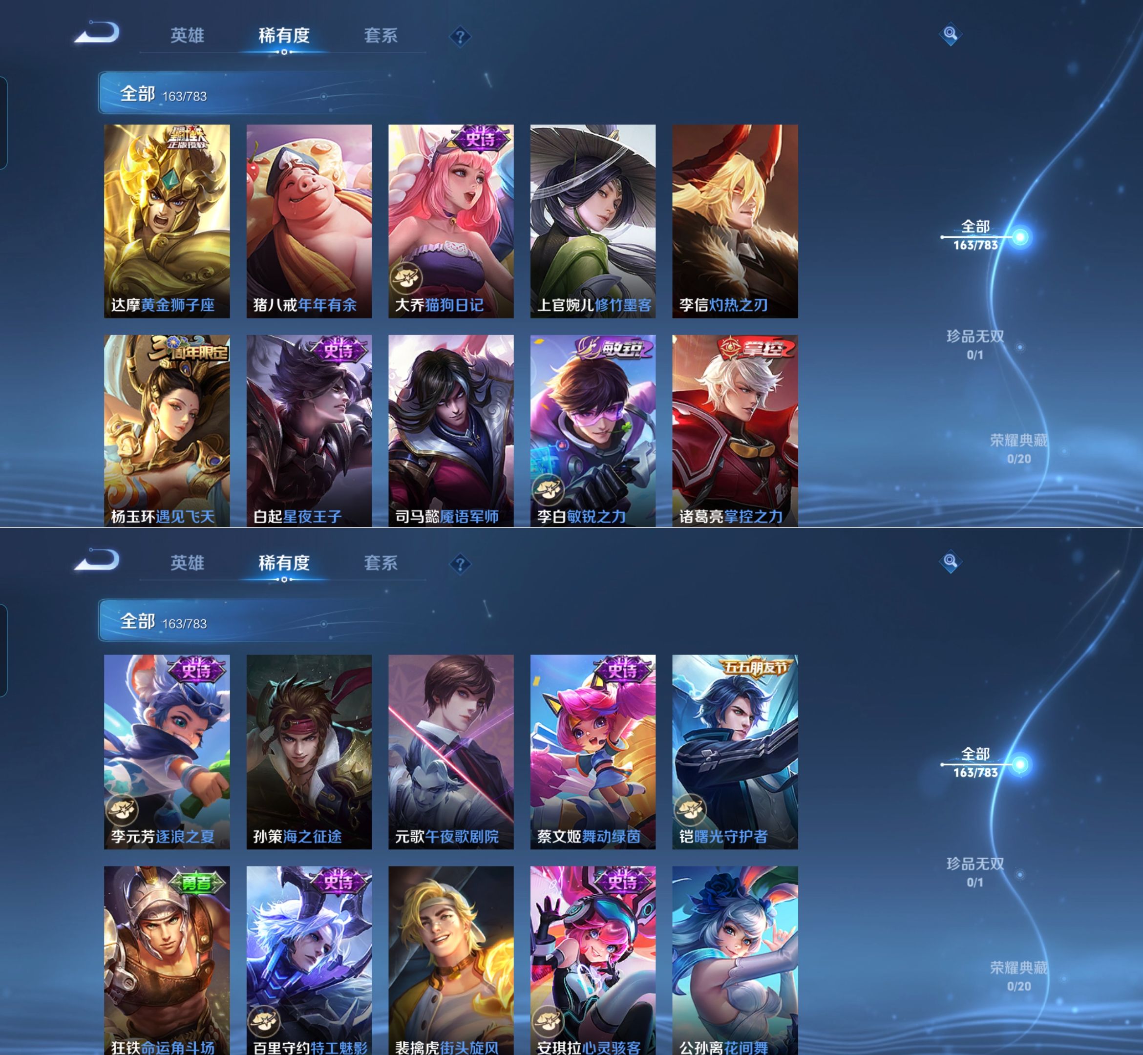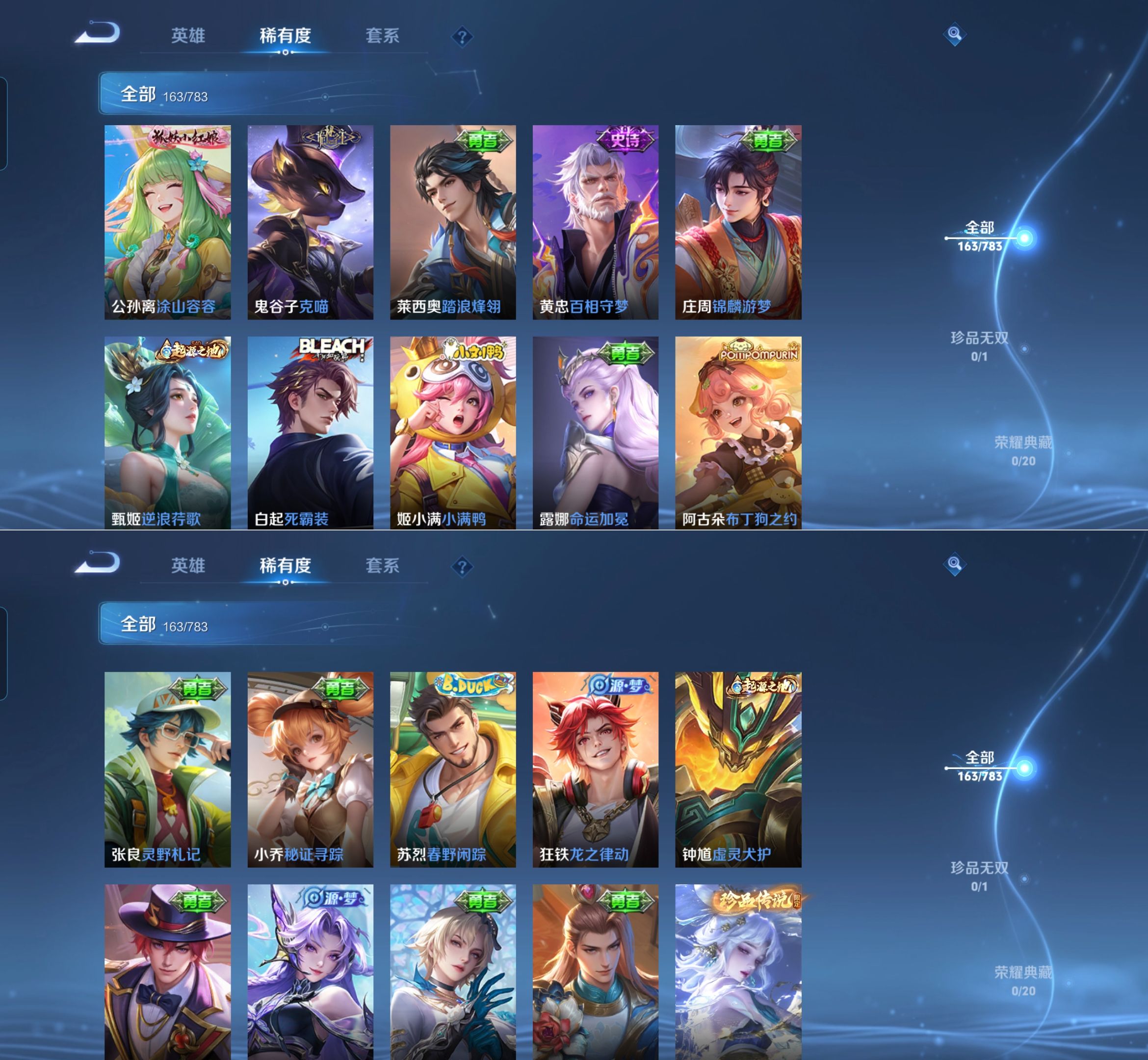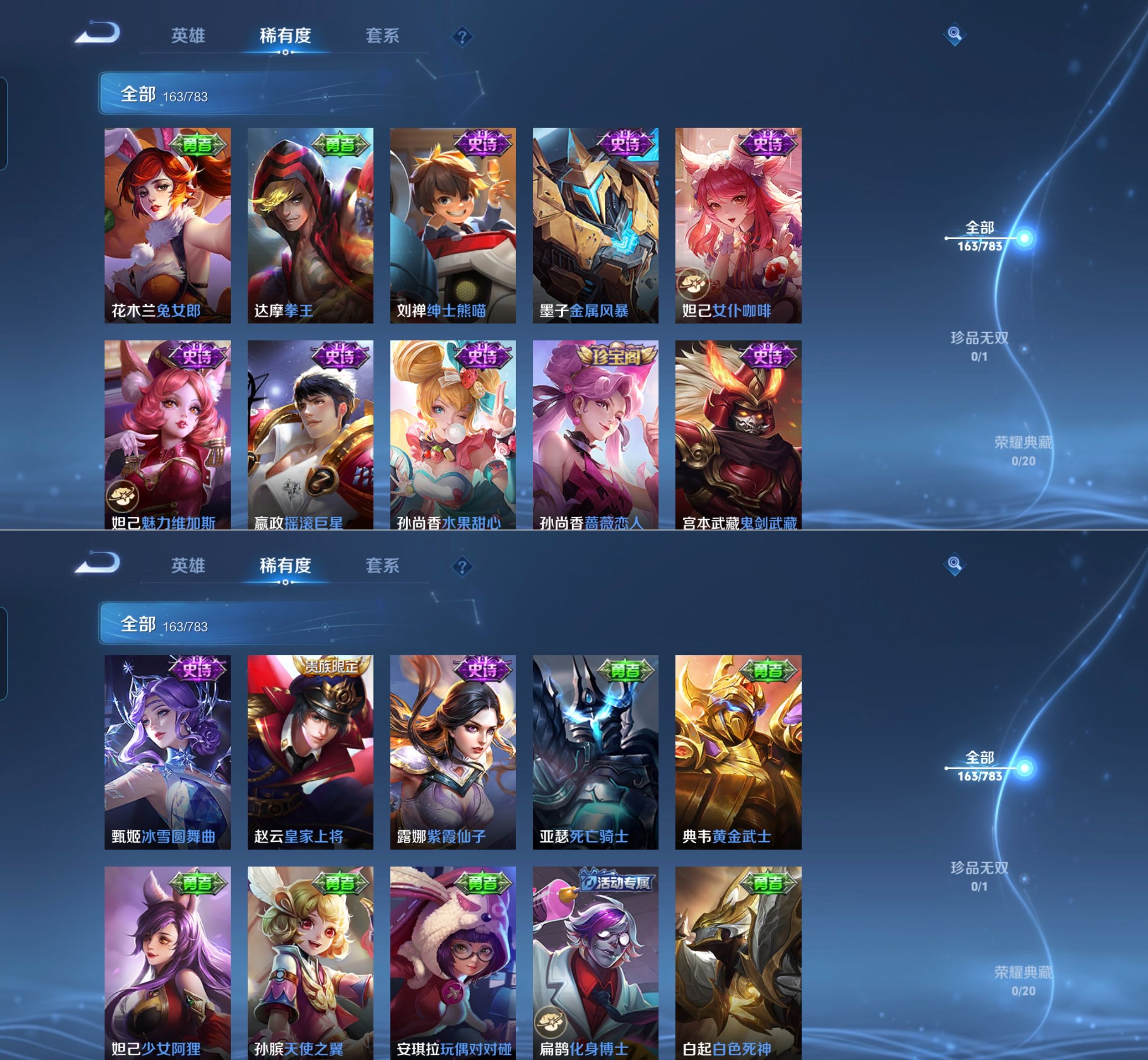贵族等级:v5皮肤数:163传说品质7 珍品传说1 英雄数:127