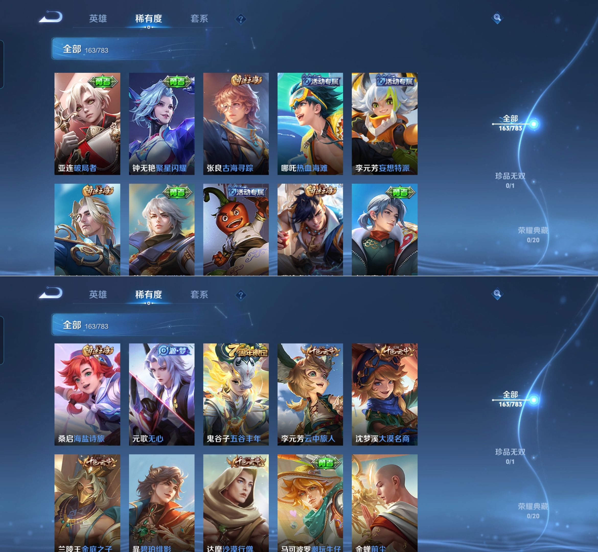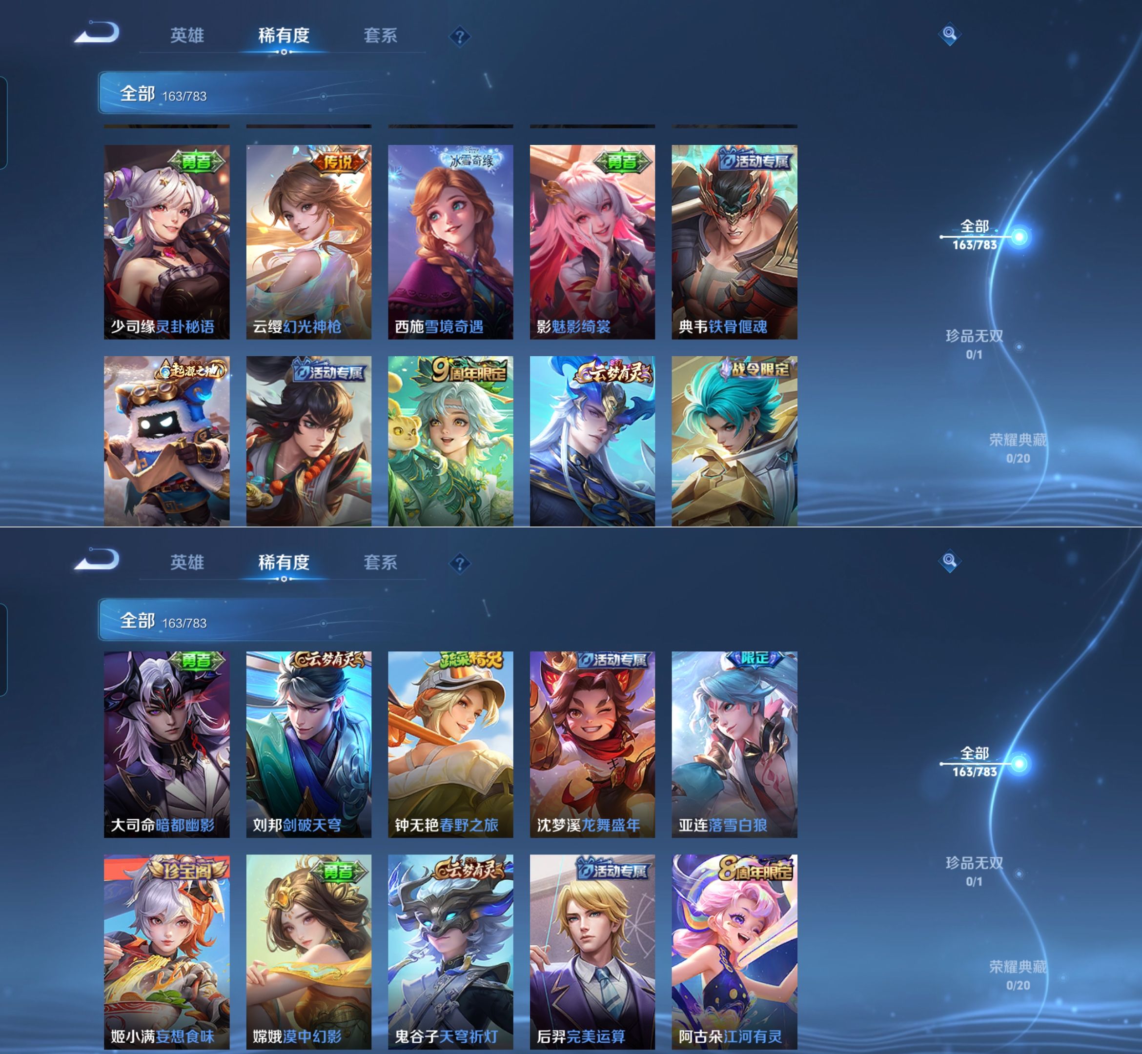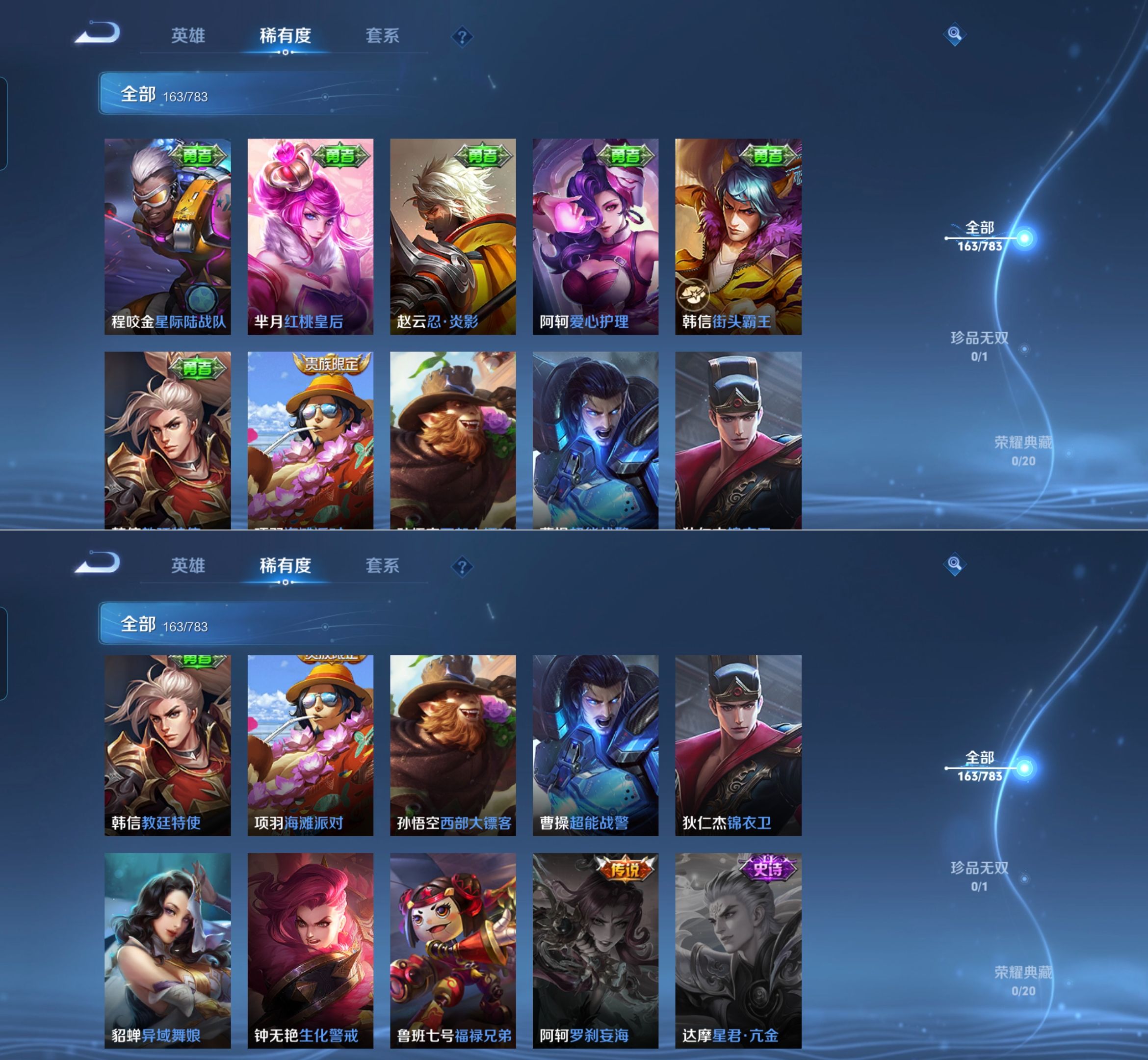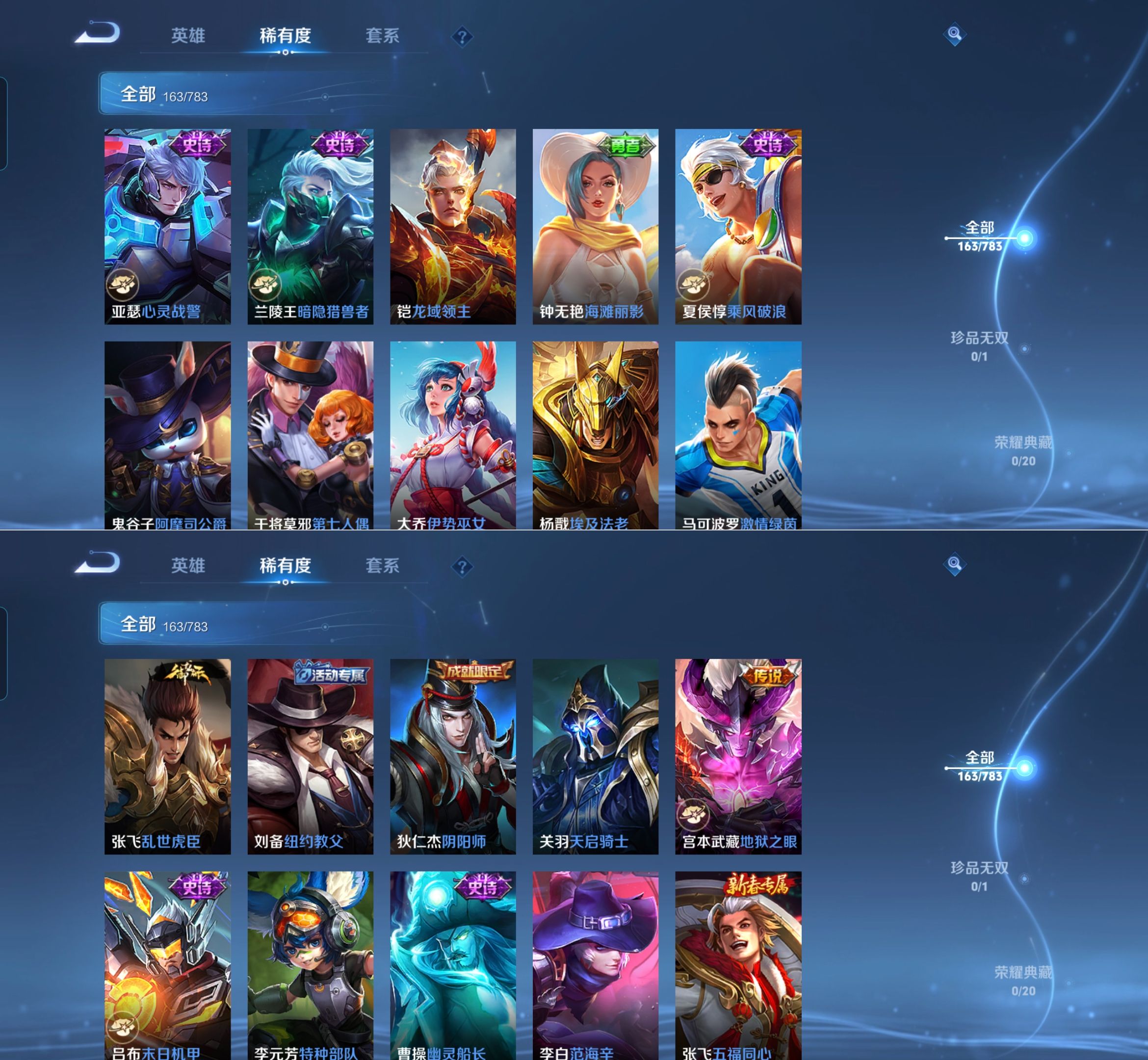 贵族等级:v5皮肤数:163传说品质7 珍品传说1 英雄数:127