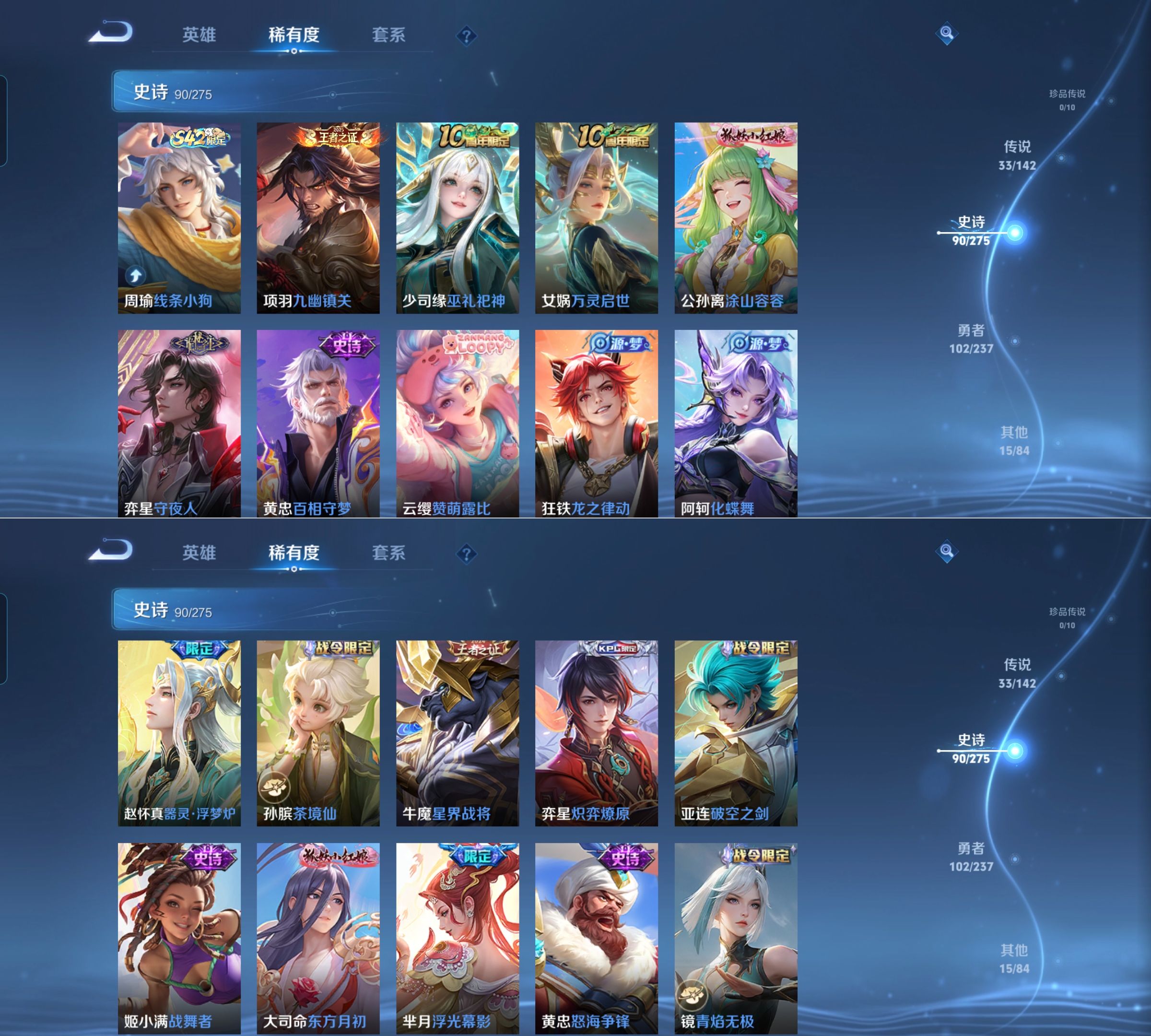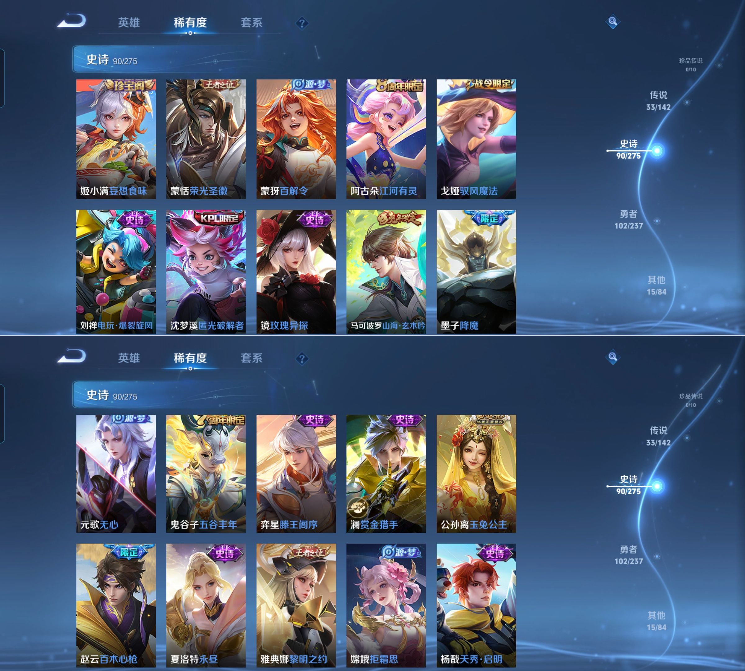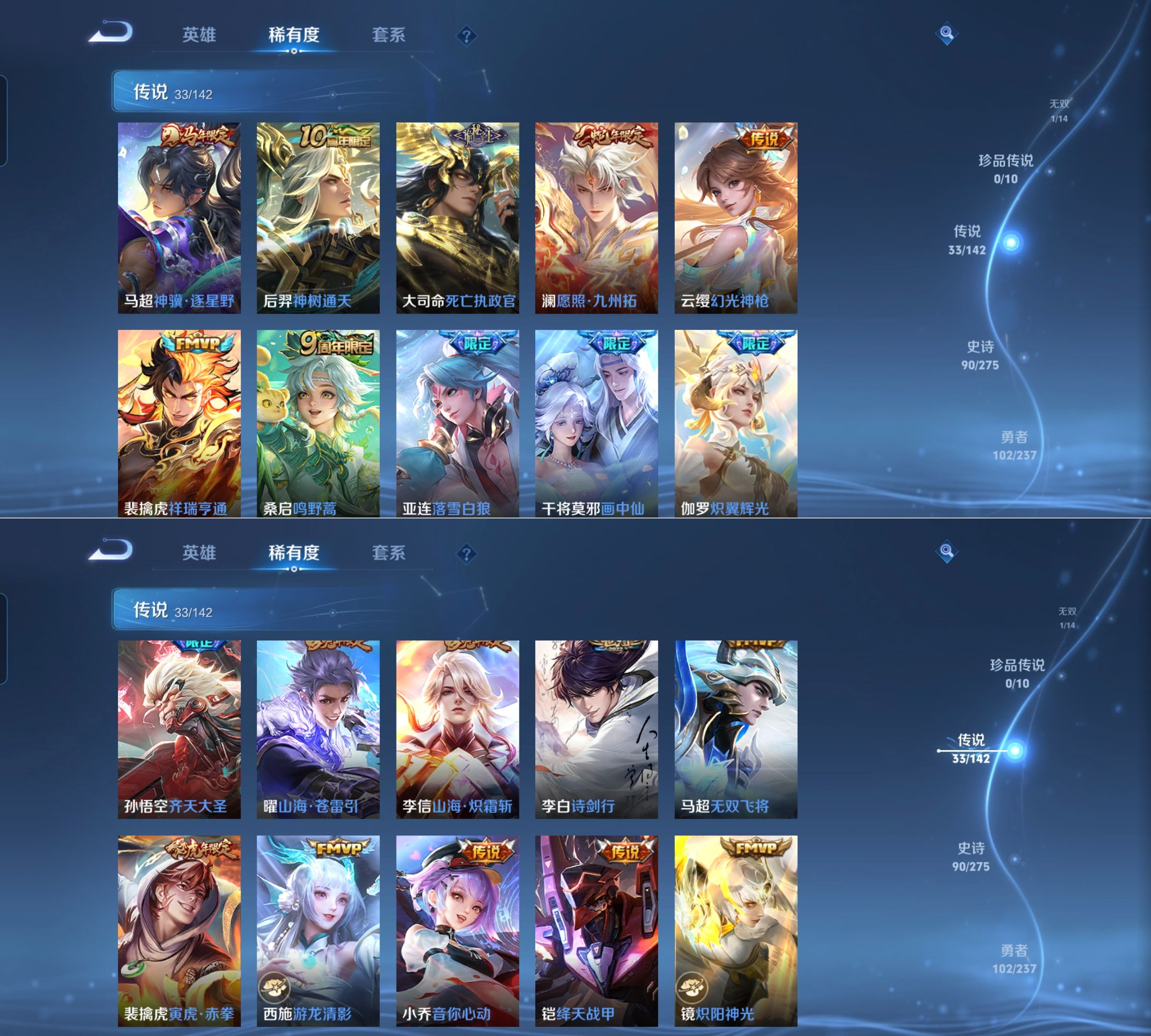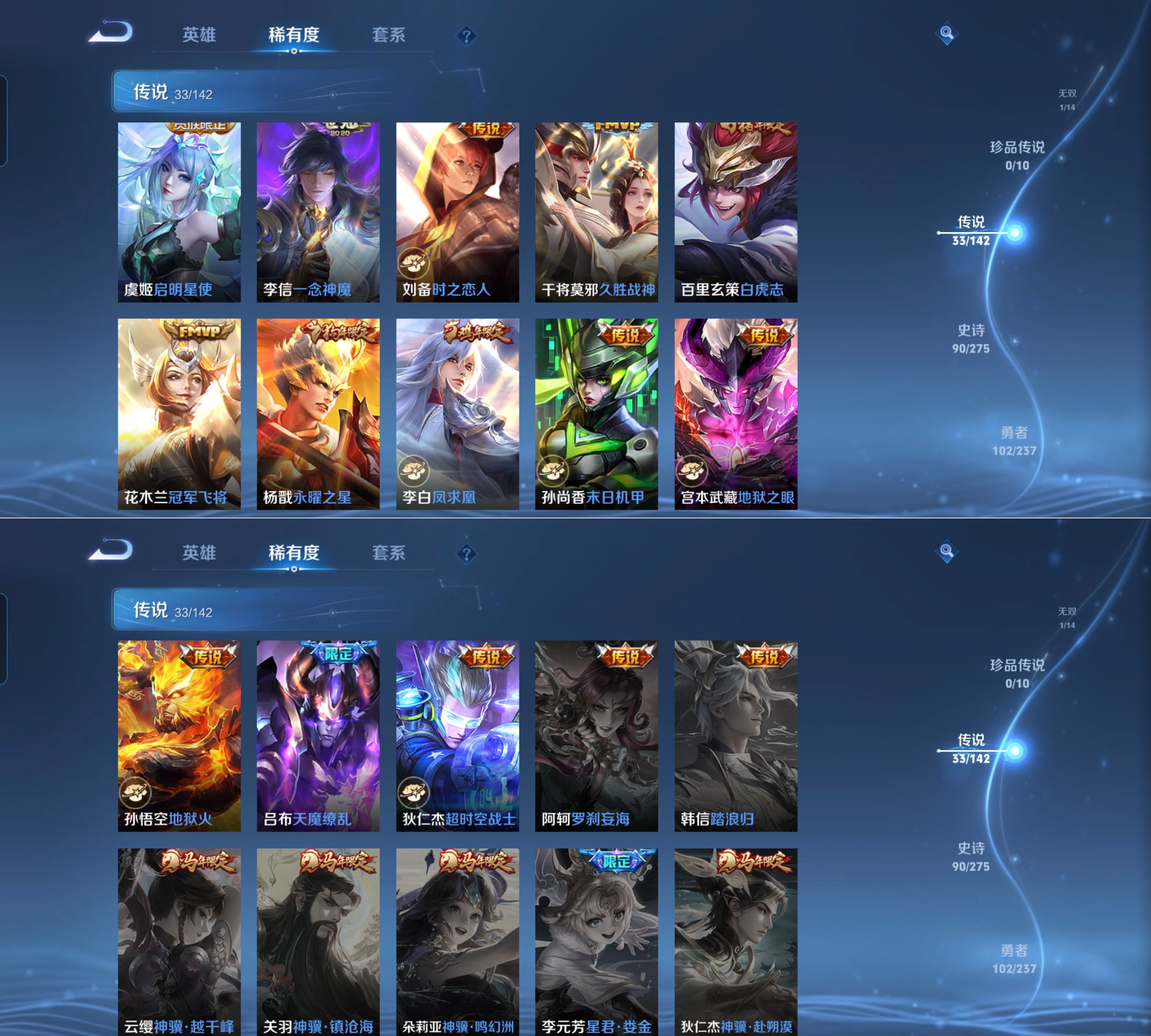 传说品质_后羿_神树通天传说品质_澜_愿照·九州拓传说品质_孙悟空_齐天大圣传说品质_孙悟空_地狱火传说品质_吕布_天魔缭乱传说品质_马超_无双飞将传说品质_马超_神骥·逐星野传说品质_杨戬_永曜之星传说品质_干将莫邪_画中仙传说品质_干将莫邪_久胜战神传说品质_宫本武藏_地狱之眼传说品质_西施_游龙清影传说品质_花木兰_冠军飞将传说品质_镜_炽阳神光传说品质_李信_一念神魔传说品质_李信_山海·炽霜斩传说品质_孙尚香_末日机甲传说品质_小乔_音你心动传说品质_桑启_鸣野蒿传说品质_刘备_时之恋人传说品质_云缨_幻光神枪传说品质_李白_凤求凰传说品质_李白_诗剑行传说品质_大司命_死亡执政官传说品质_亚连_落雪白狼传说品质_伽罗_炽翼辉光传说品质_曜_山海·苍雷引传说品质_狄仁杰_超时空战士传说品质_铠_绛天战甲传说品质_虞姬_启明星使传说品质_百里玄策_白虎志传说品质_裴擒虎_寅虎·赤拳传说品质_裴擒虎_祥瑞亨通