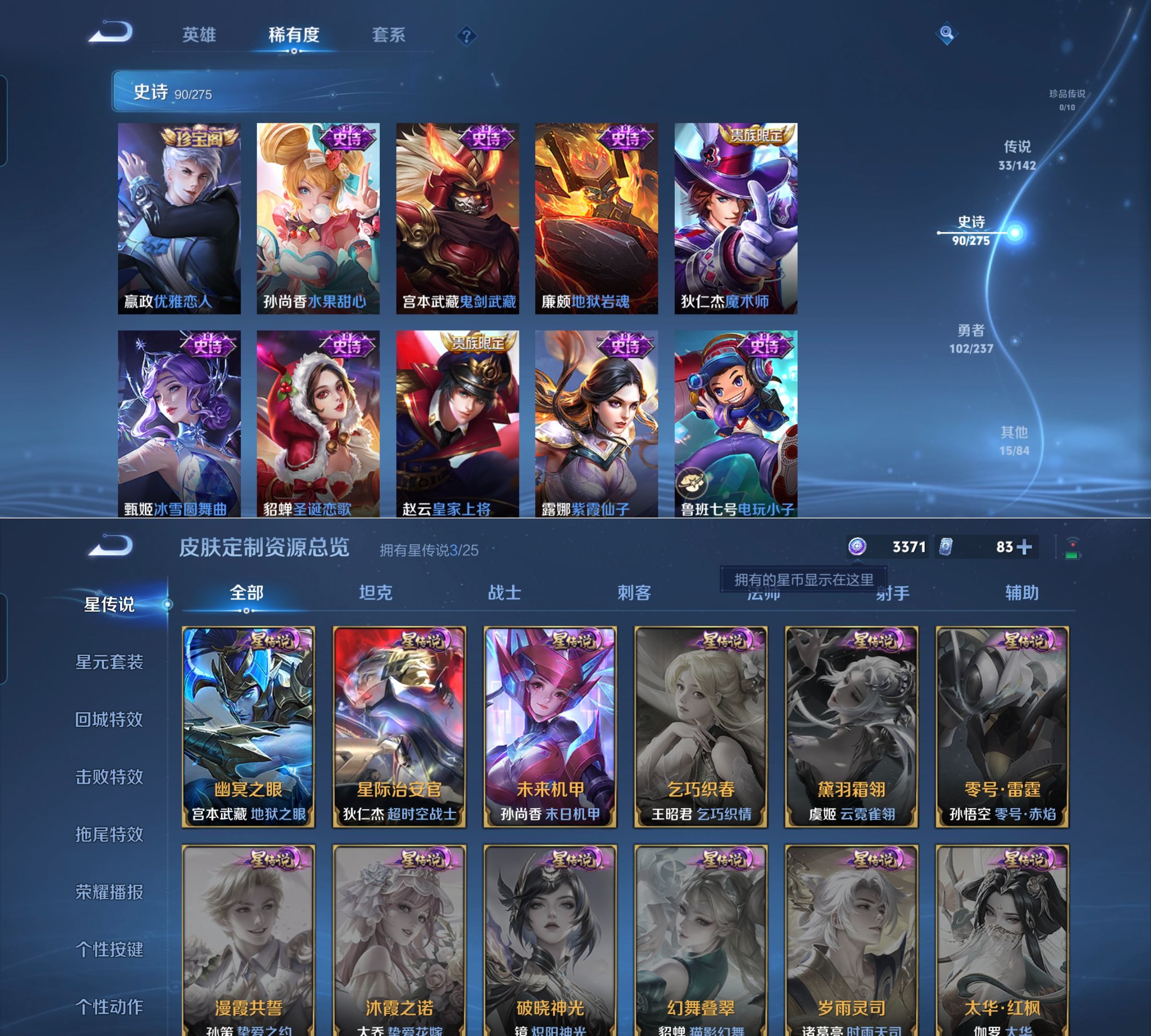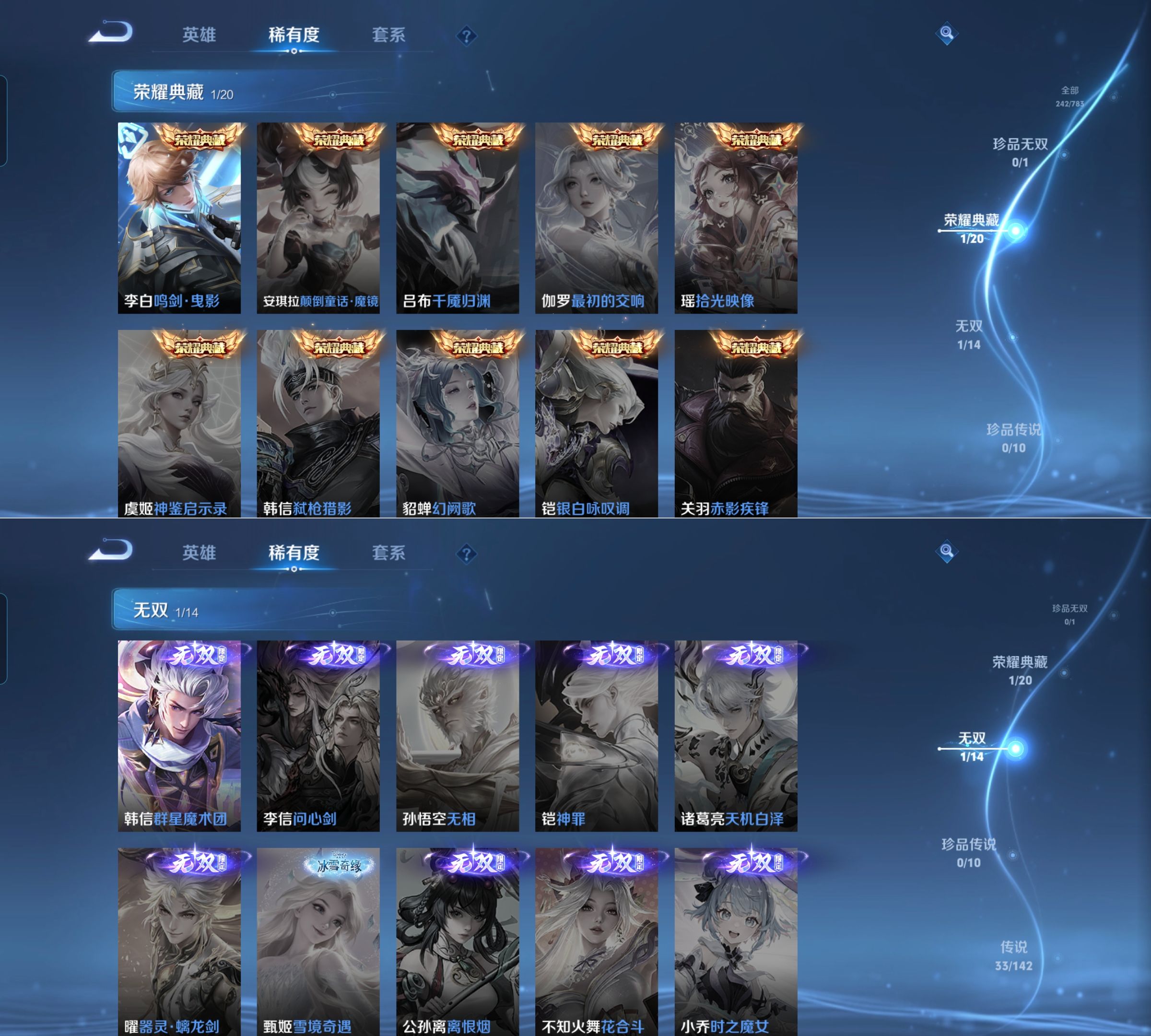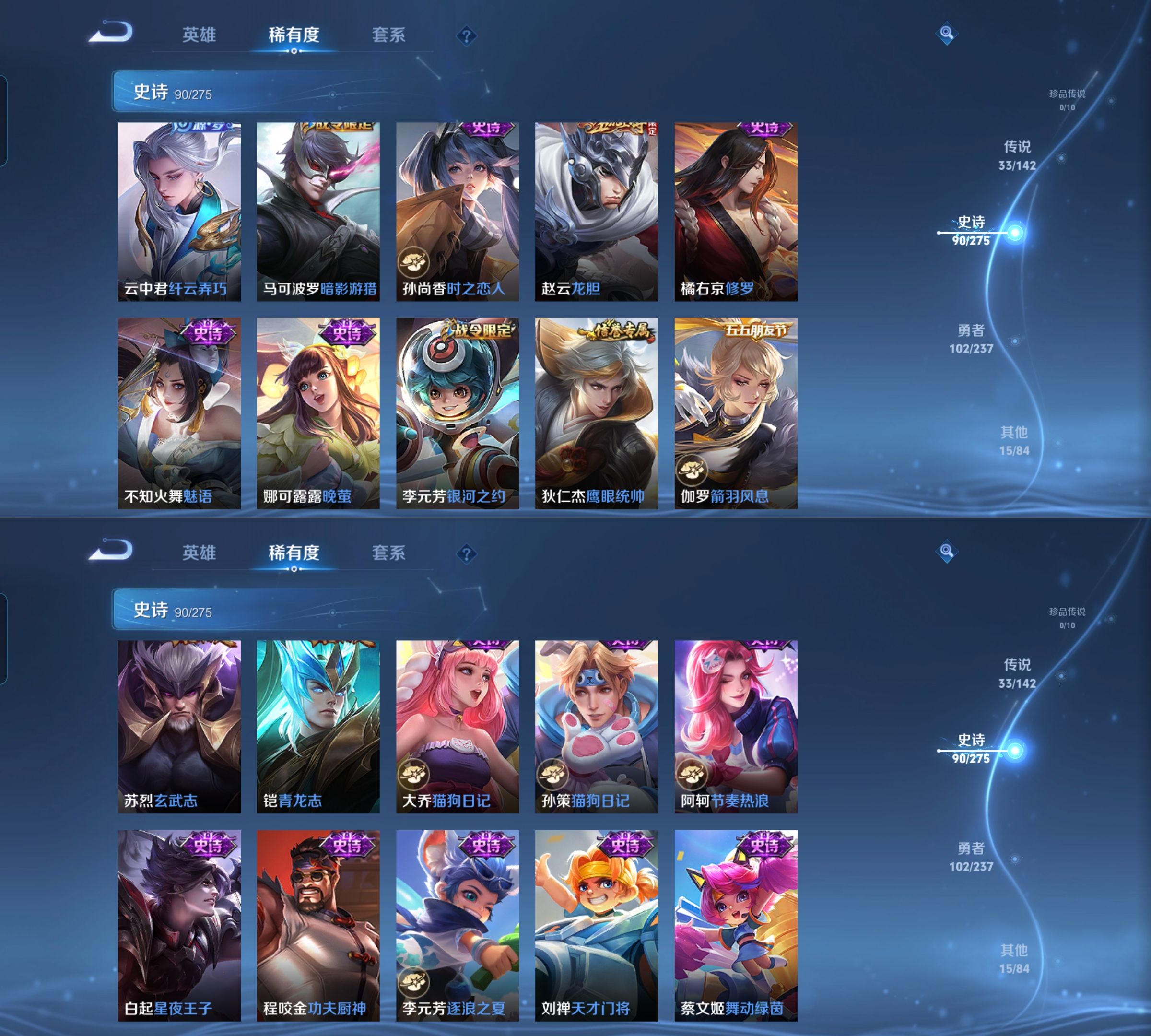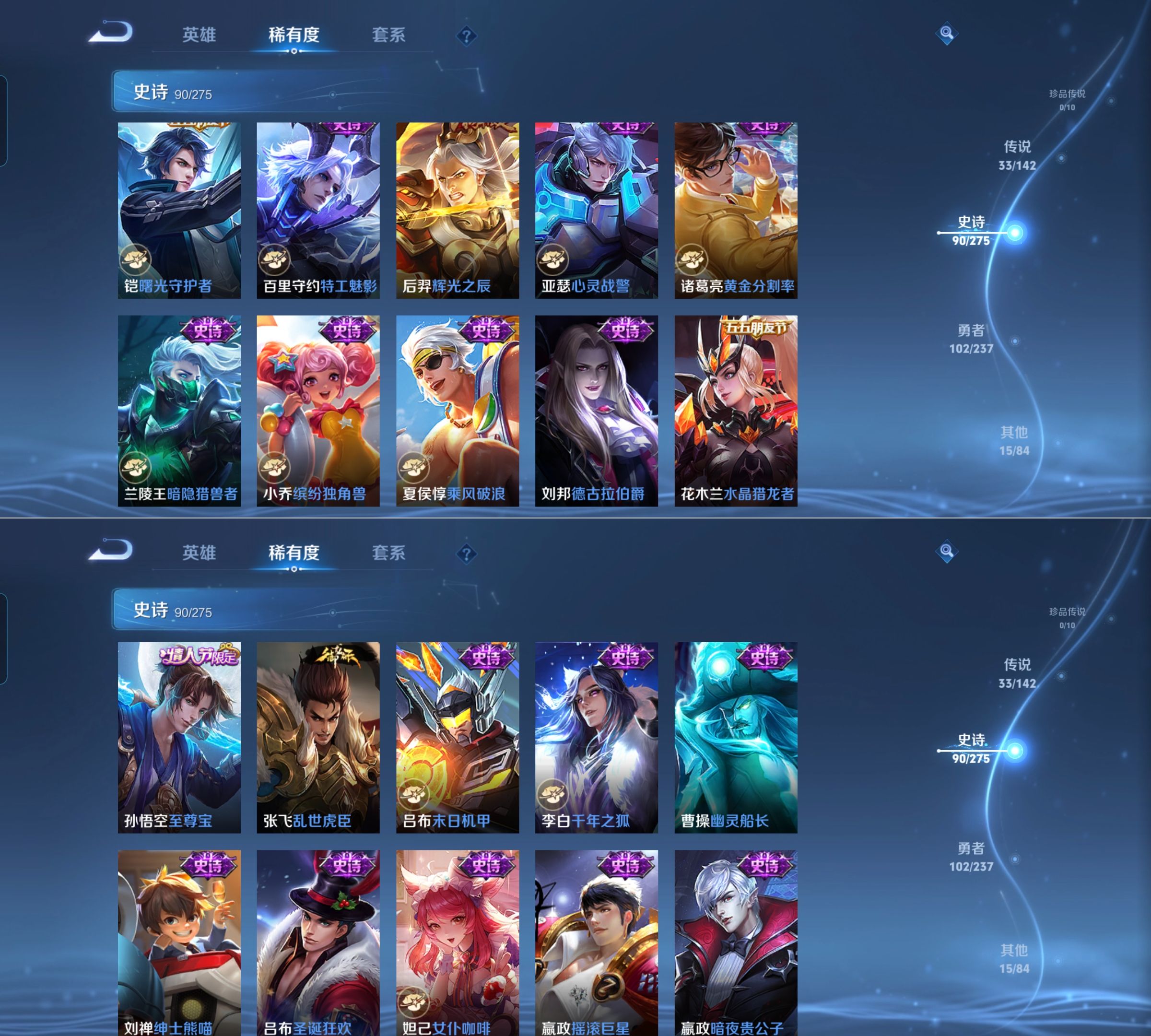 传说品质_后羿_神树通天传说品质_澜_愿照·九州拓传说品质_孙悟空_齐天大圣传说品质_孙悟空_地狱火传说品质_吕布_天魔缭乱传说品质_马超_无双飞将传说品质_马超_神骥·逐星野传说品质_杨戬_永曜之星传说品质_干将莫邪_画中仙传说品质_干将莫邪_久胜战神传说品质_宫本武藏_地狱之眼传说品质_西施_游龙清影传说品质_花木兰_冠军飞将传说品质_镜_炽阳神光传说品质_李信_一念神魔传说品质_李信_山海·炽霜斩传说品质_孙尚香_末日机甲传说品质_小乔_音你心动传说品质_桑启_鸣野蒿传说品质_刘备_时之恋人传说品质_云缨_幻光神枪传说品质_李白_凤求凰传说品质_李白_诗剑行传说品质_大司命_死亡执政官传说品质_亚连_落雪白狼传说品质_伽罗_炽翼辉光传说品质_曜_山海·苍雷引传说品质_狄仁杰_超时空战士传说品质_铠_绛天战甲传说品质_虞姬_启明星使传说品质_百里玄策_白虎志传说品质_裴擒虎_寅虎·赤拳传说品质_裴擒虎_祥瑞亨通