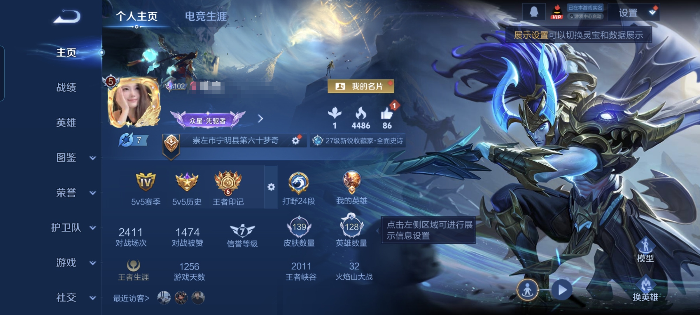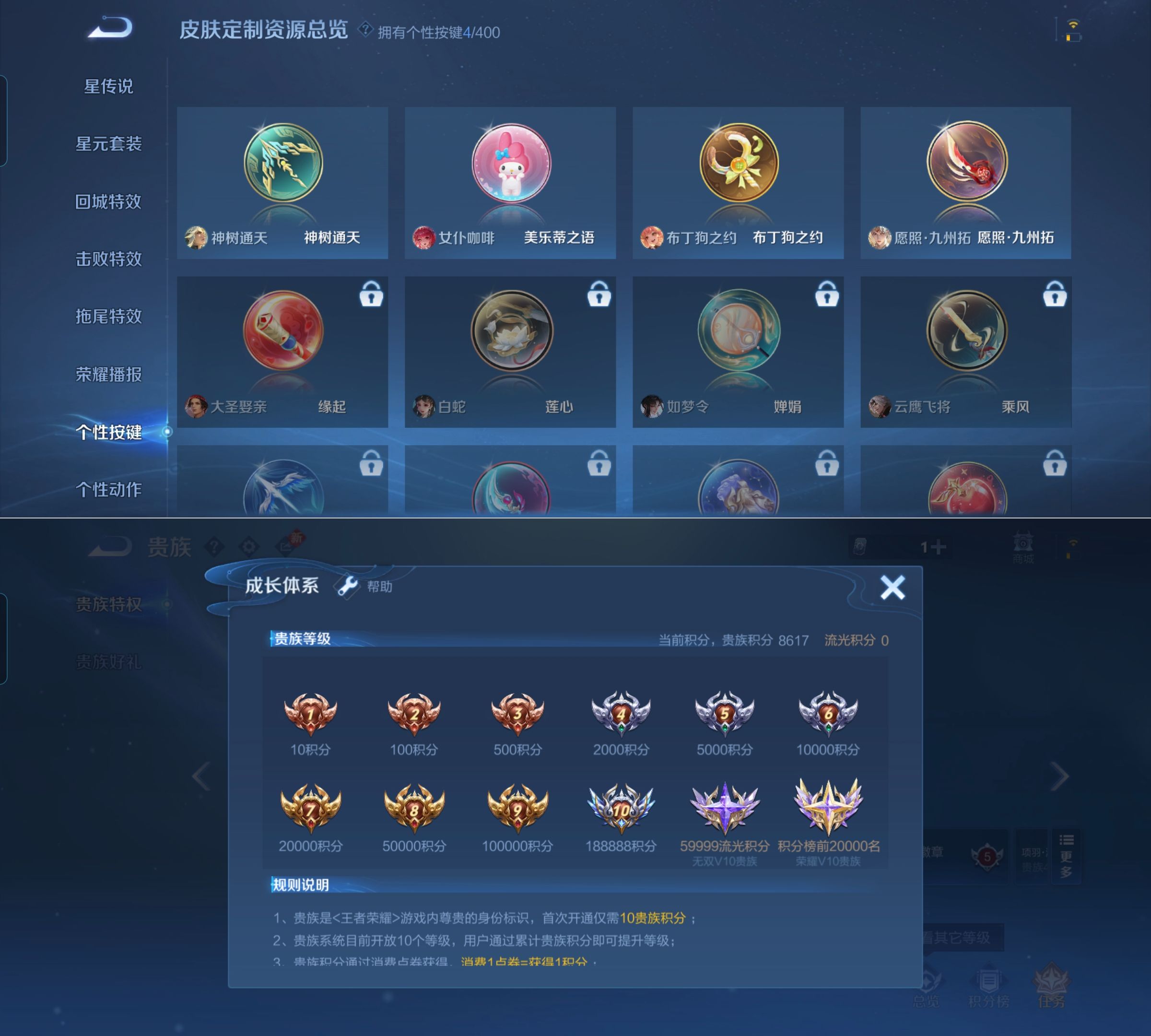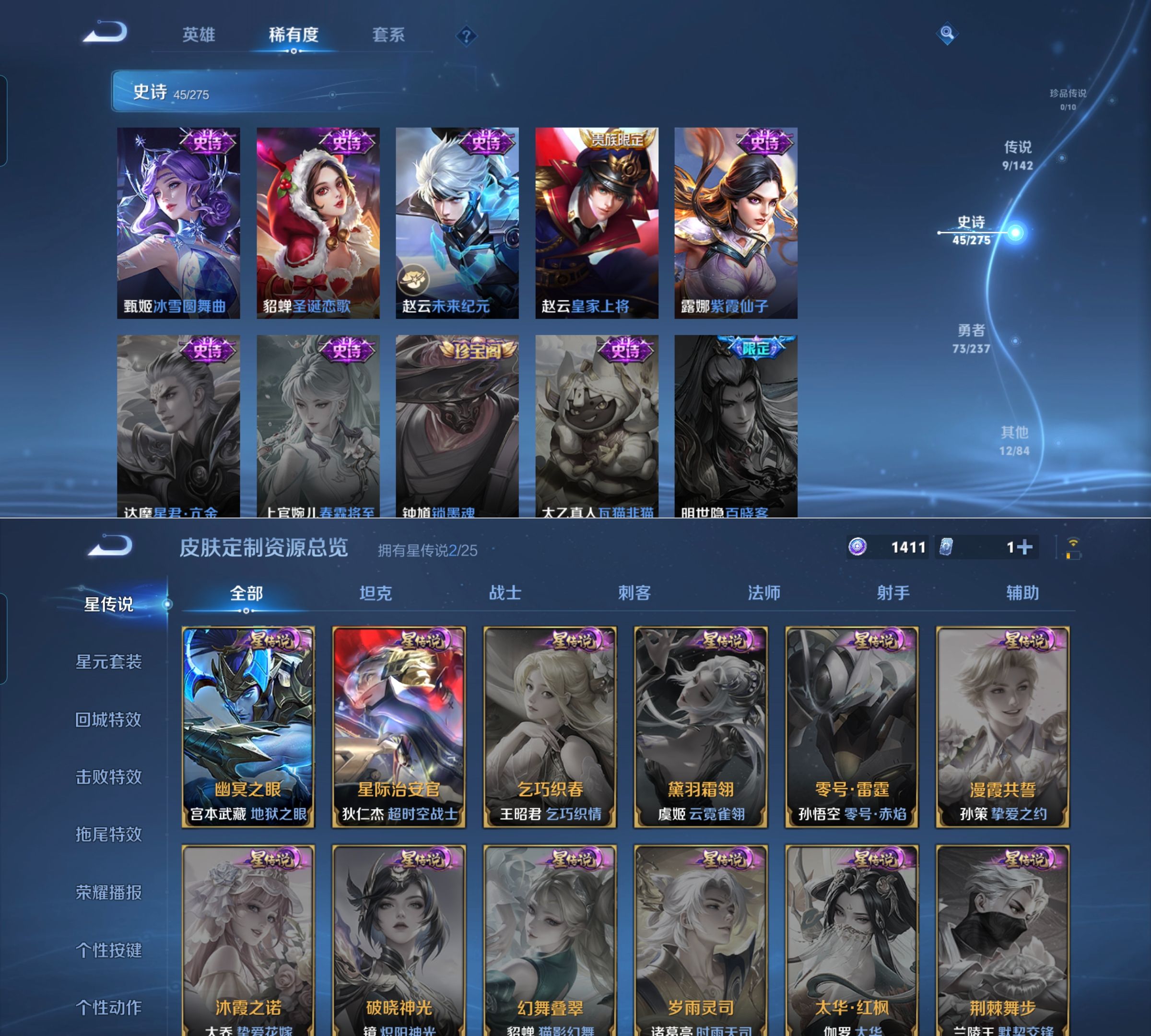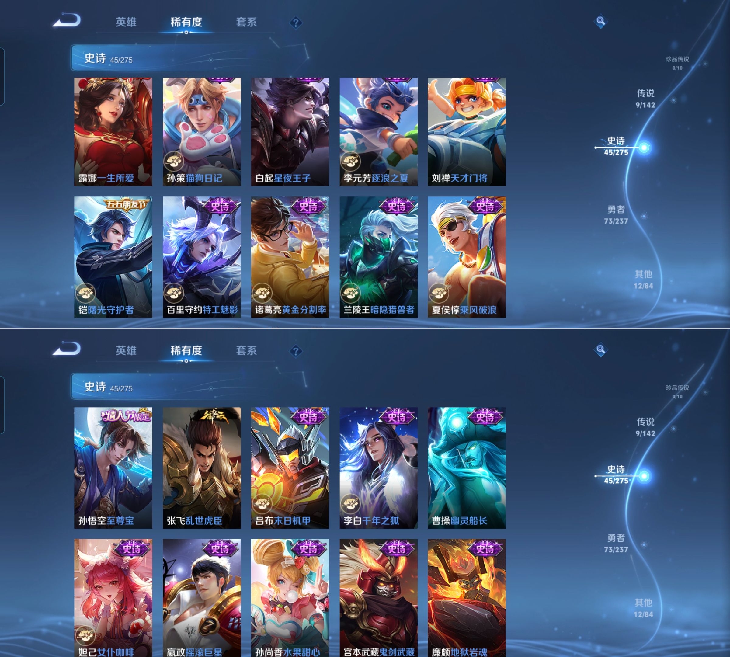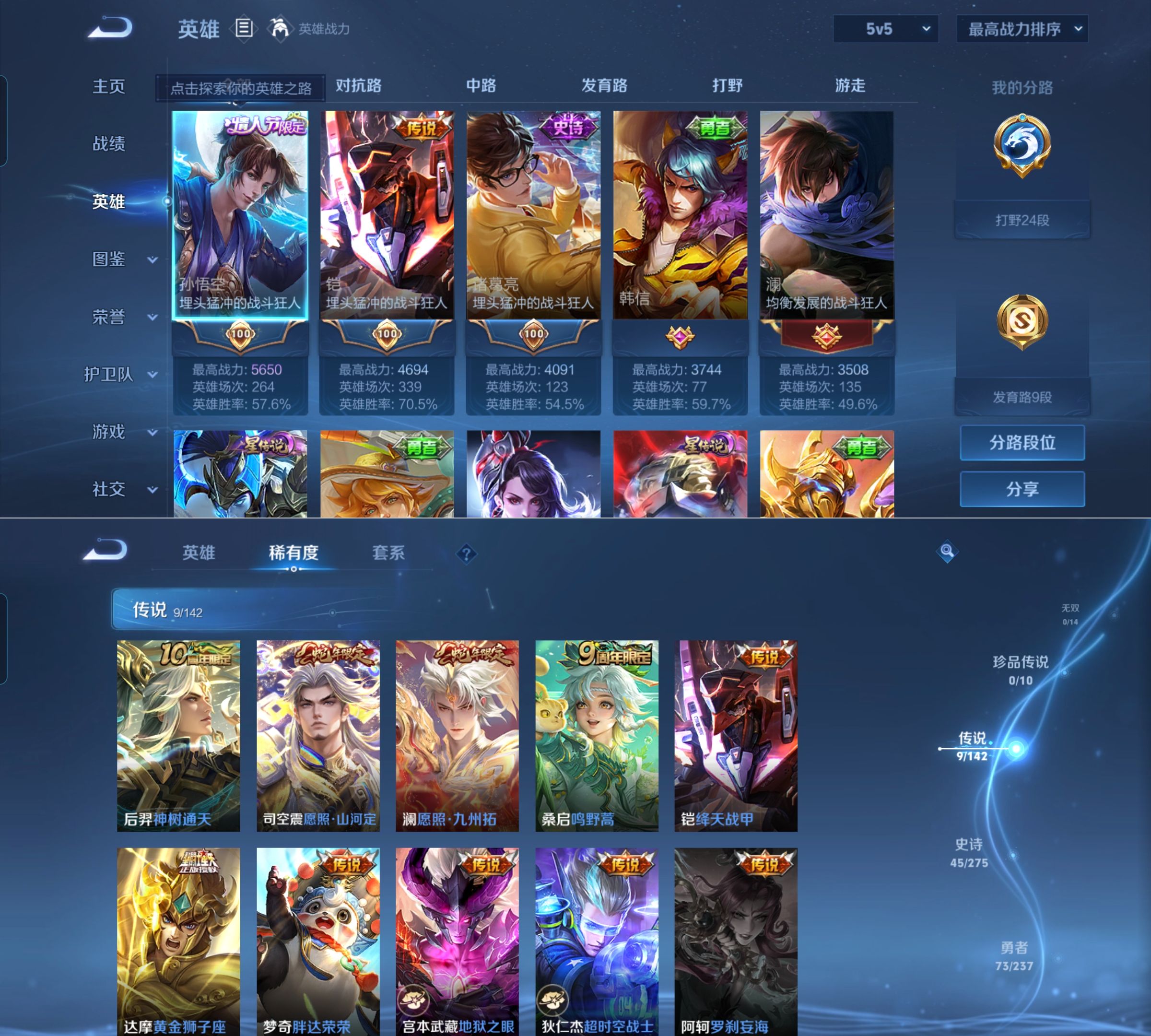 贵族等级:v5皮肤数:142传说品质9 生肖限定2 情人节限定2 英雄数:128