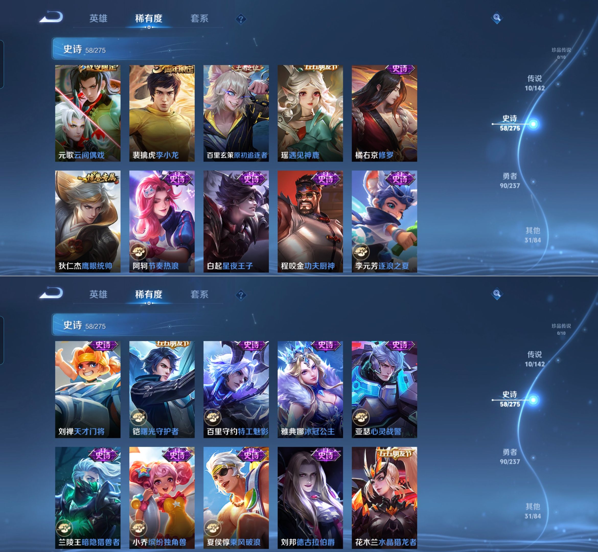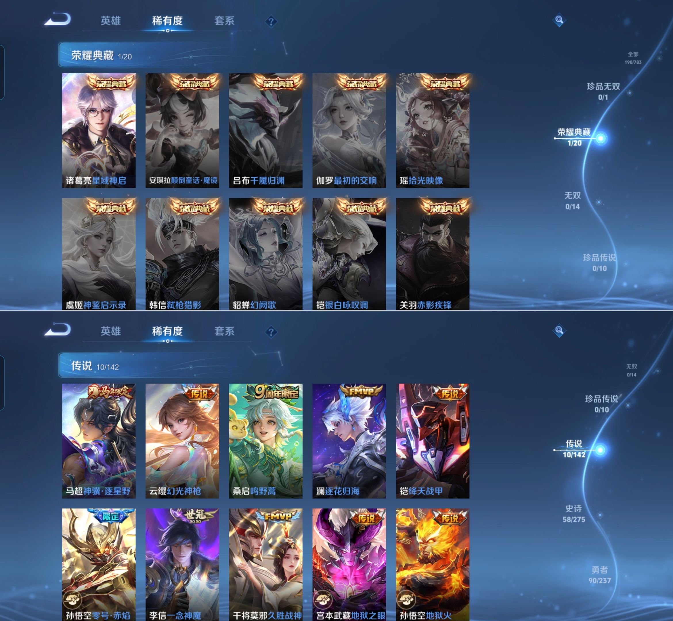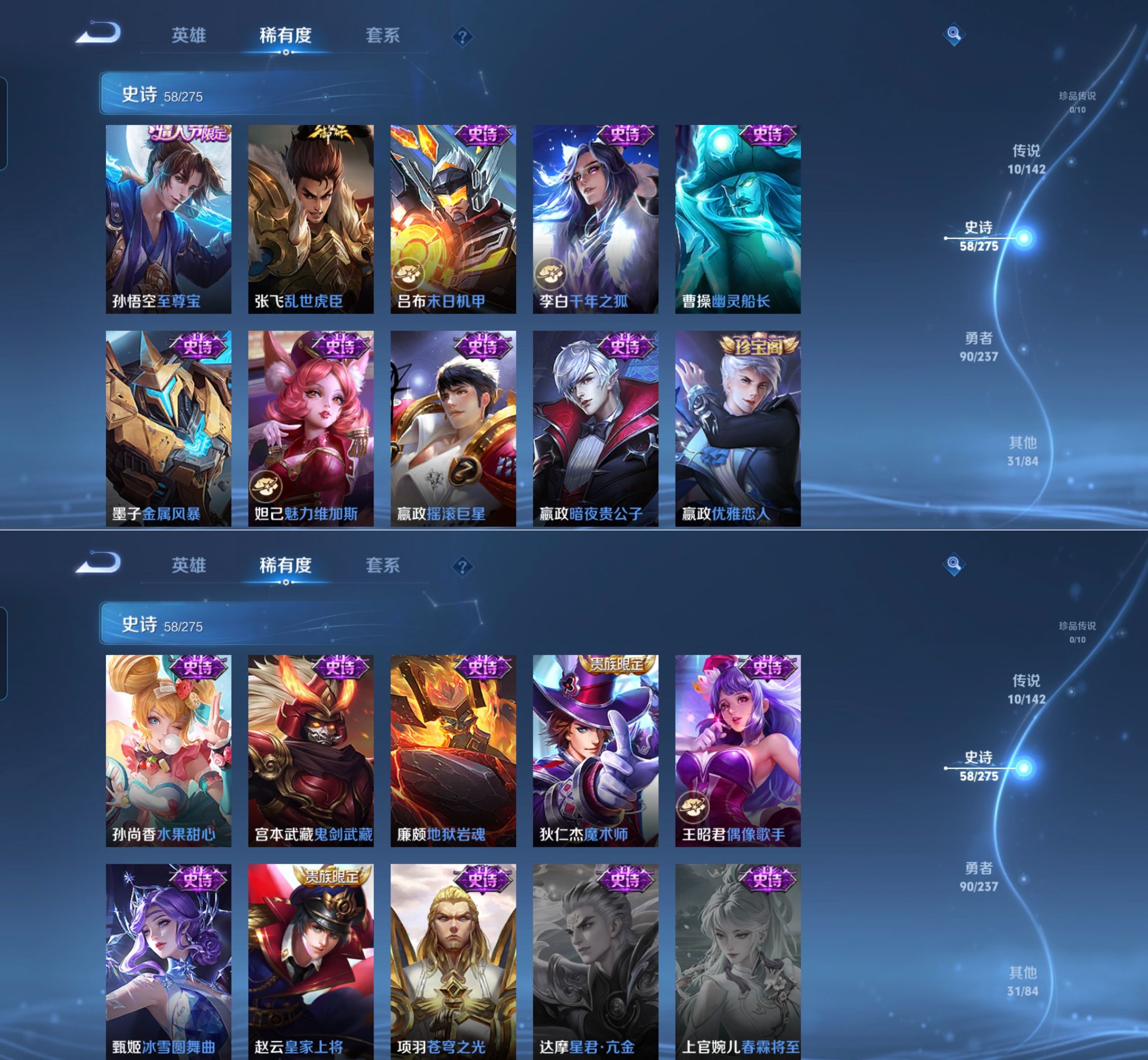 贵族等级:v6皮肤数:192传说品质10 荣耀典藏1 情人节限定1 生肖限定1 英雄数:127