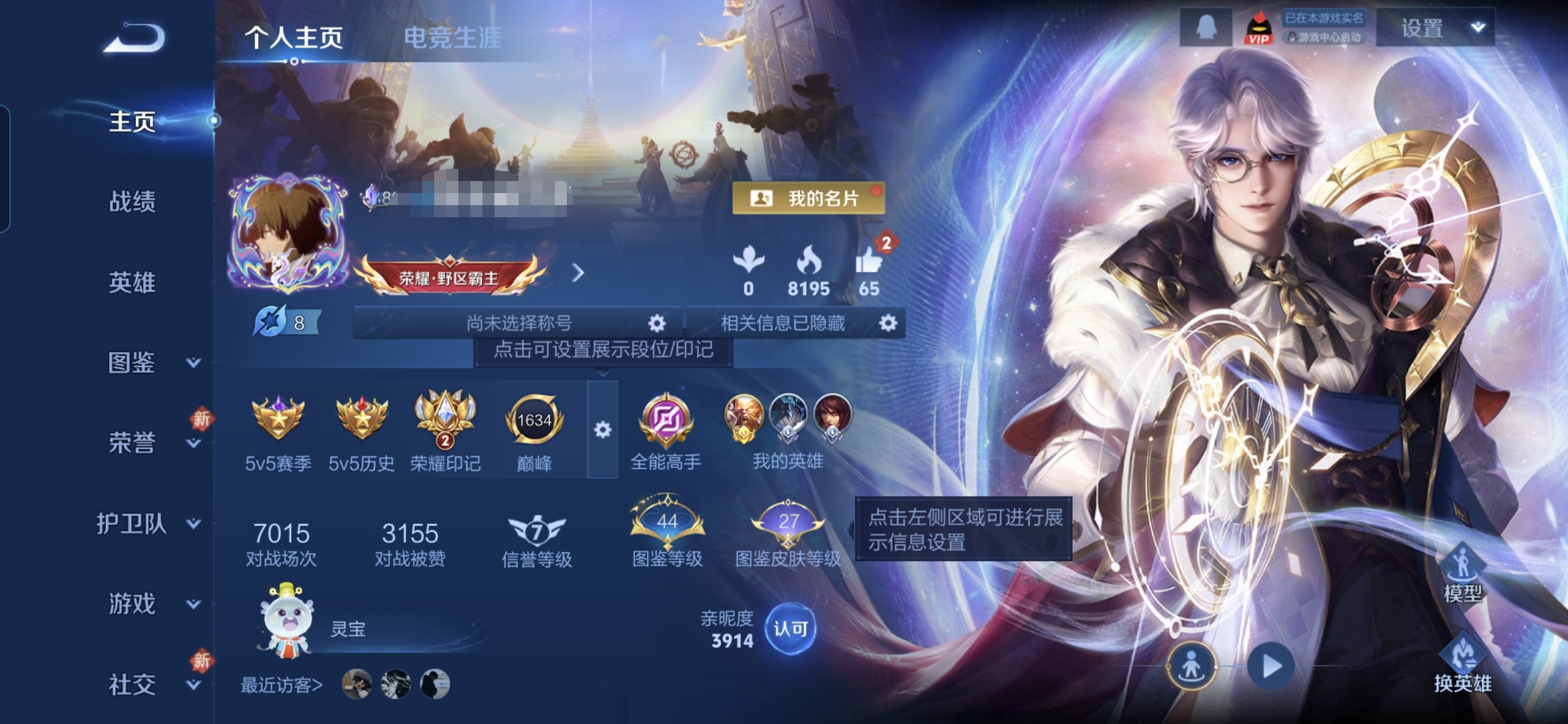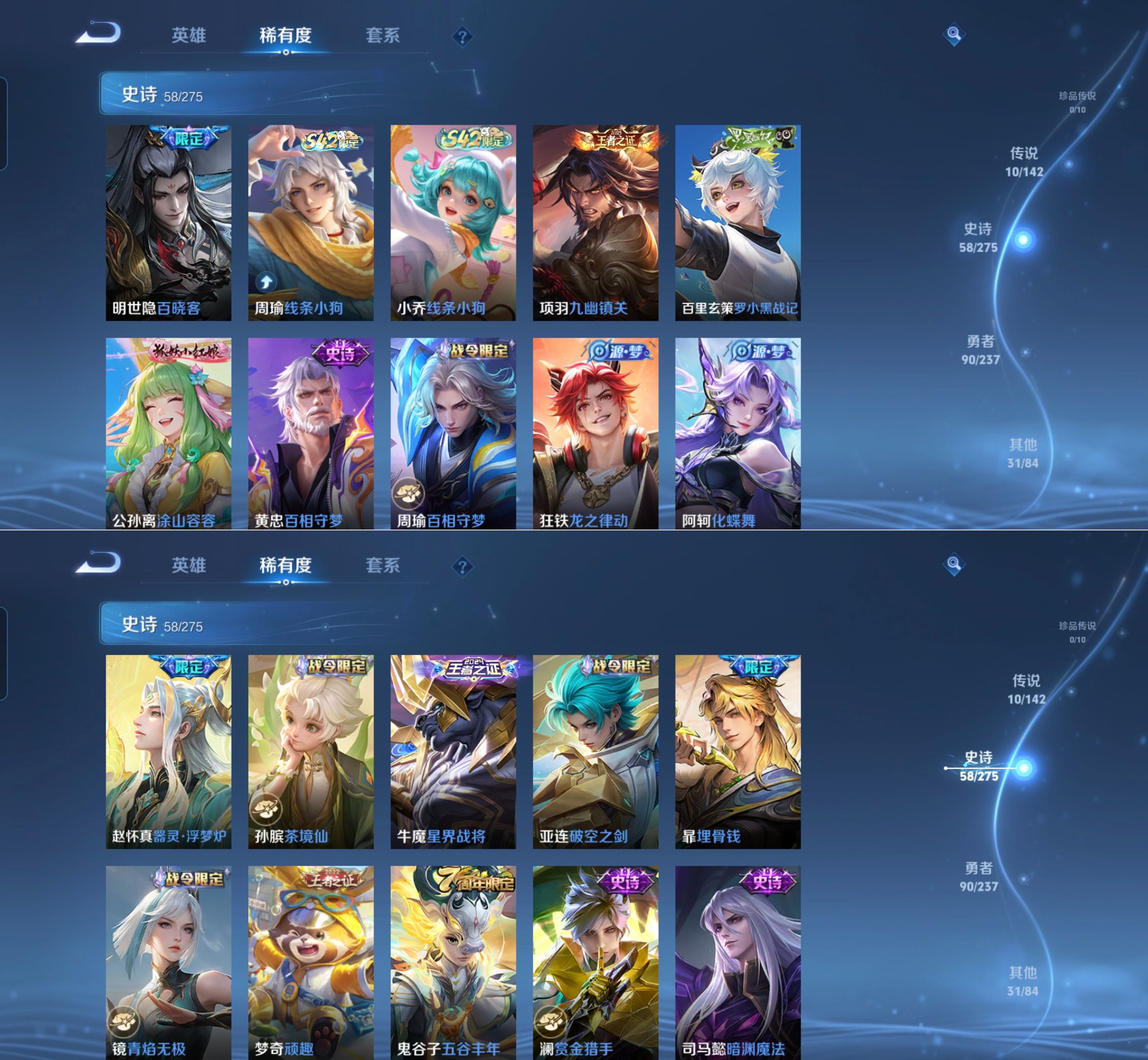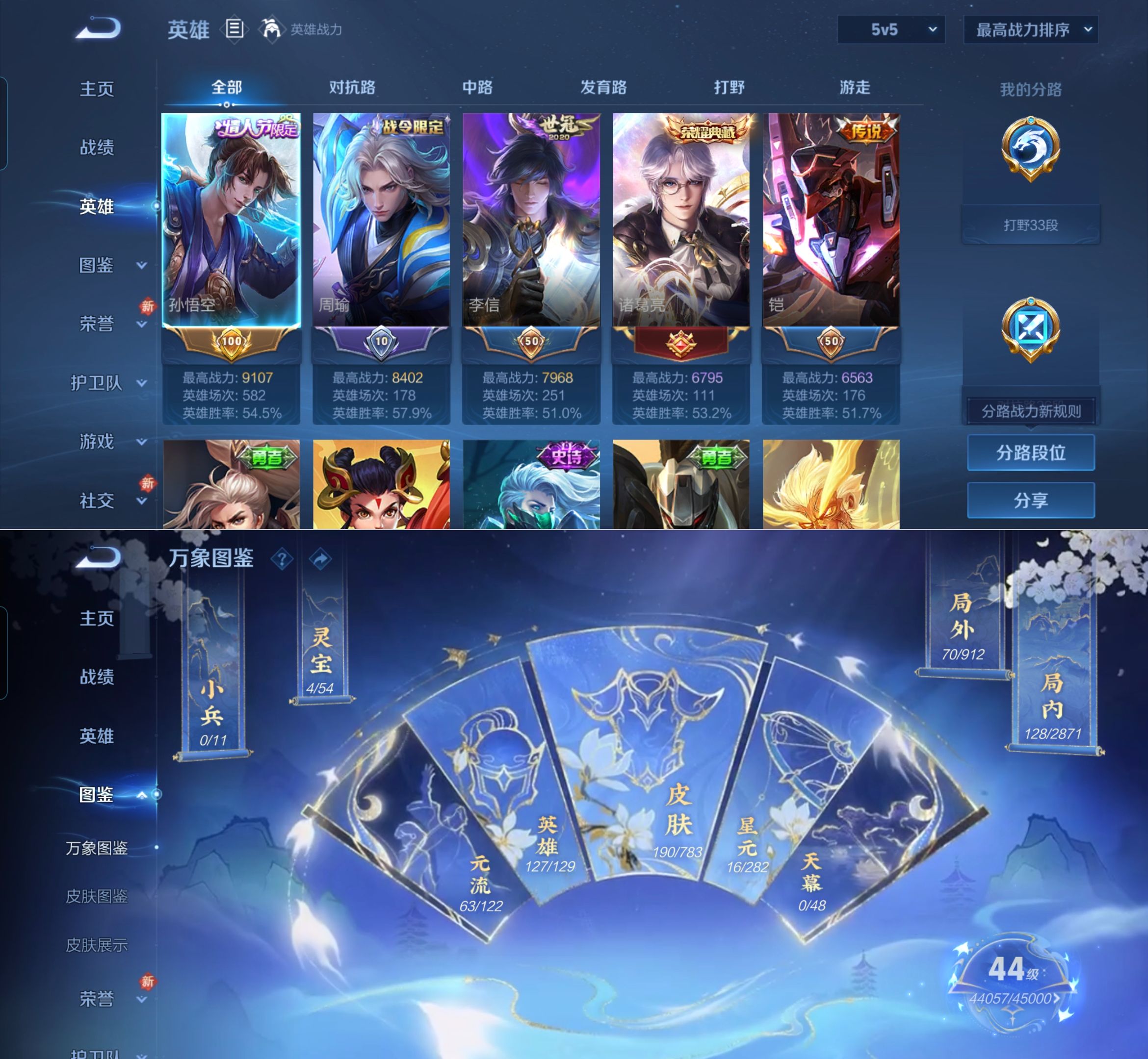 贵族等级:v6皮肤数:192传说品质10 荣耀典藏1 情人节限定1 生肖限定1 英雄数:127