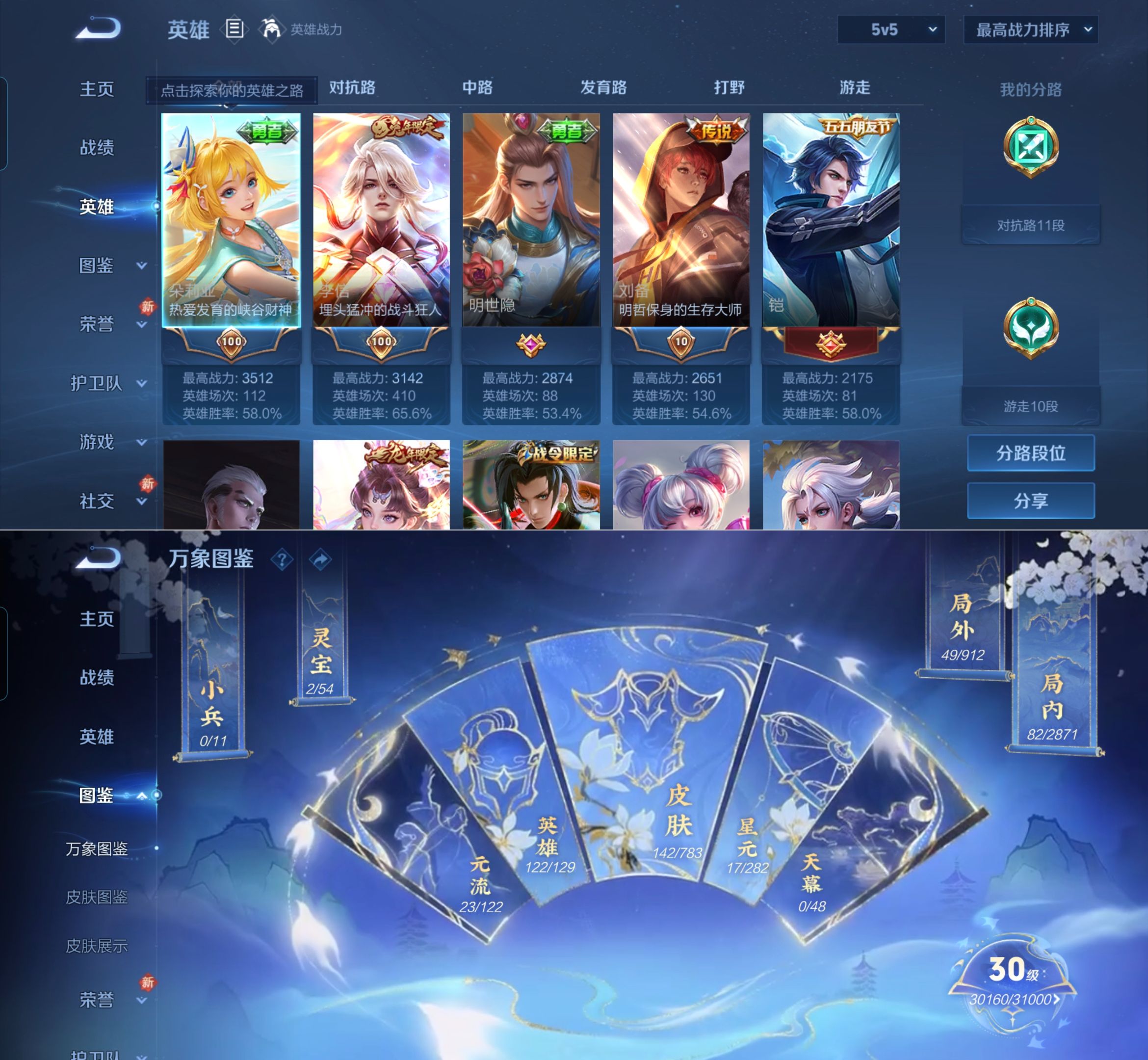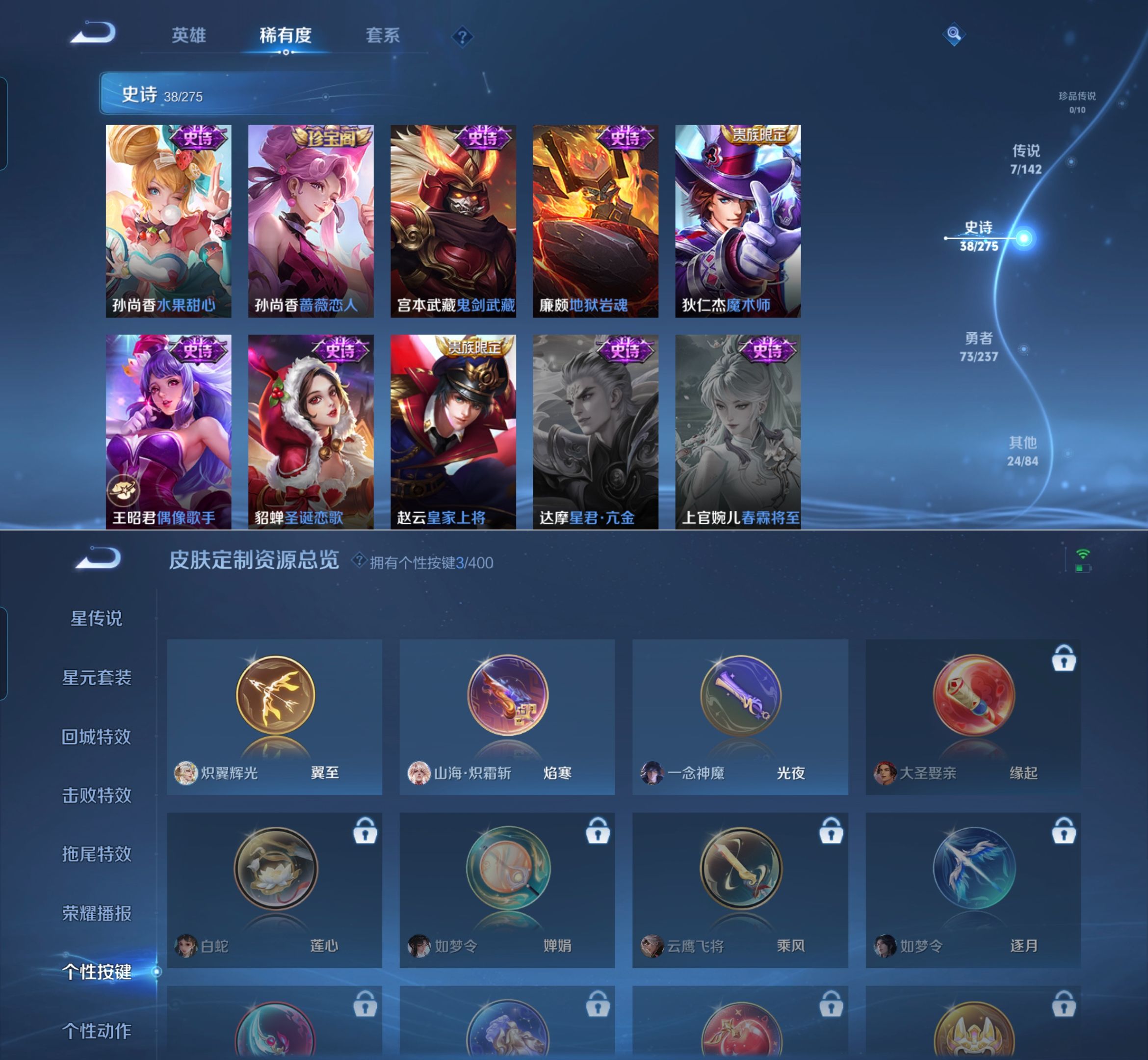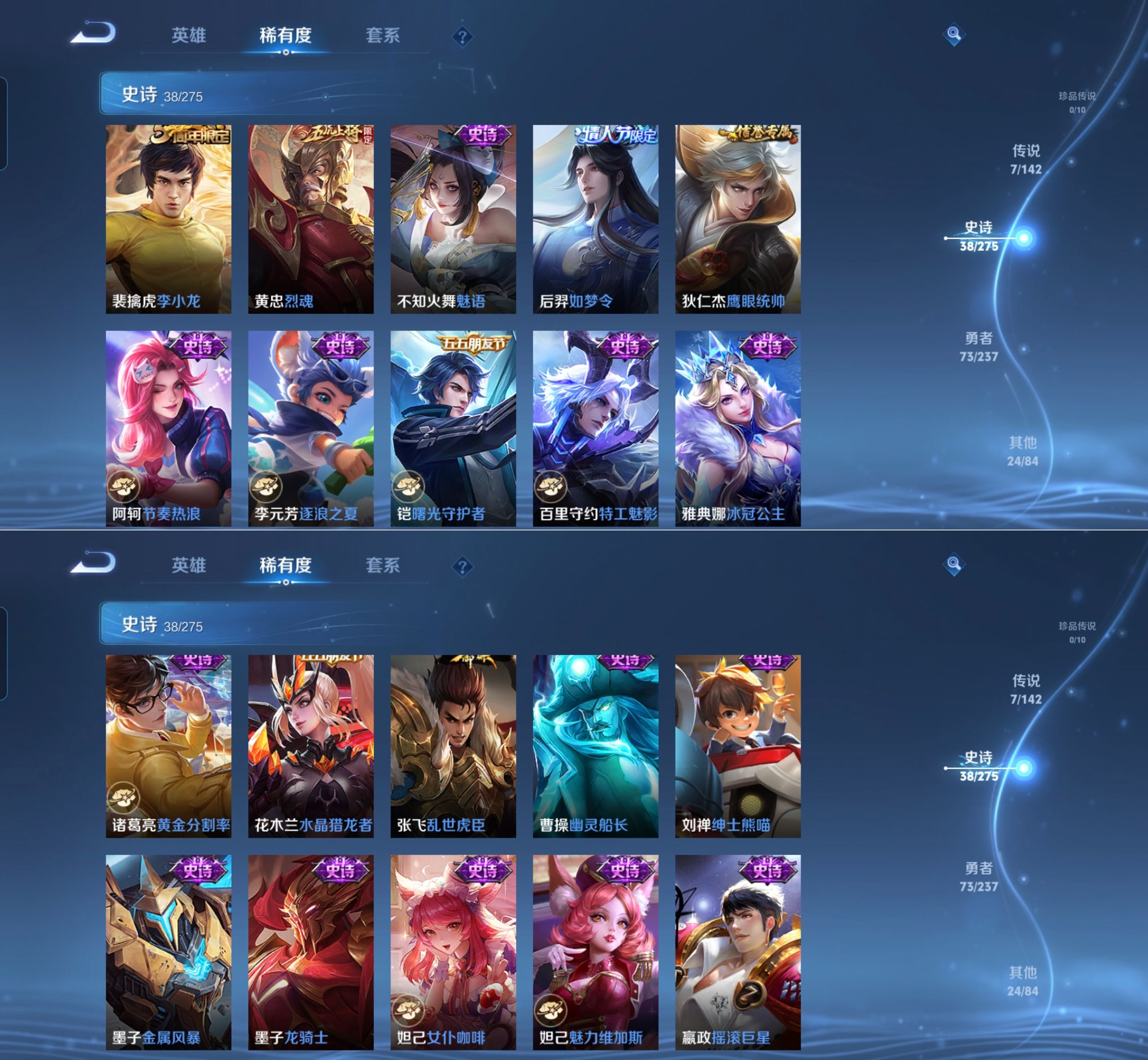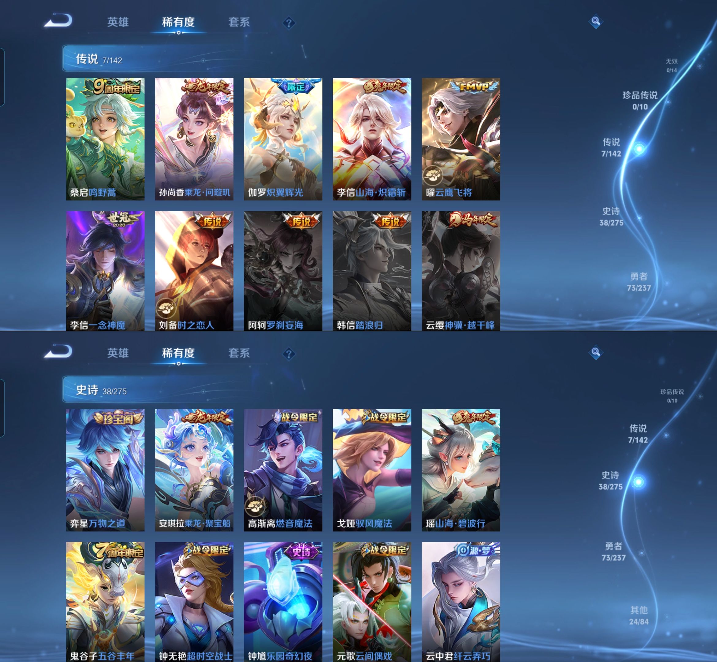 贵族等级:v6皮肤数:142情人节限定1 传说品质7 生肖限定4 英雄数:122