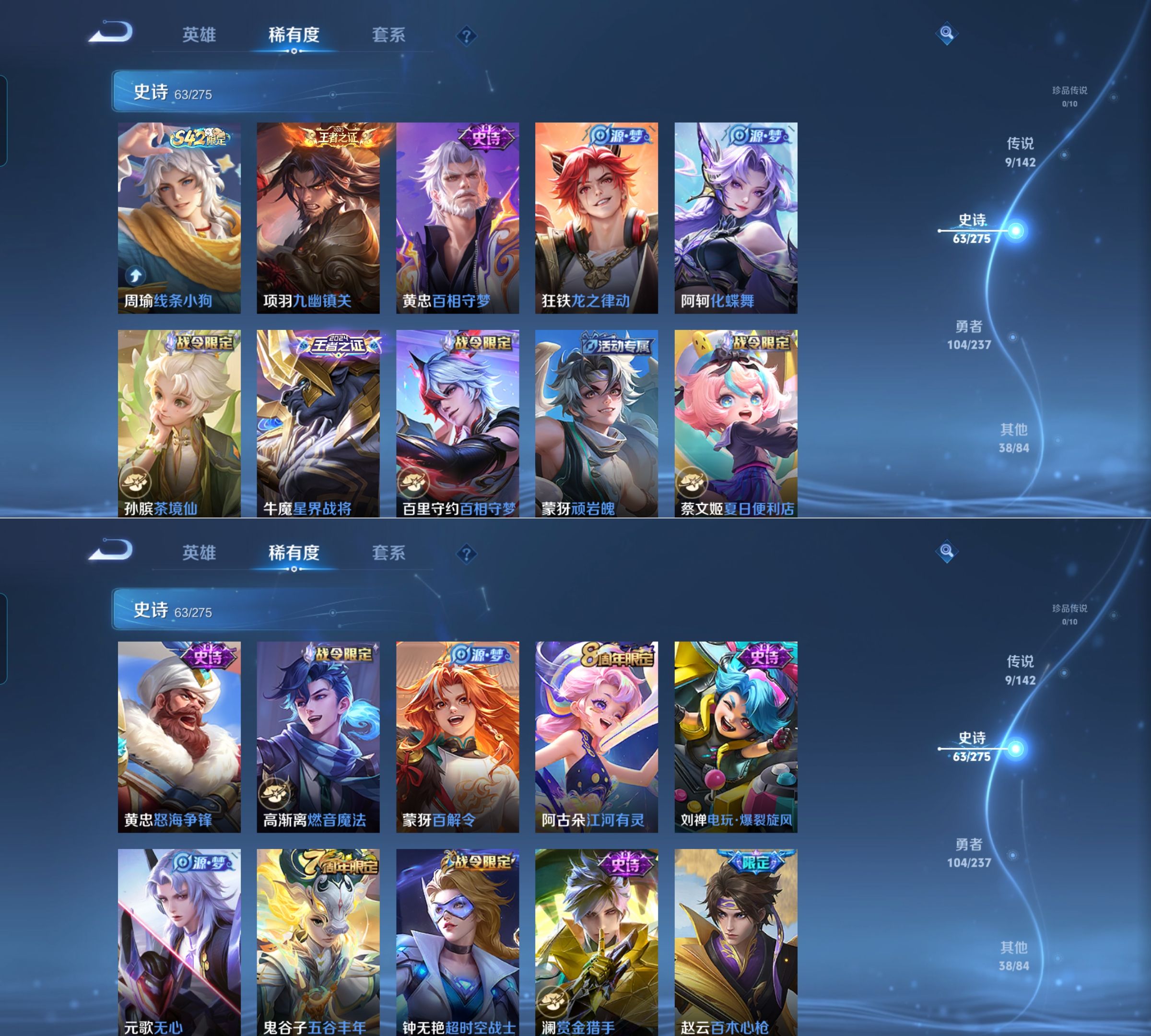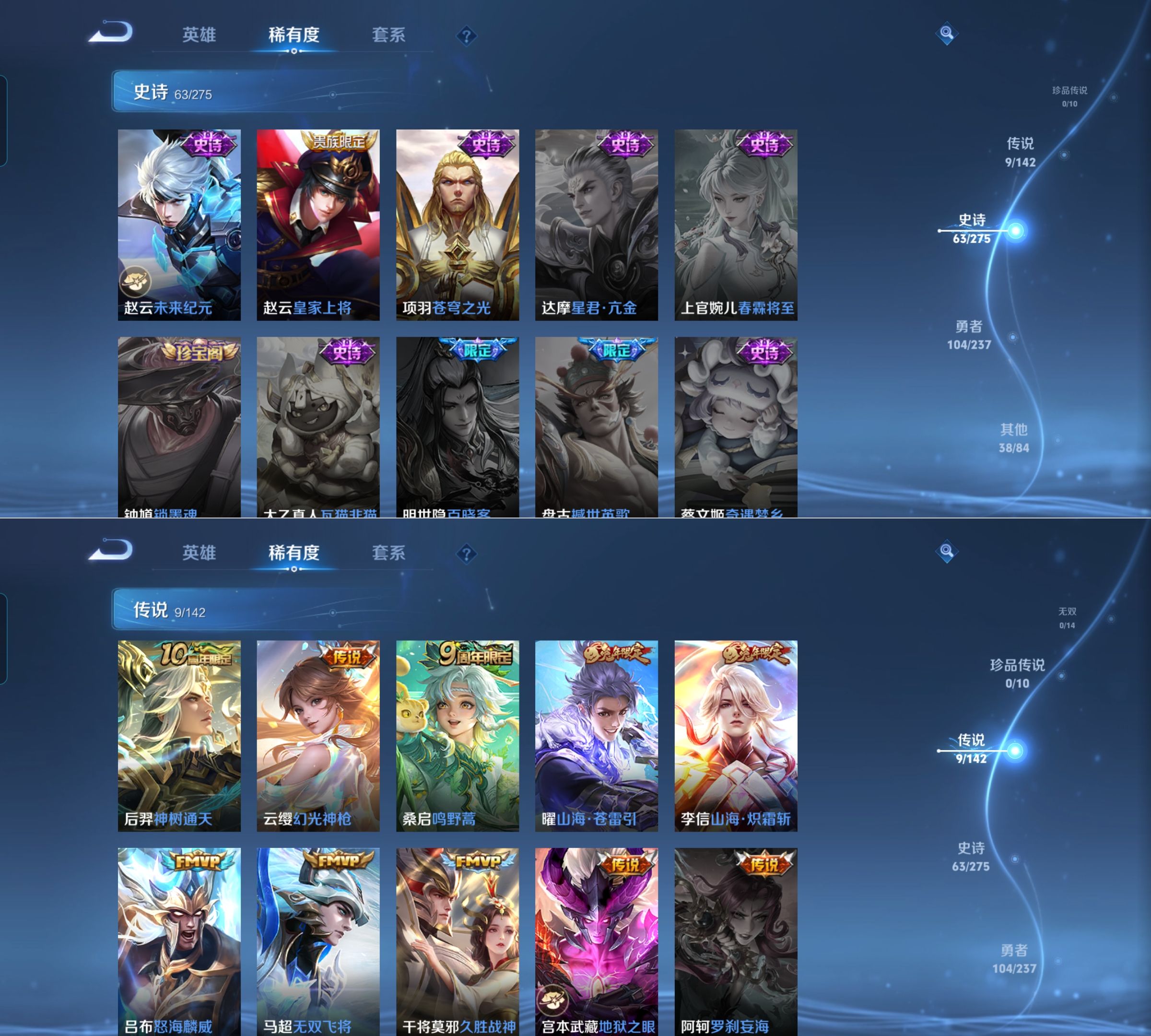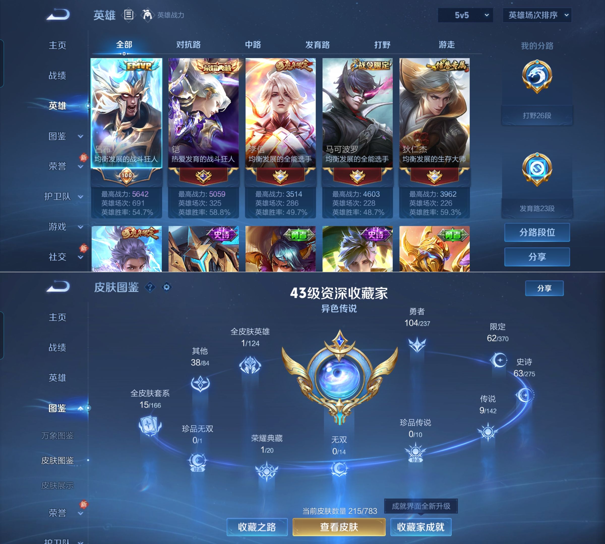 贵族等级:v6皮肤数:215传说品质9 生肖限定2 荣耀典藏1 英雄数:128