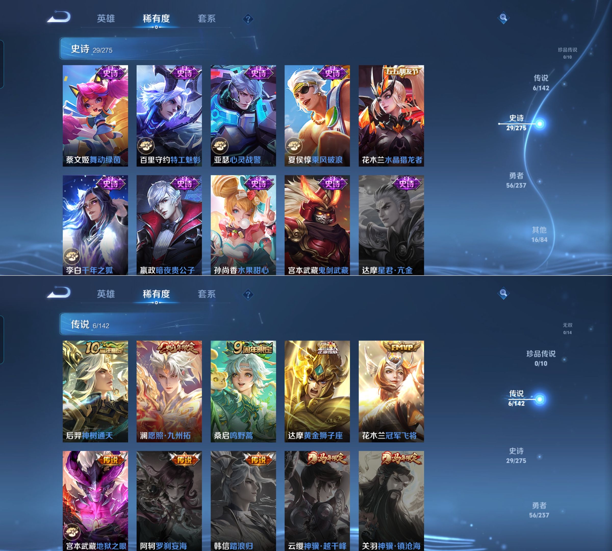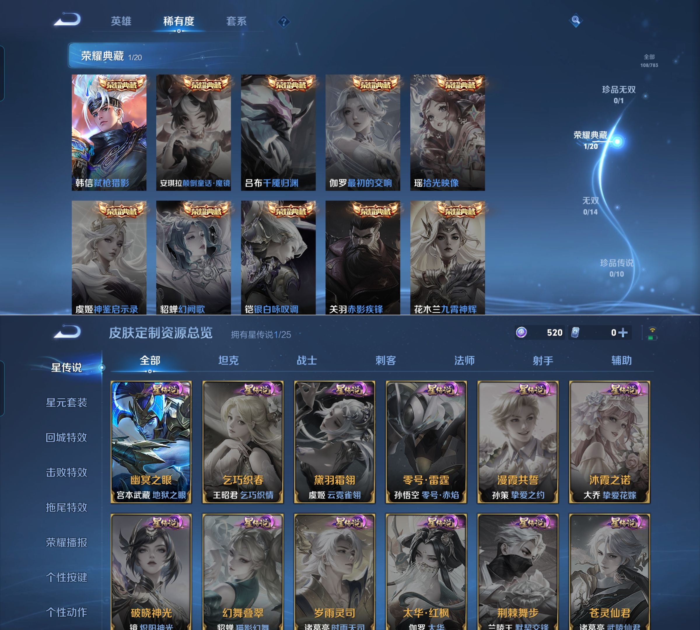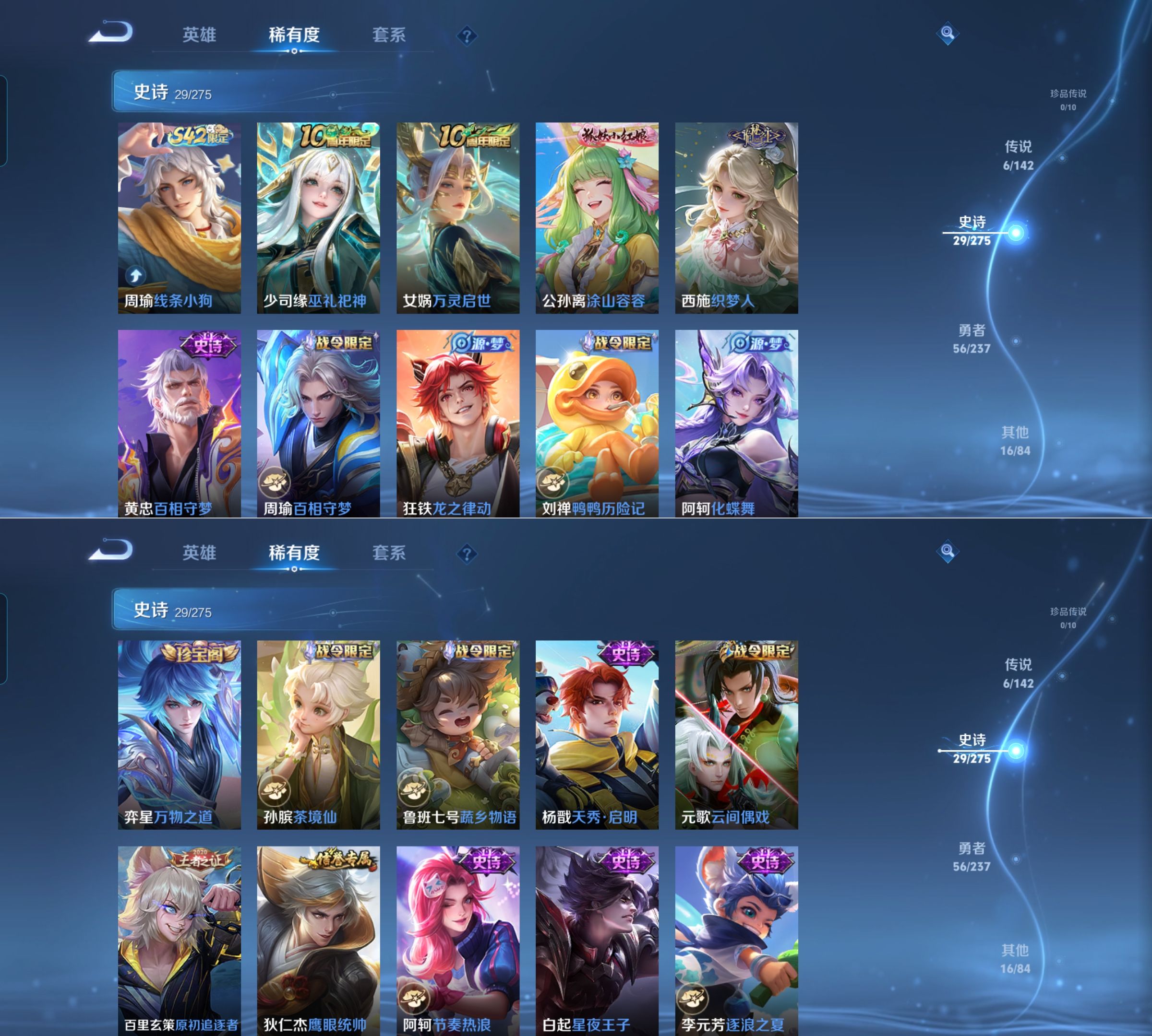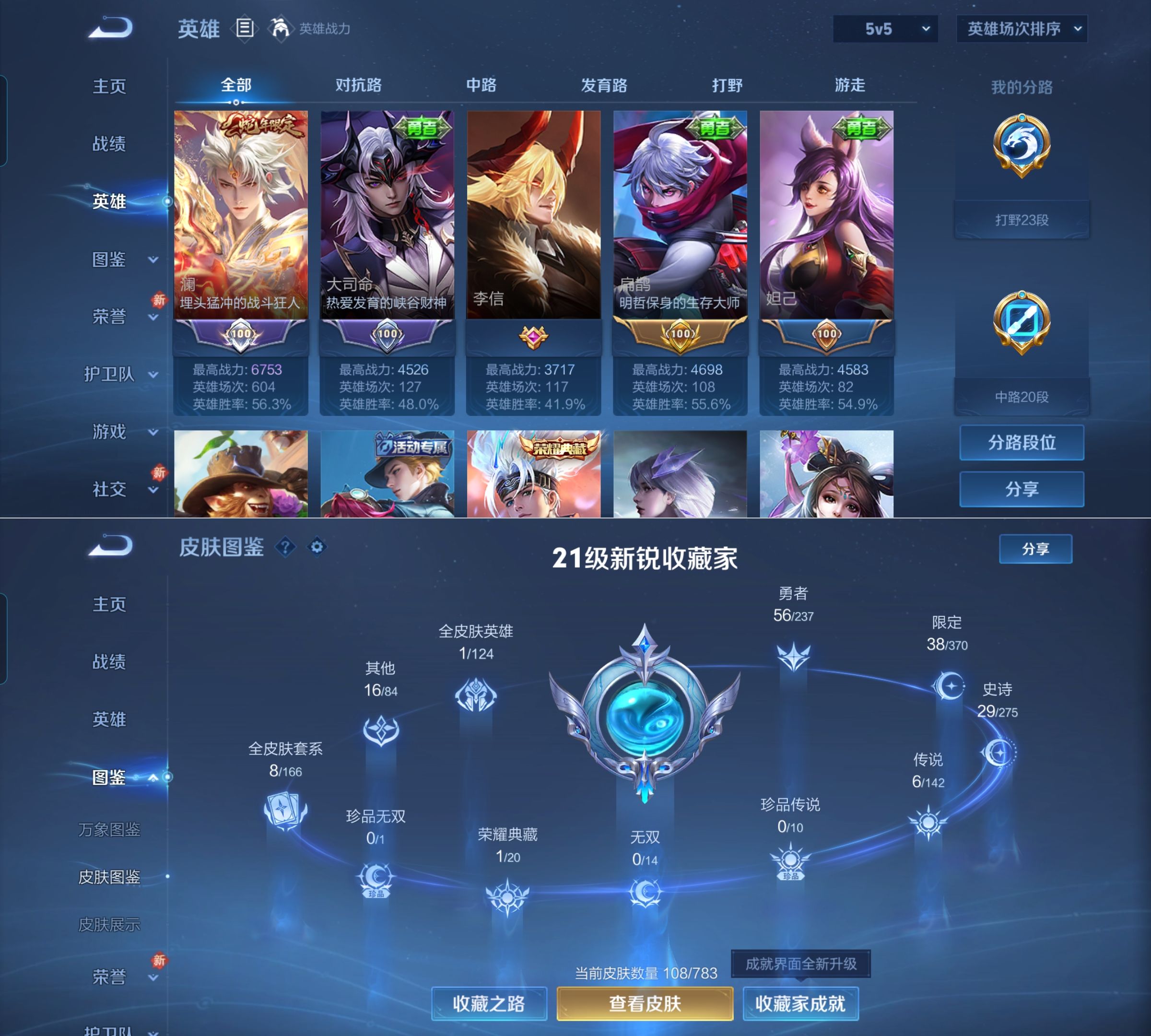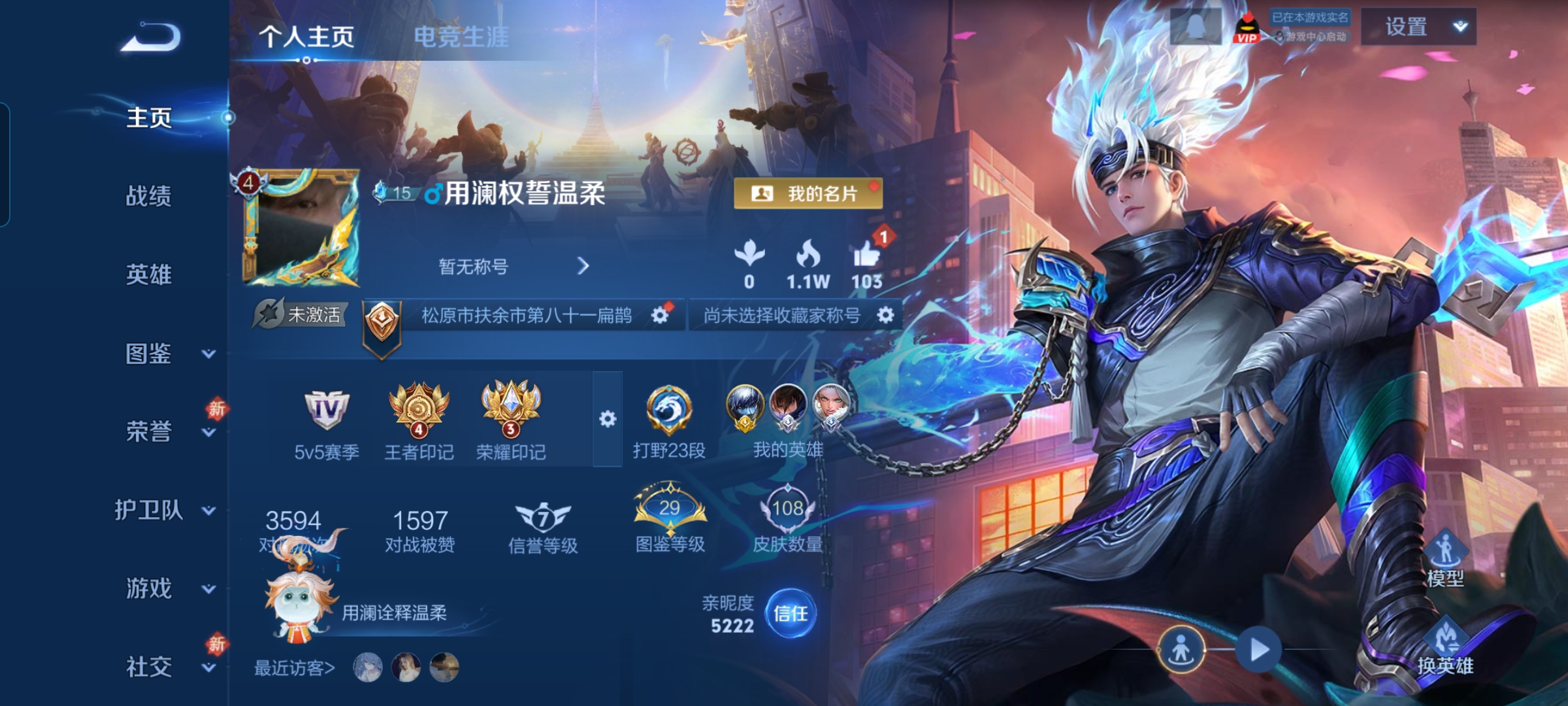 贵族等级:v6皮肤数:108传说品质6 生肖限定1 荣耀典藏1 英雄数:124