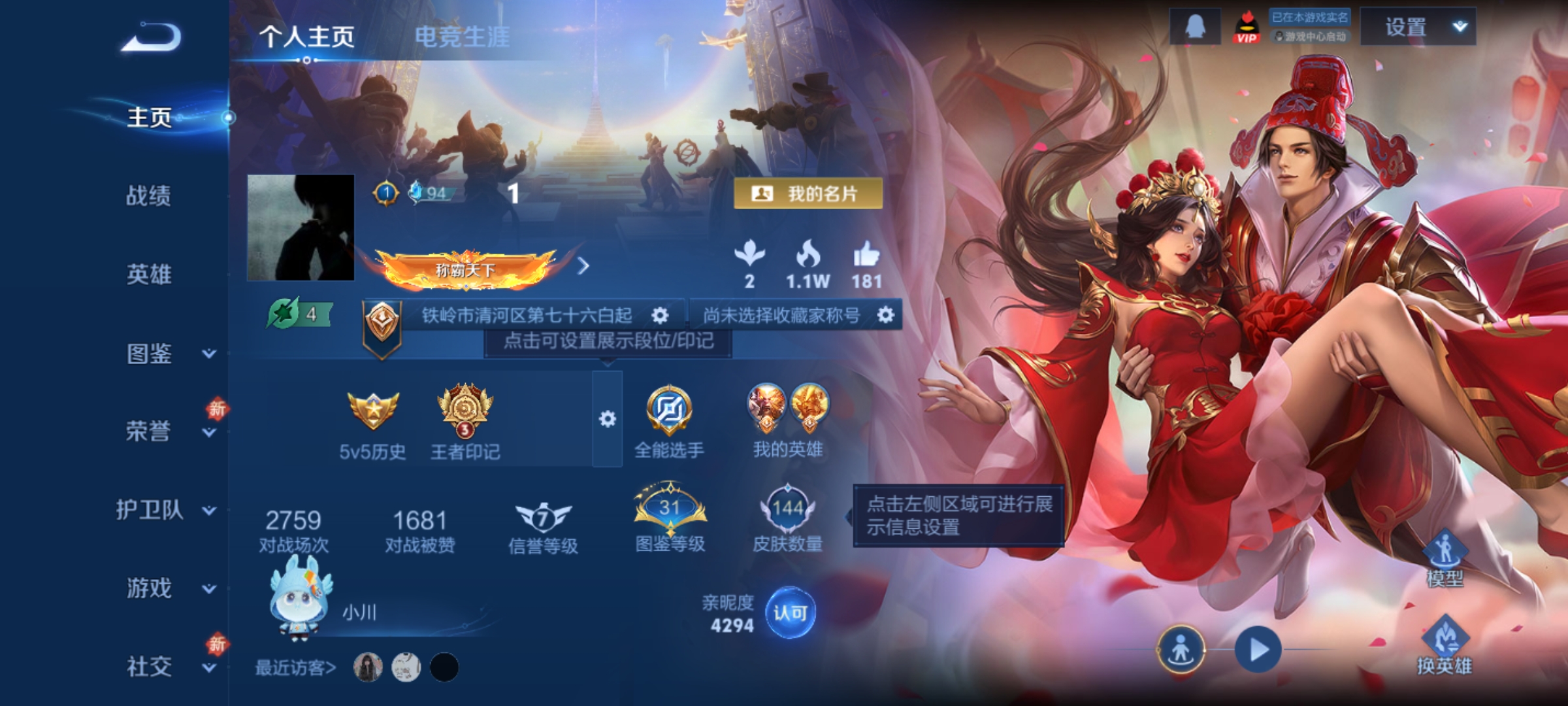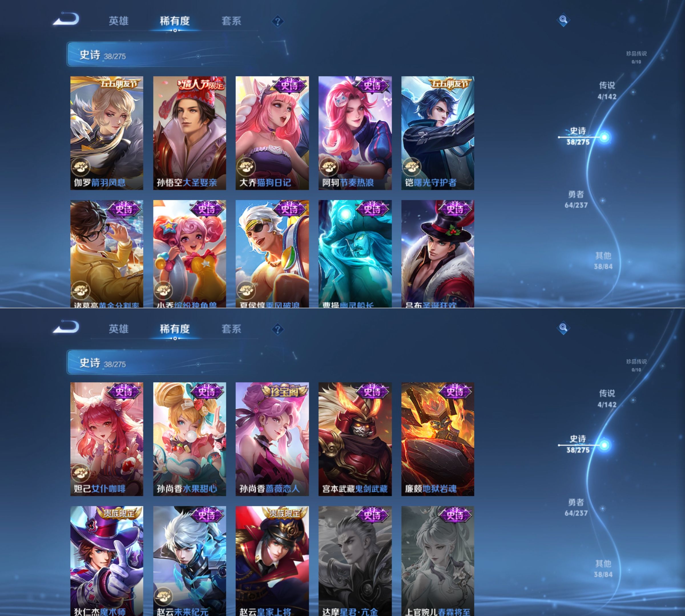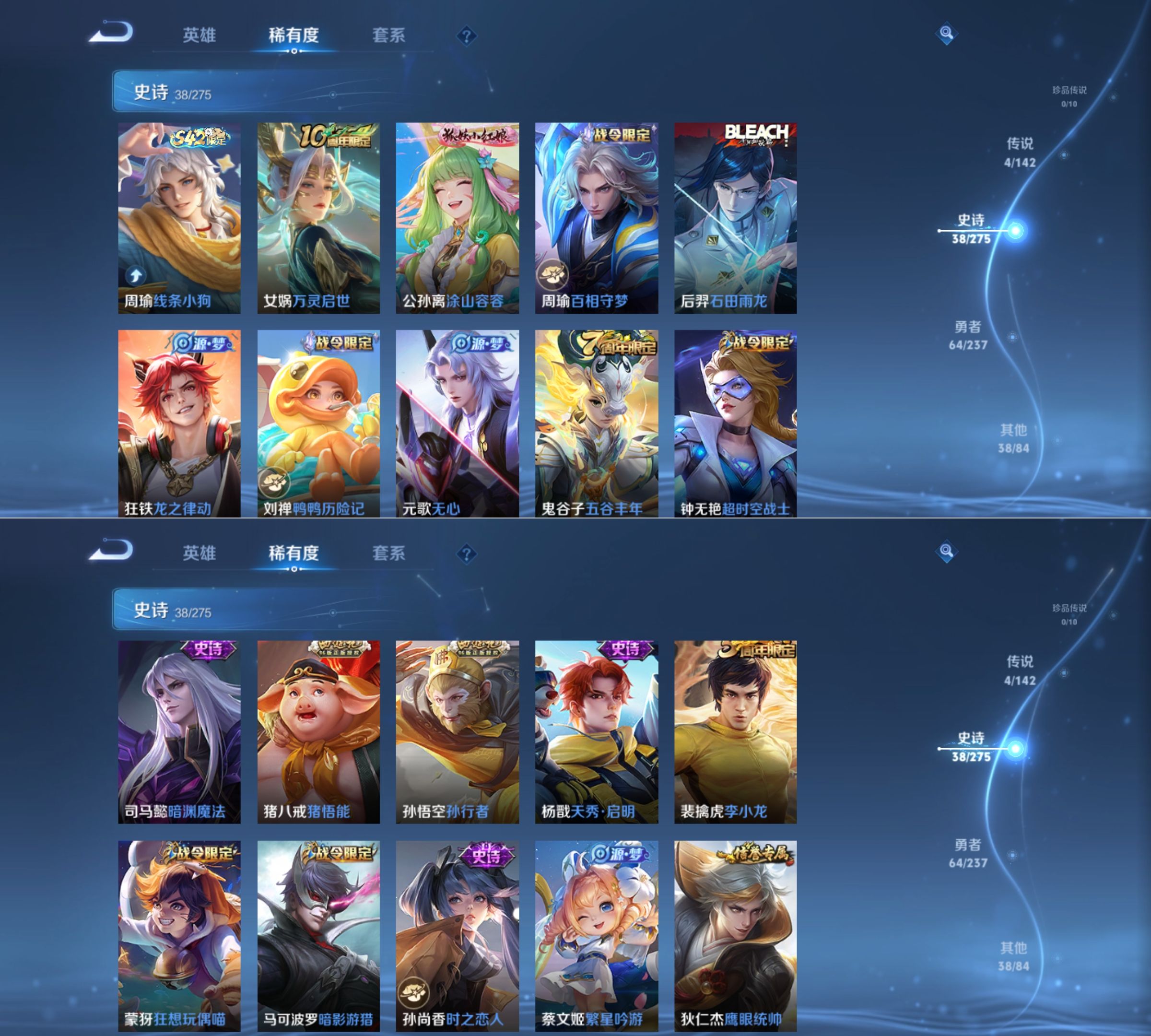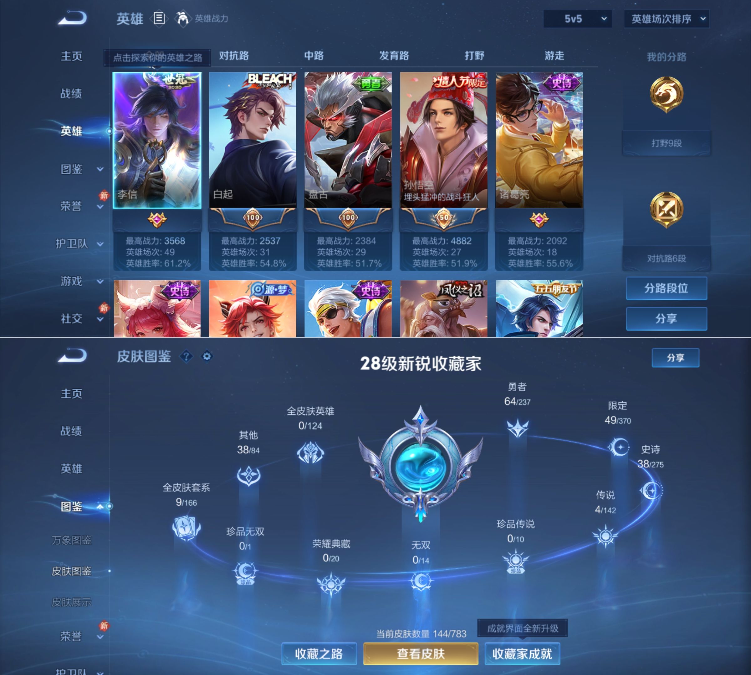 贵族等级:v6皮肤数:144传说品质4 情人节限定1 生肖限定1 英雄数:126