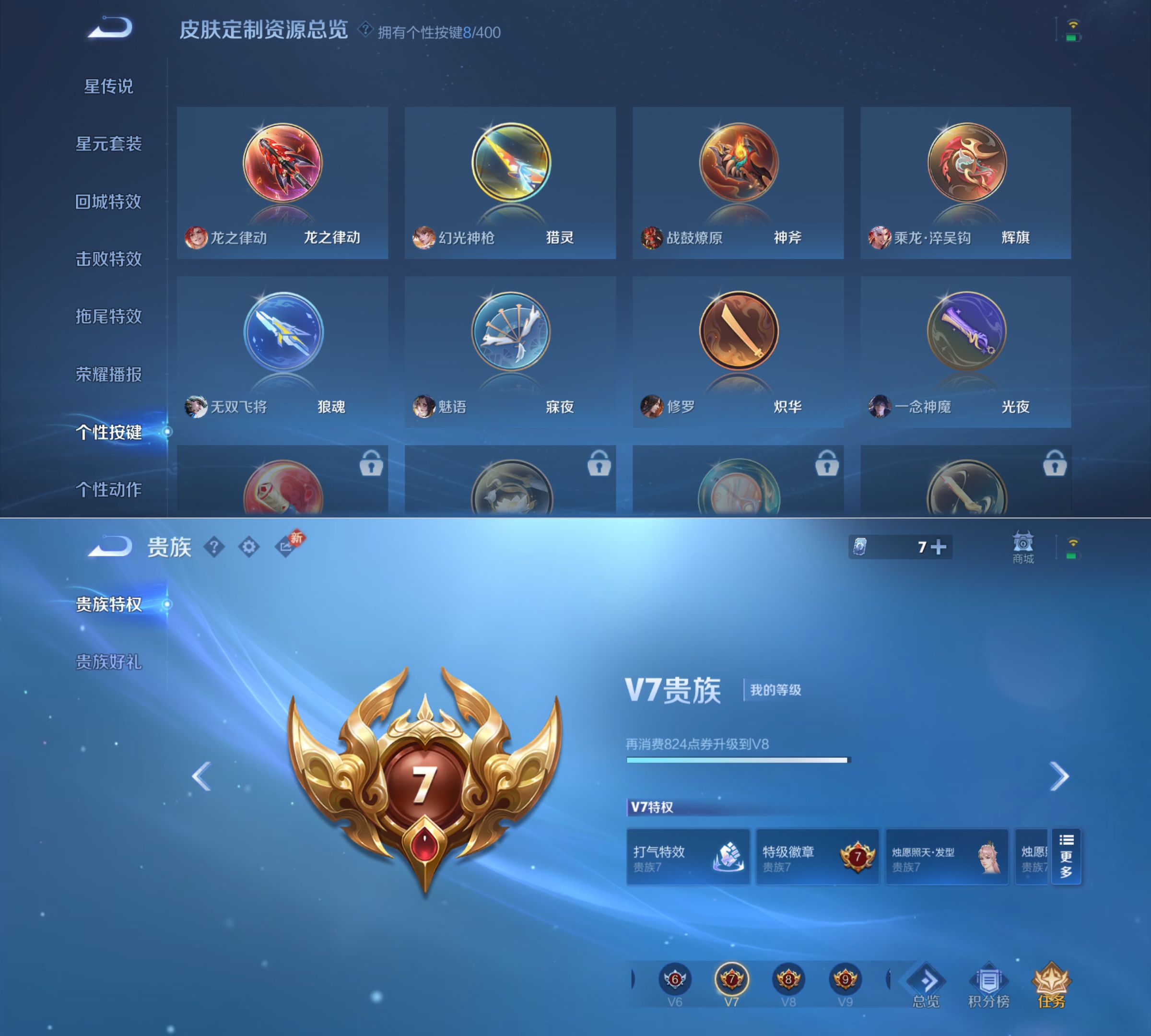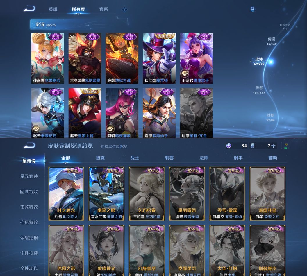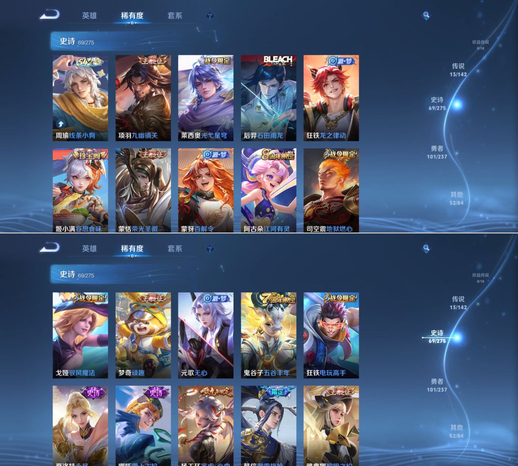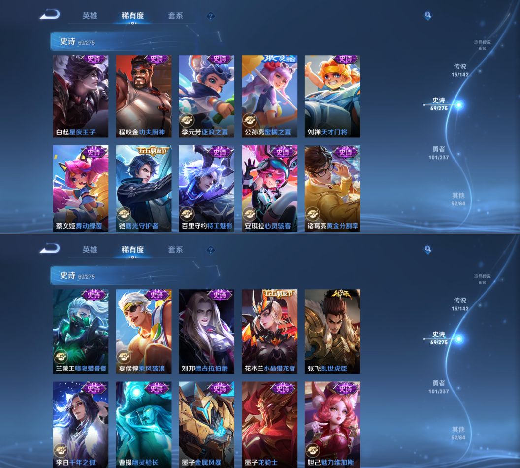 贵族等级:v7皮肤数:235传说品质13 生肖限定5 英雄数:127
