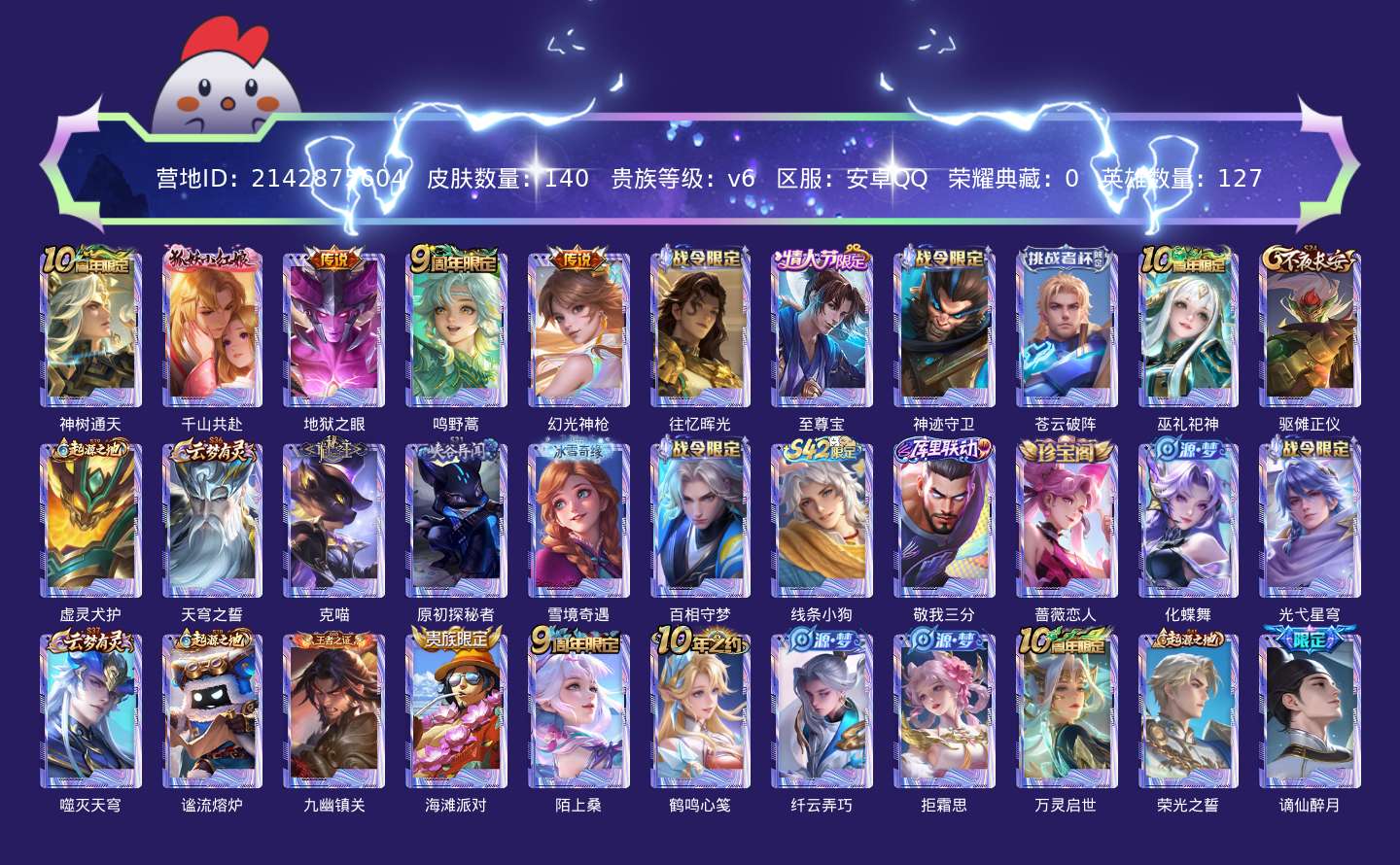 贵族等级:v6皮肤数:140传说品质5 情人节限定1 英雄数:127