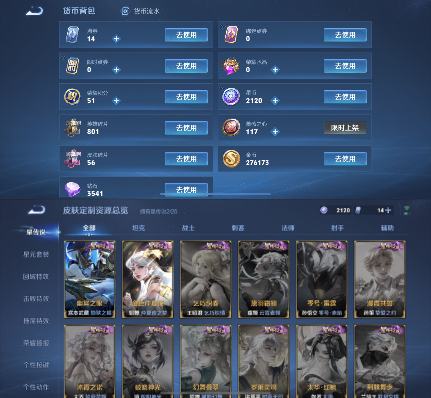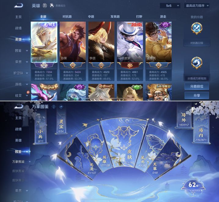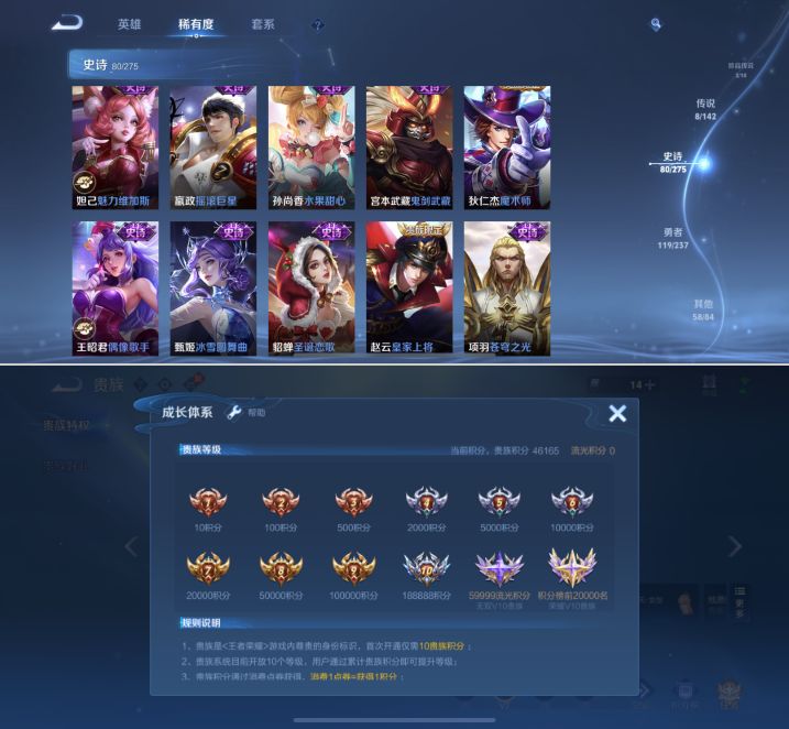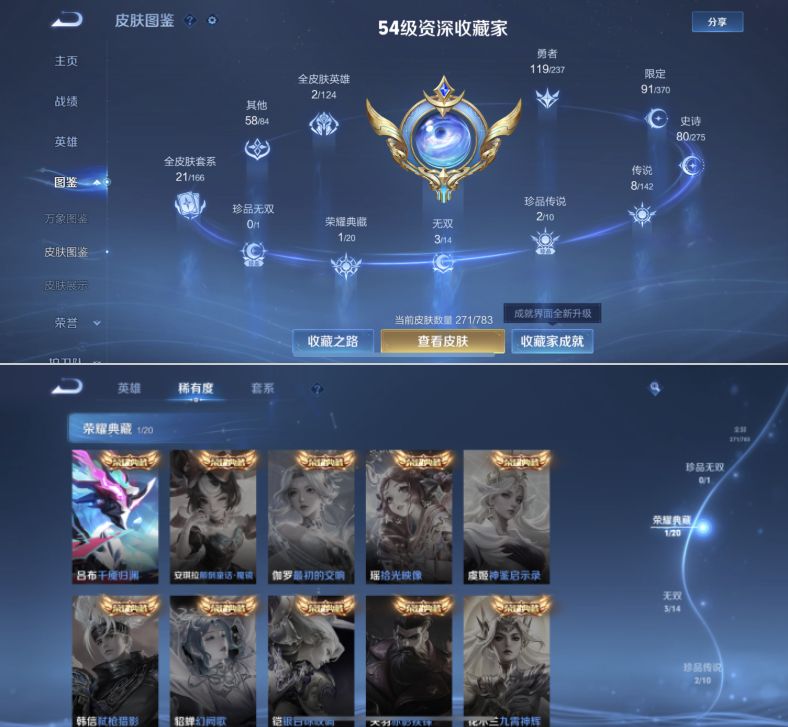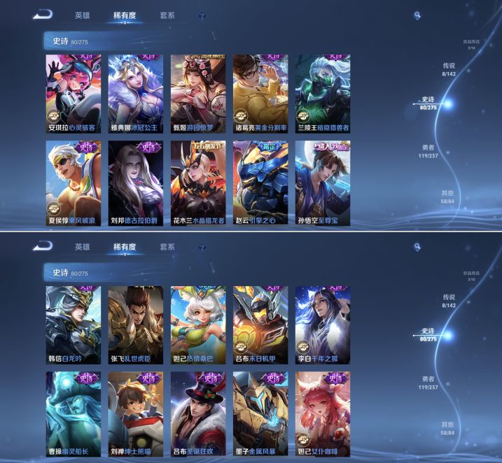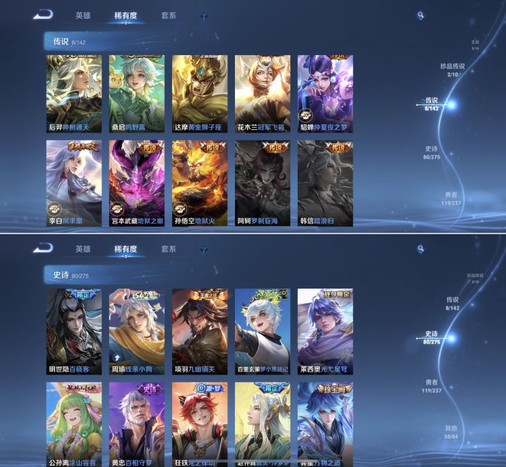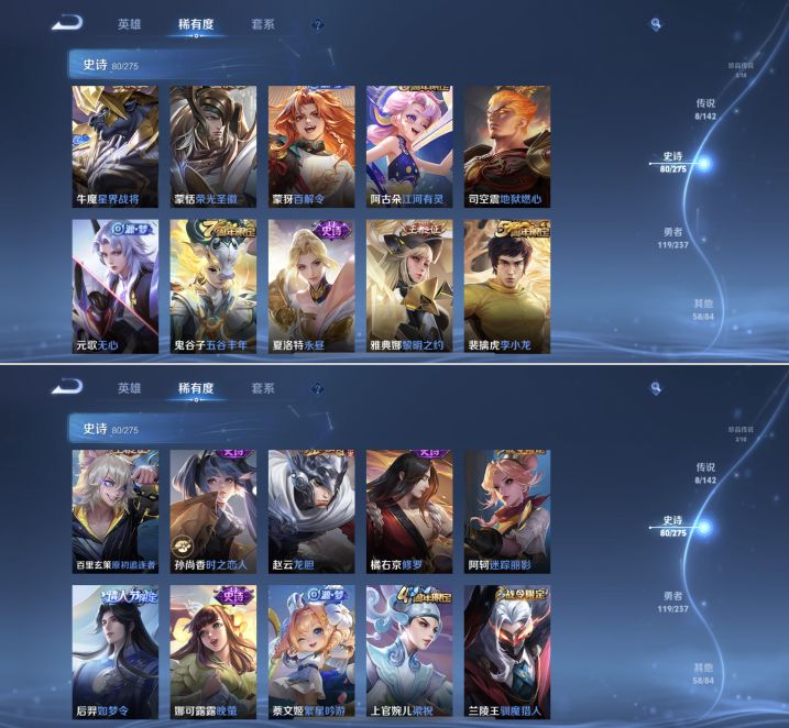 贵族等级:v7皮肤数:271情人节限定4 传说品质8 无双3 荣耀典藏1 生肖限定4 珍品传说2 英雄数:127