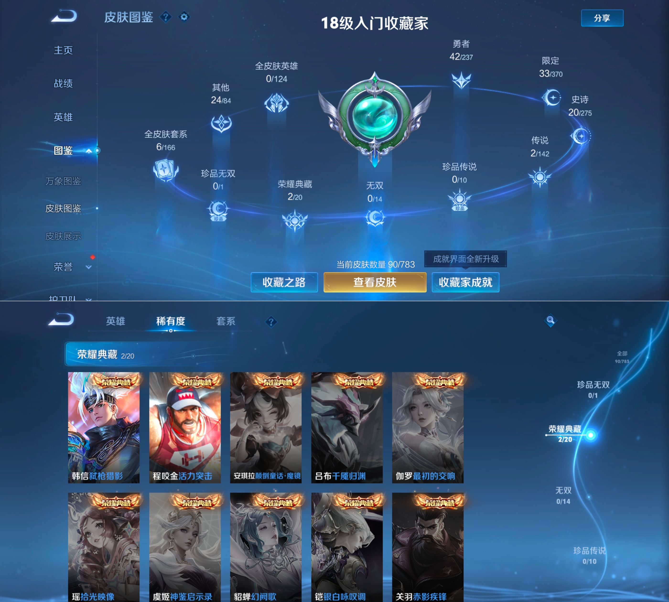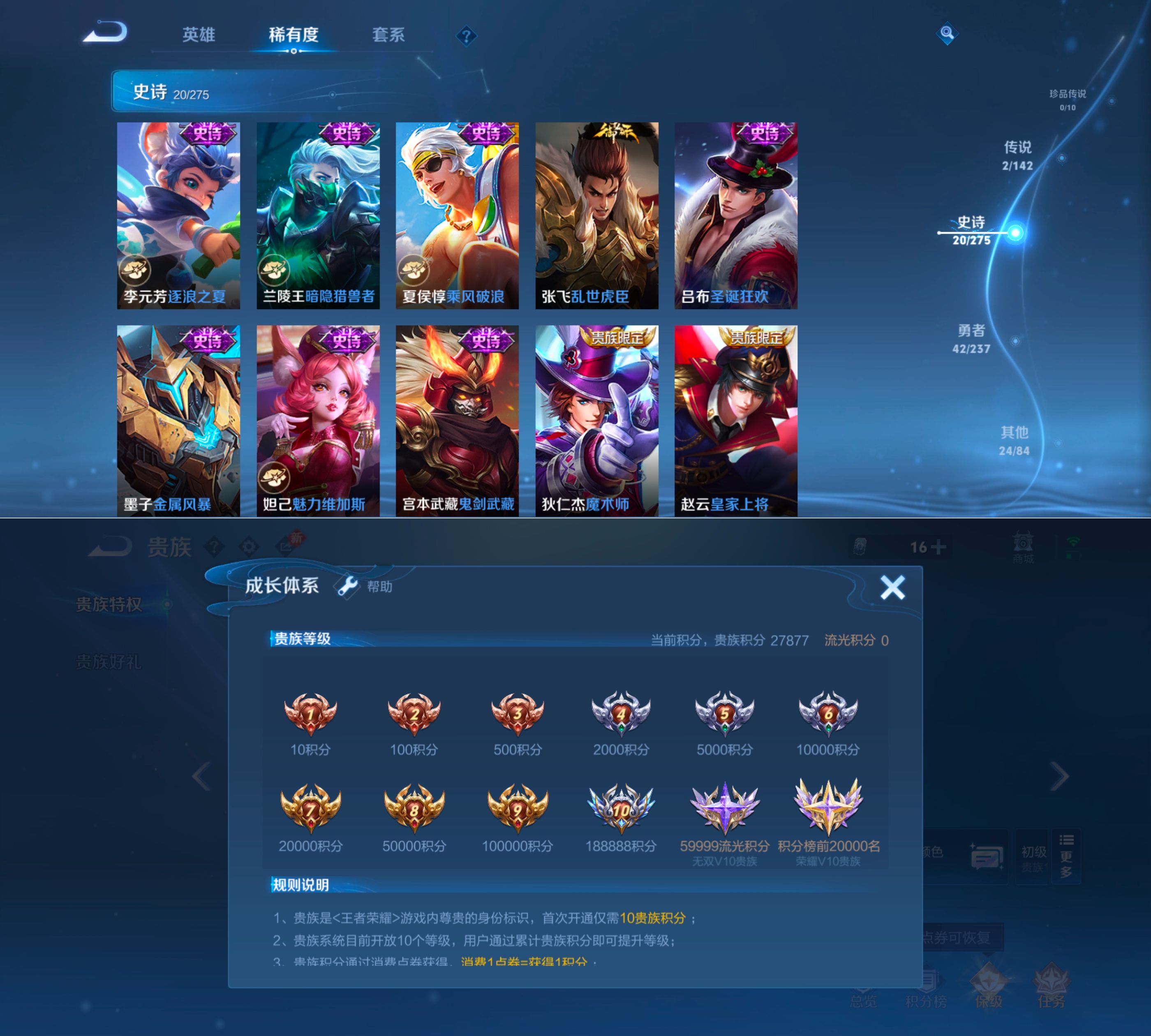 贵族等级:v7皮肤数:91传说品质2 荣耀典藏2 生肖限定1 英雄数:103
