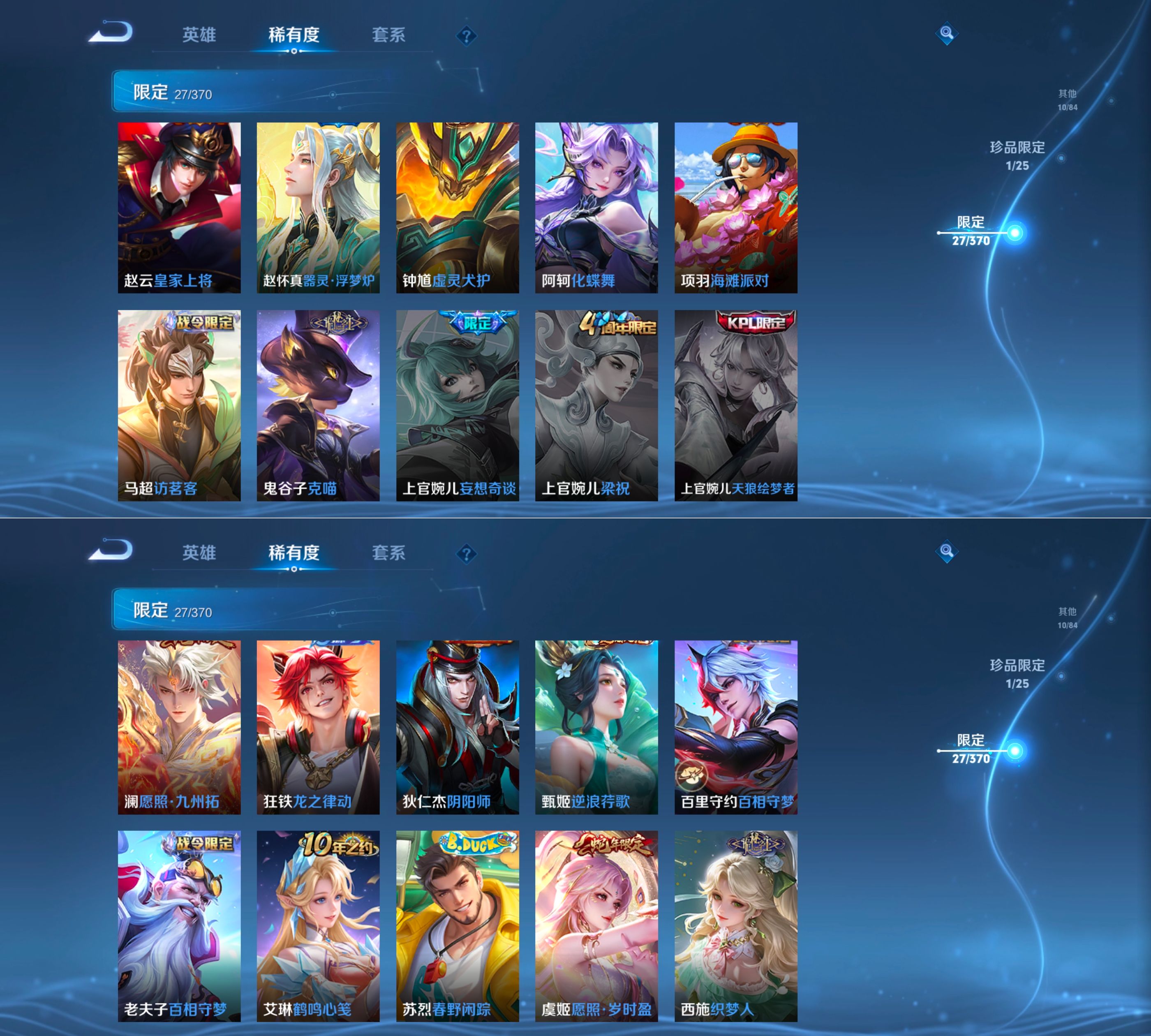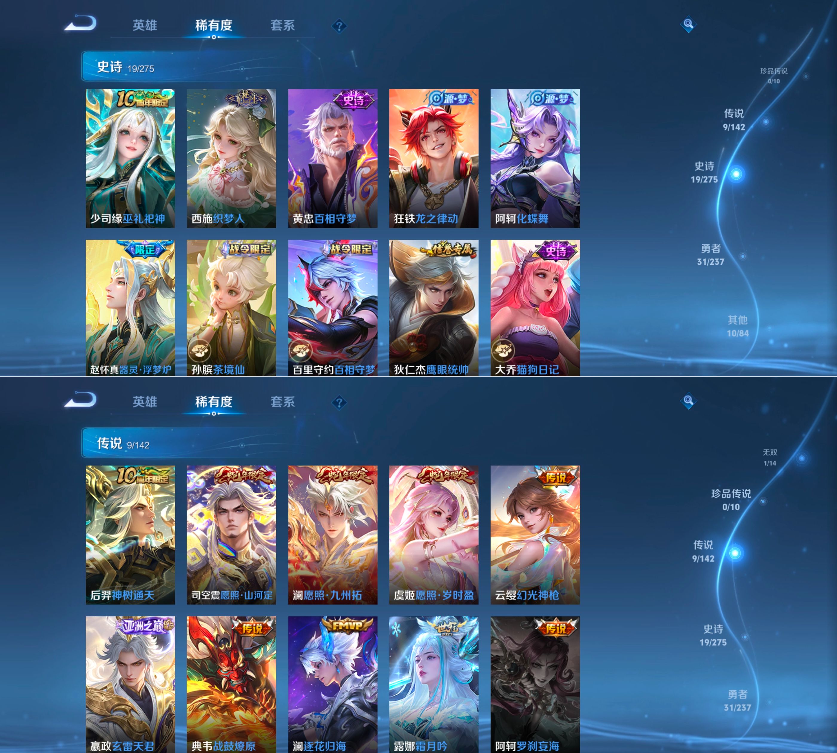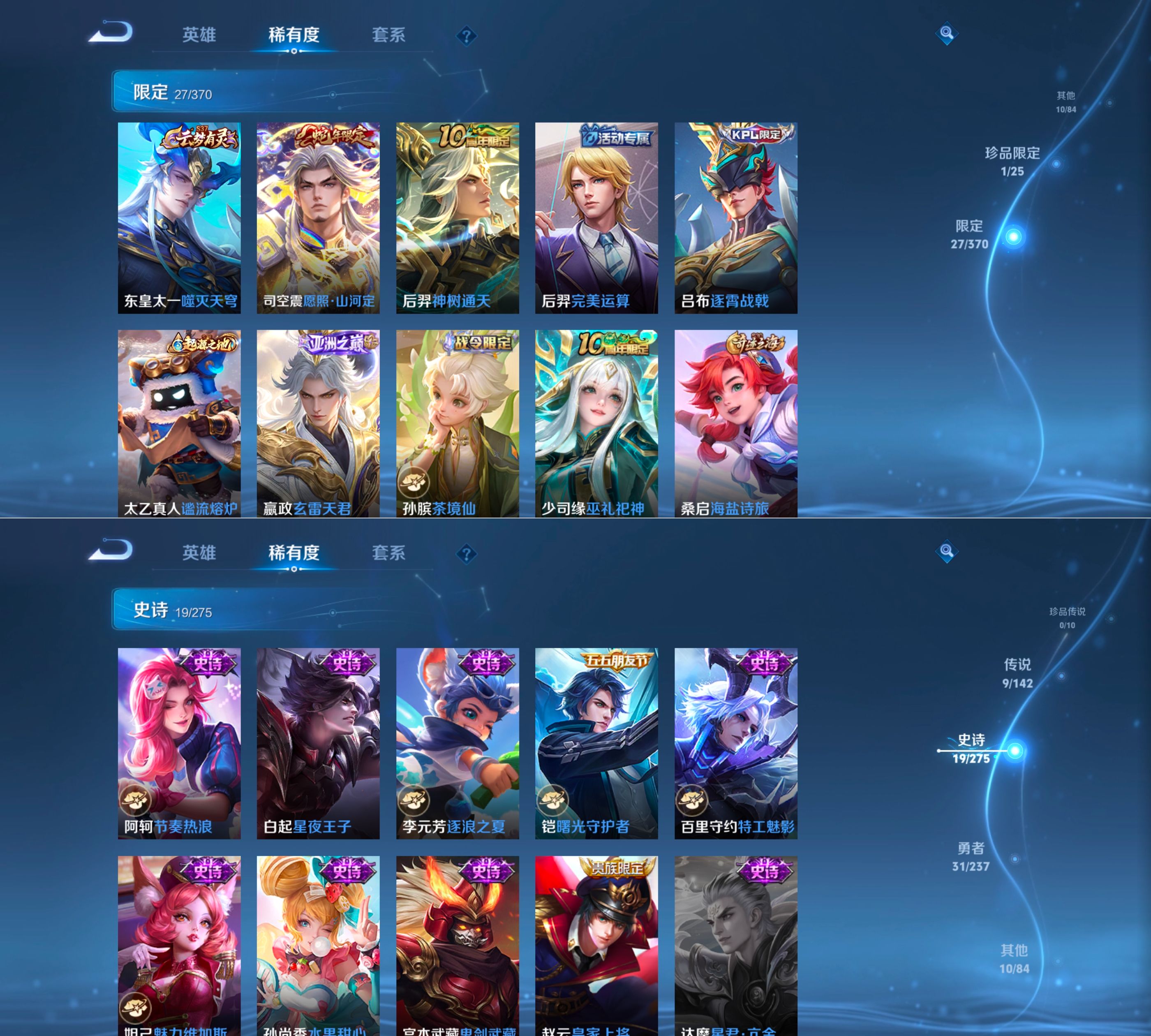 贵族等级:v5皮肤数:70传说品质9 生肖限定3 无双1 英雄数:89