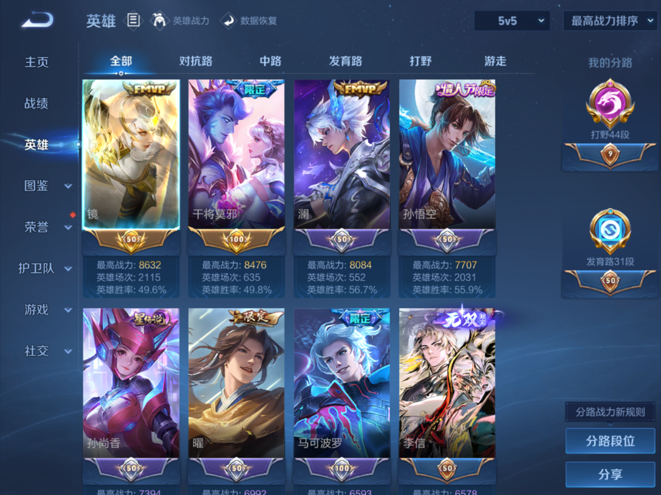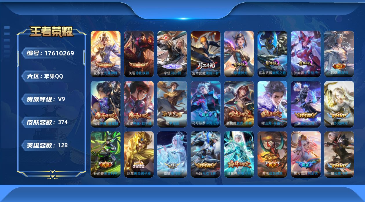 贵族等级:v9皮肤数:374传说品质22 荣耀典藏2 生肖限定7 情人节限定2 珍品传说1 无双1 英雄数:128