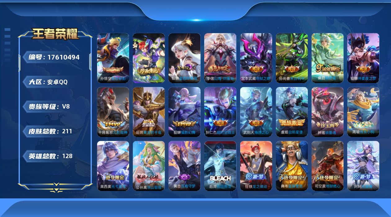 贵族等级:v8皮肤数:211传说品质11 荣耀典藏1 生肖限定2 珍品传说1 英雄数:128