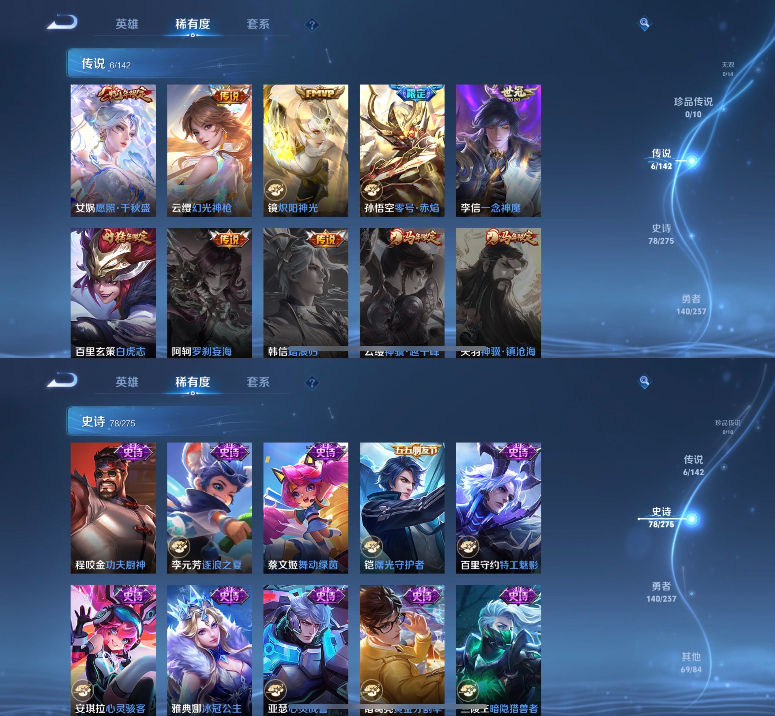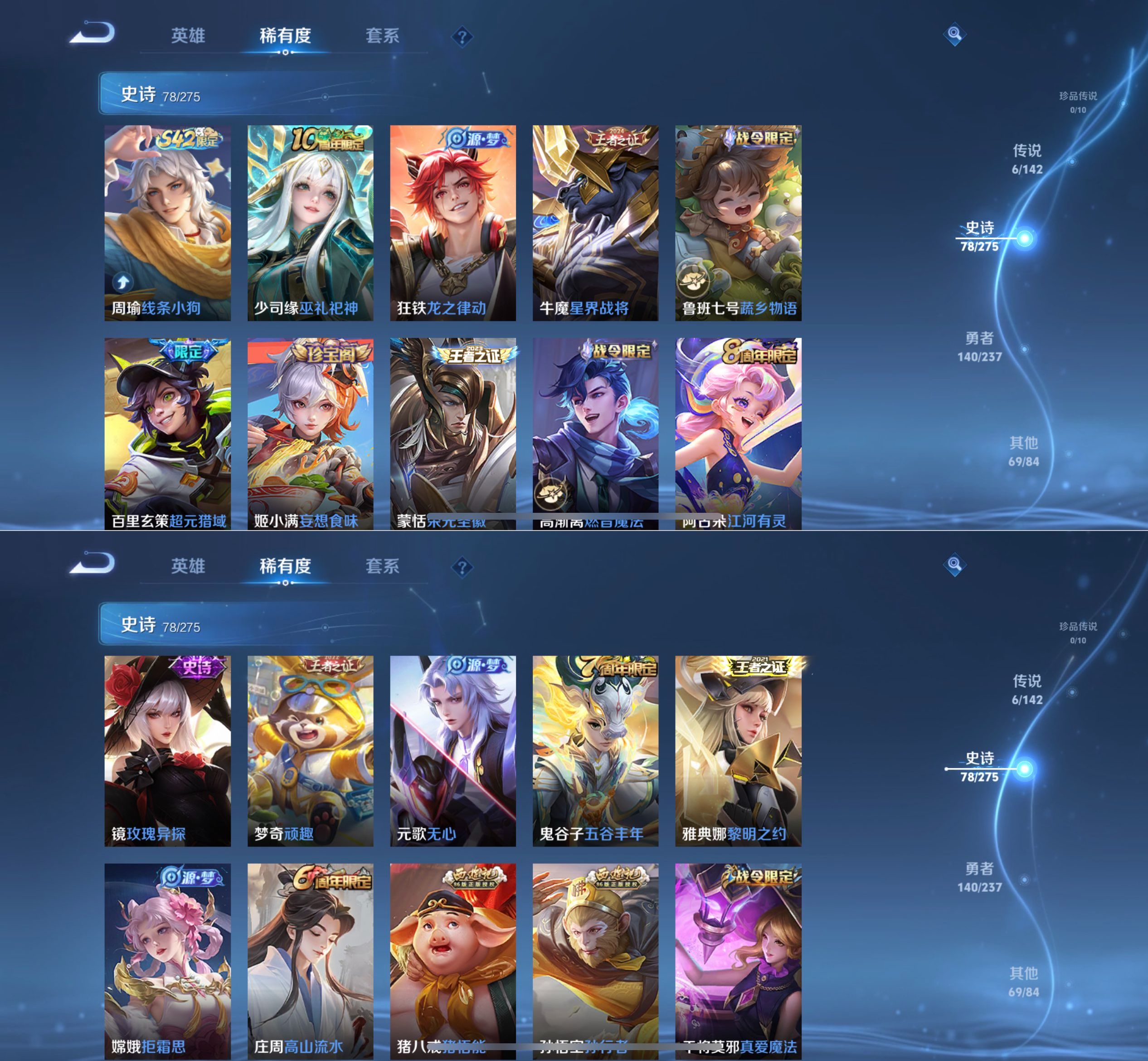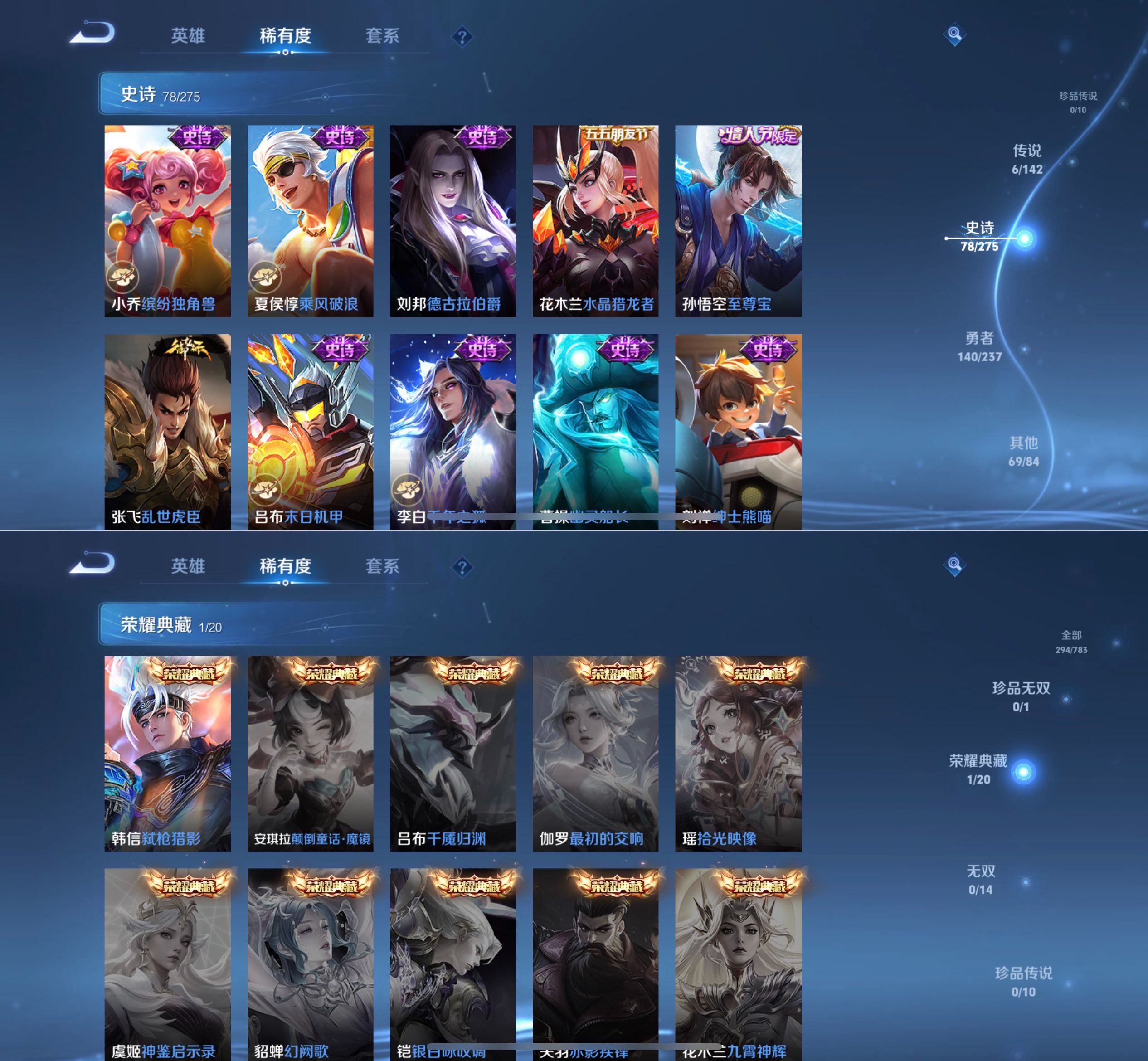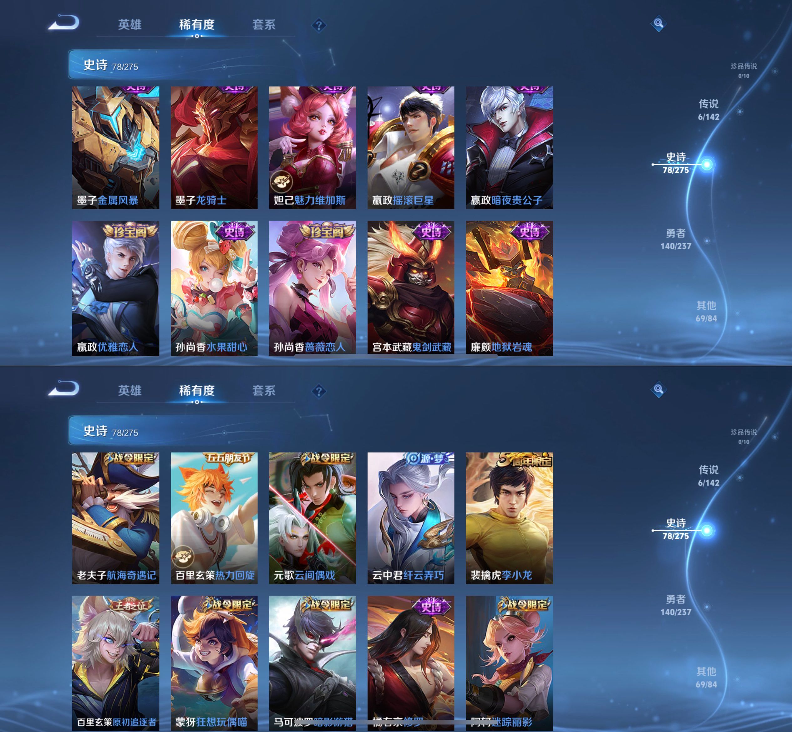 贵族等级:v7皮肤数:294情人节限定1 传说品质6 生肖限定2 荣耀典藏1 英雄数:127