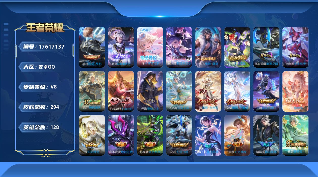 贵族等级:v8皮肤数:294传说品质20 生肖限定2 情人节限定2 珍品传说4 荣耀典藏1 无双1 英雄数:128