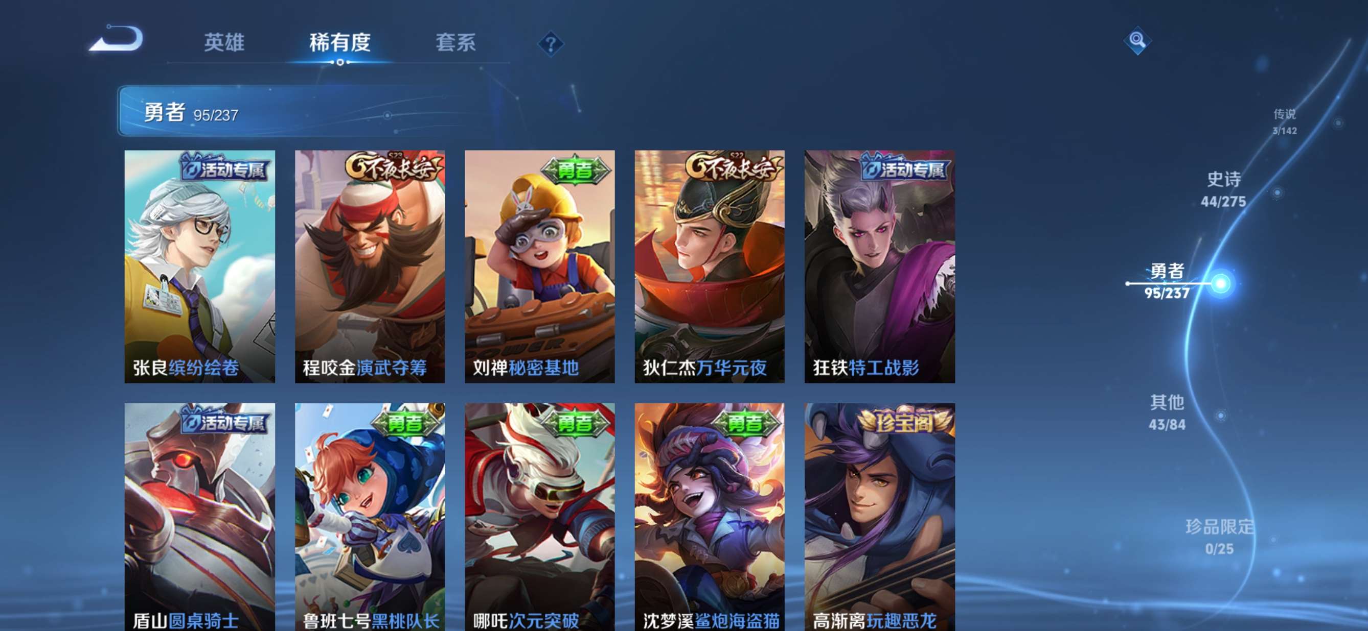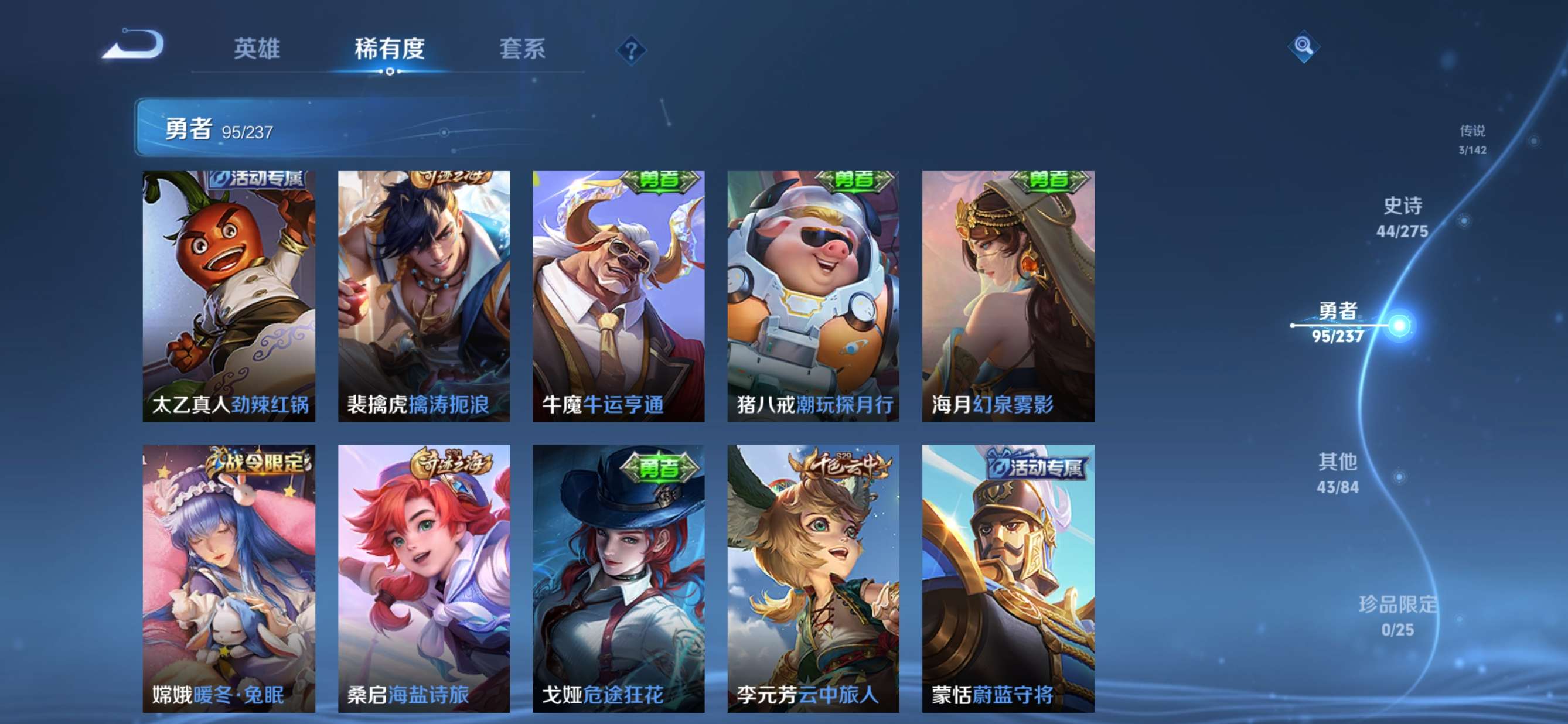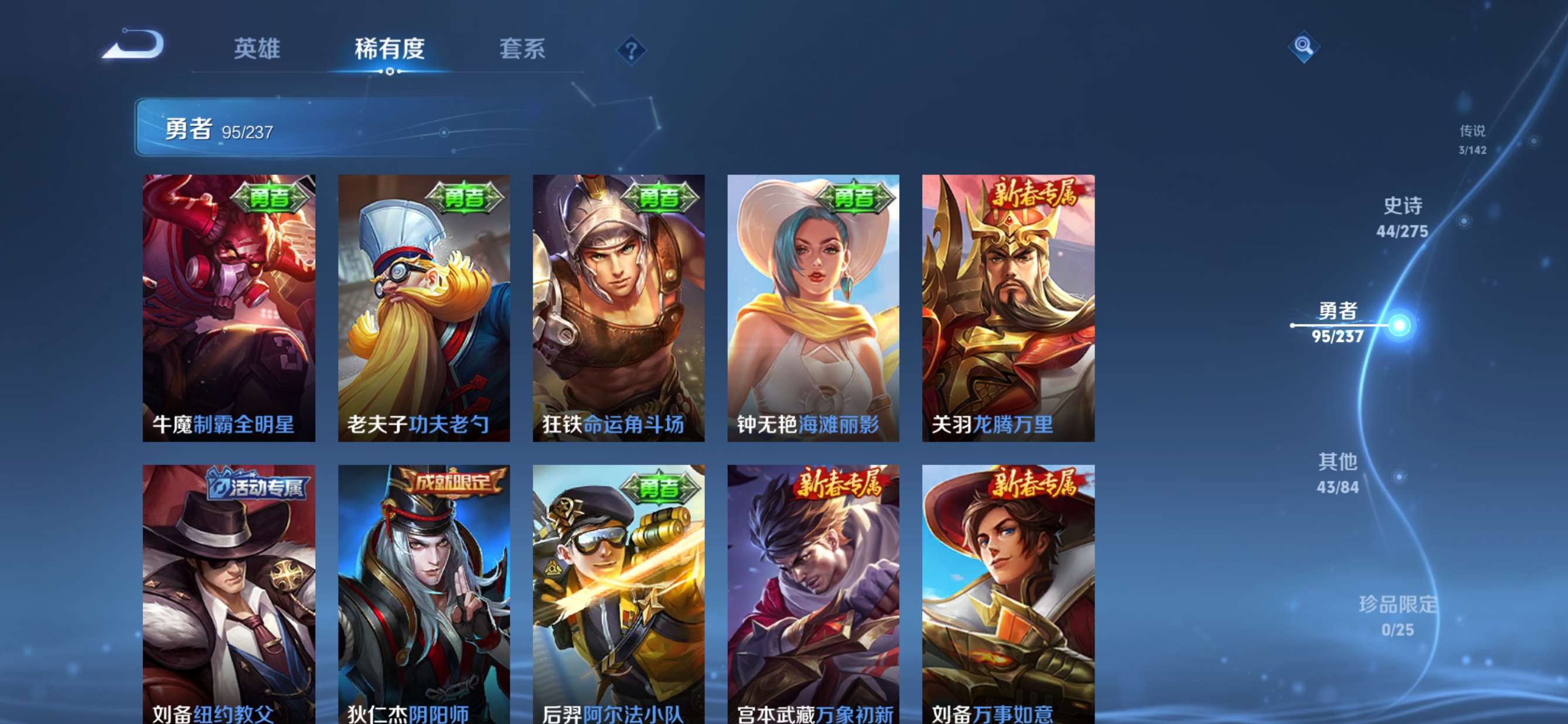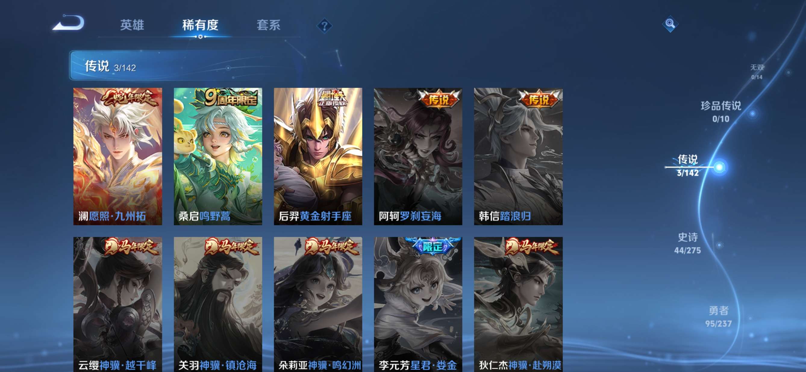 贵族等级:v5皮肤数:186传说品质3 生肖限定2 荣耀典藏1 英雄数:127
