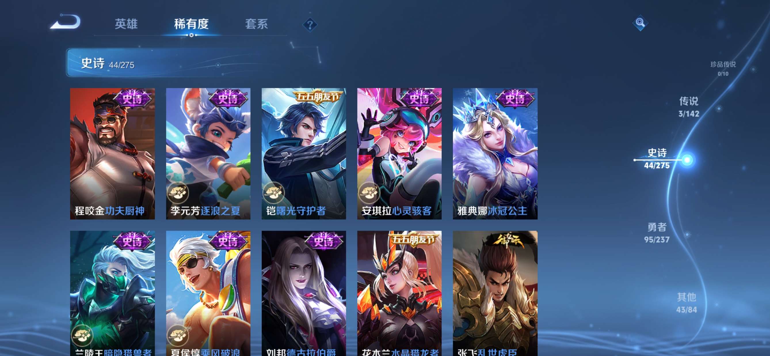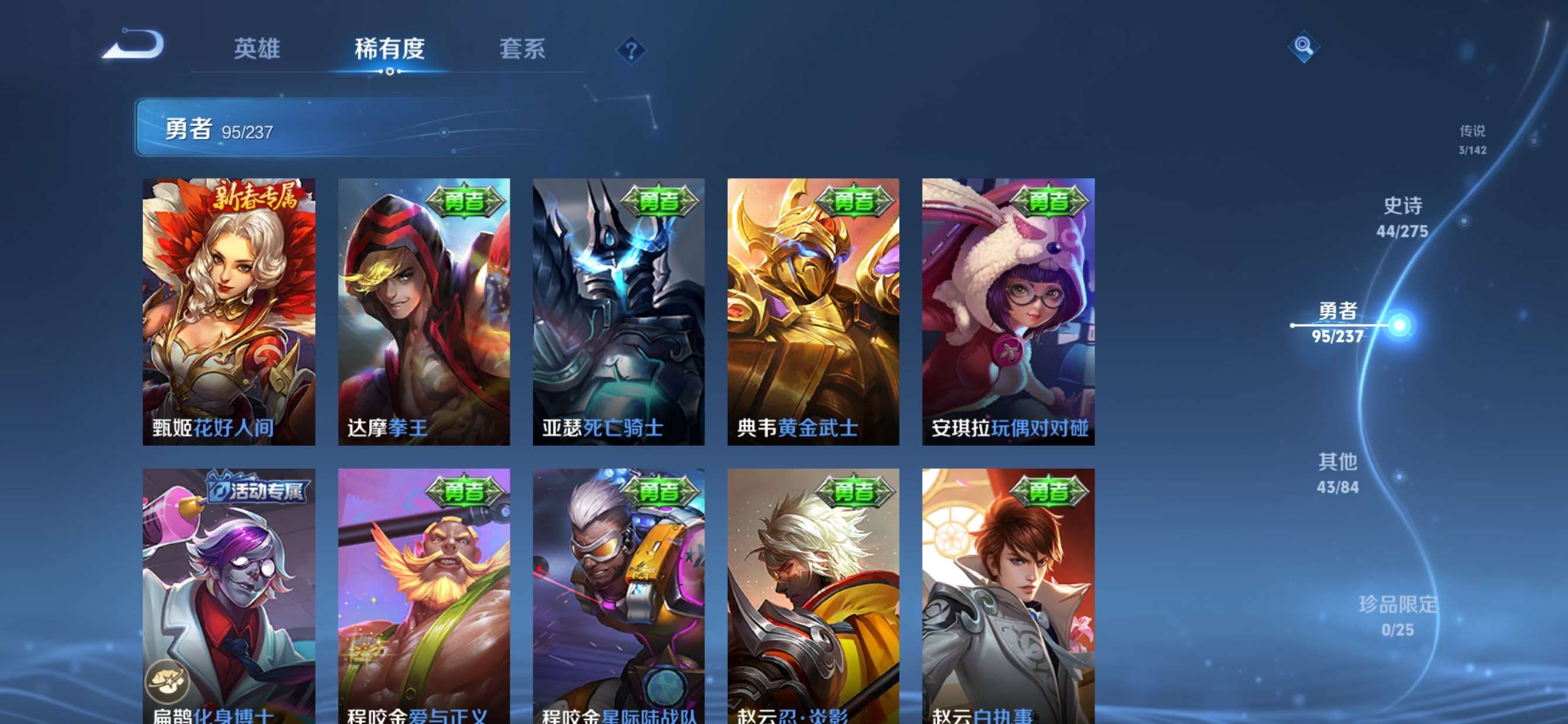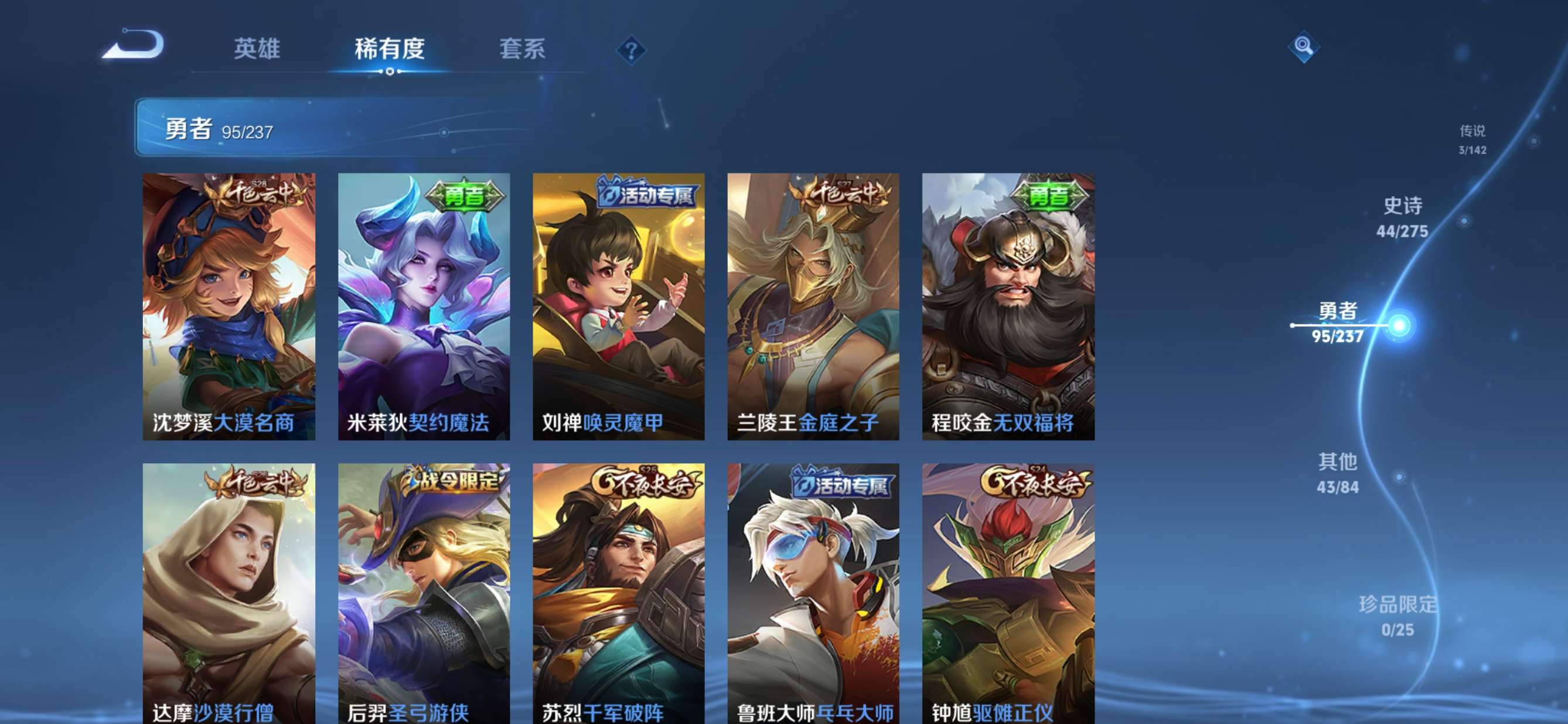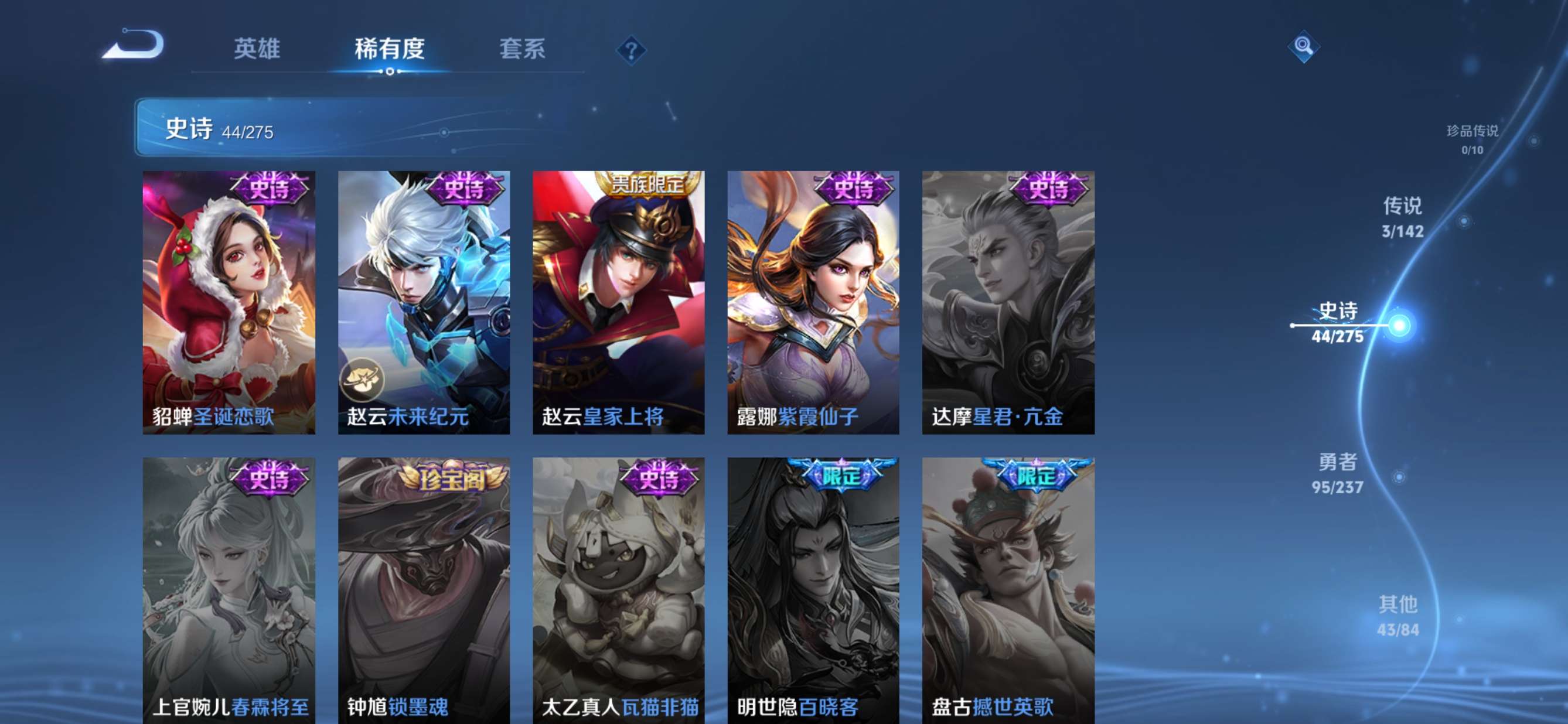 贵族等级:v5皮肤数:186传说品质3 生肖限定2 荣耀典藏1 英雄数:127