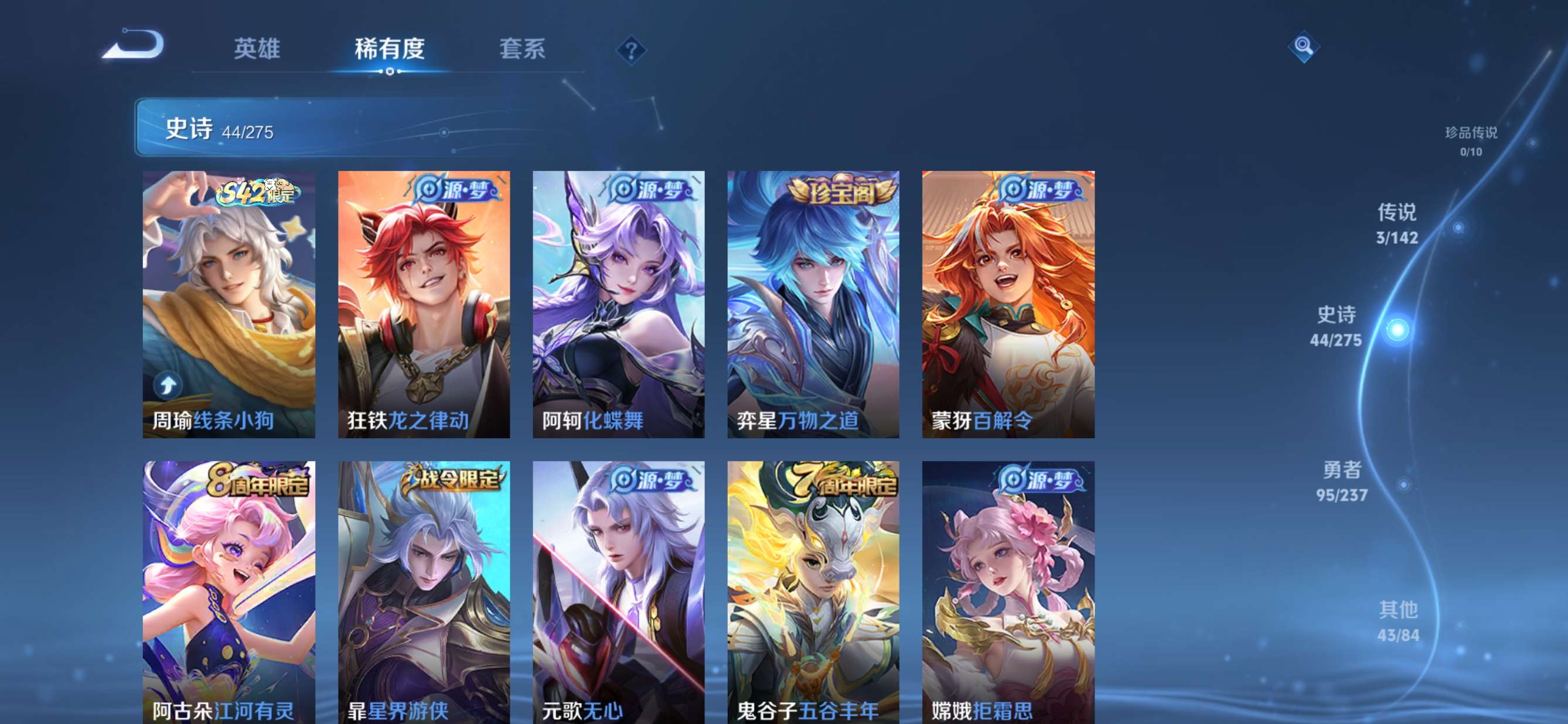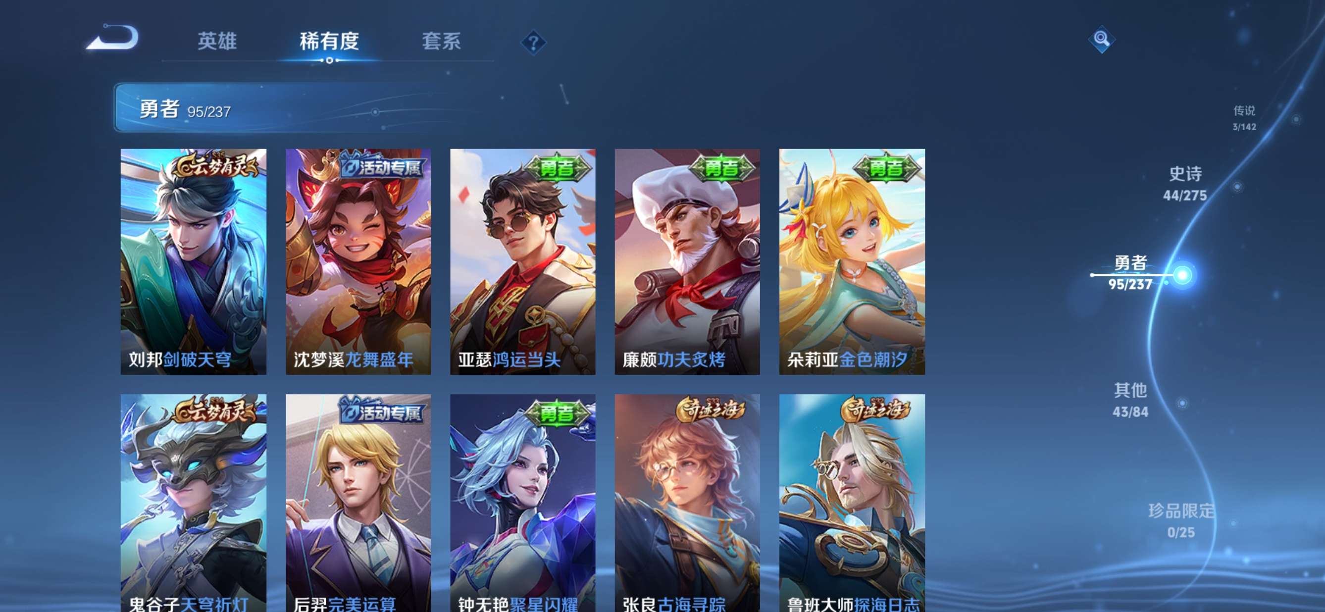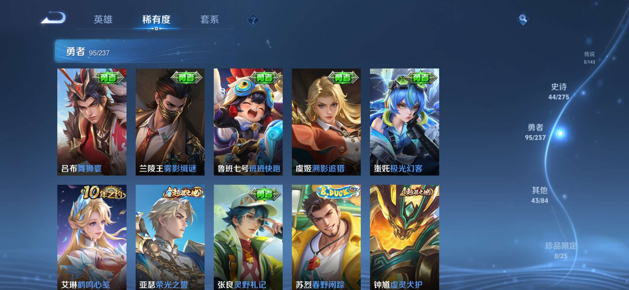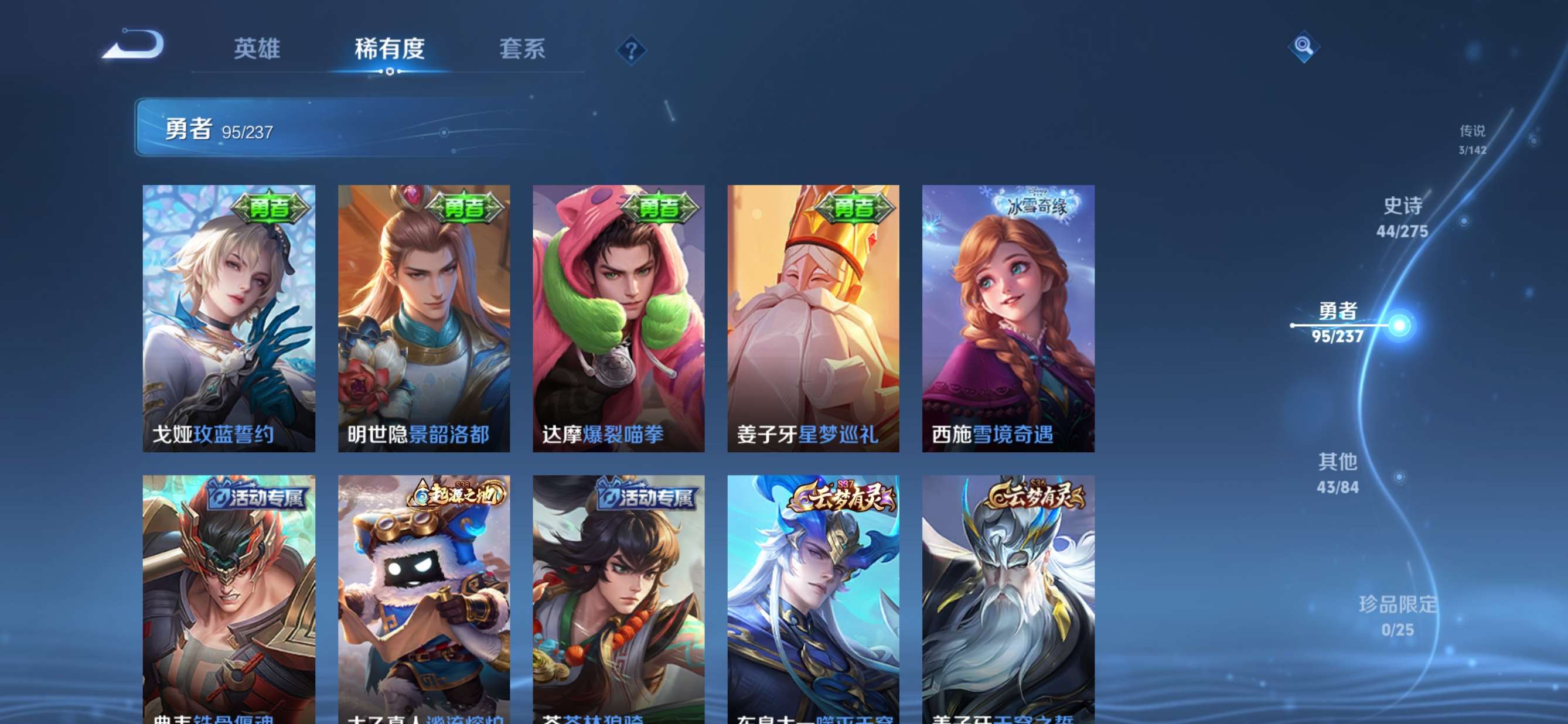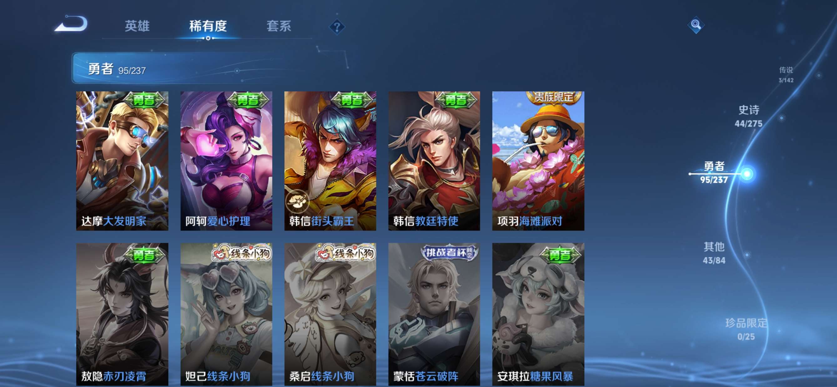 贵族等级:v5皮肤数:186传说品质3 生肖限定2 荣耀典藏1 英雄数:127