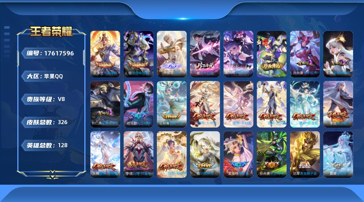 贵族等级:v8皮肤数:326传说品质24 生肖限定11 情人节限定2 无双1 珍品传说3 荣耀典藏2 英雄数:128