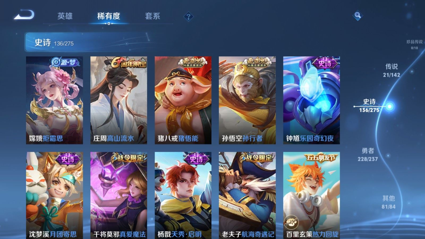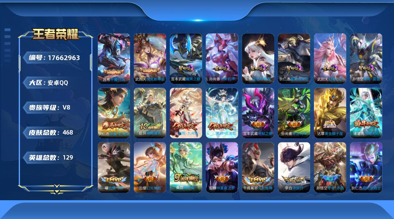贵族等级:v8皮肤数:468传说品质21 生肖限定5 情人节限定1 荣耀典藏2 英雄数:129