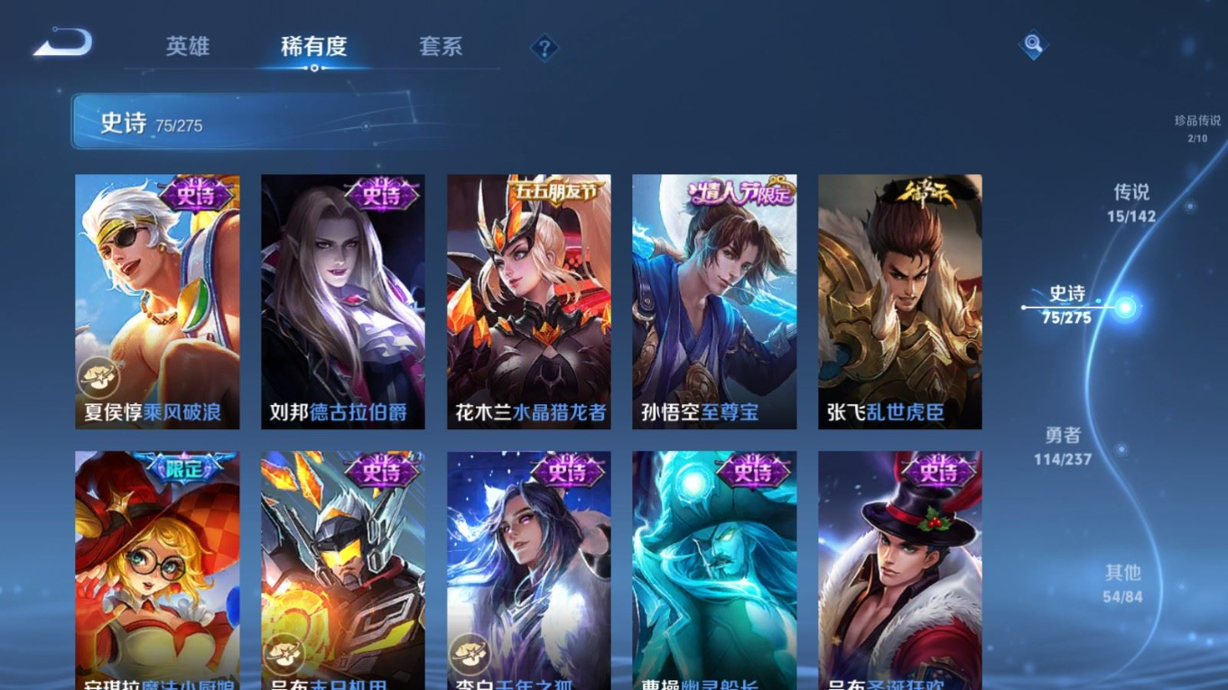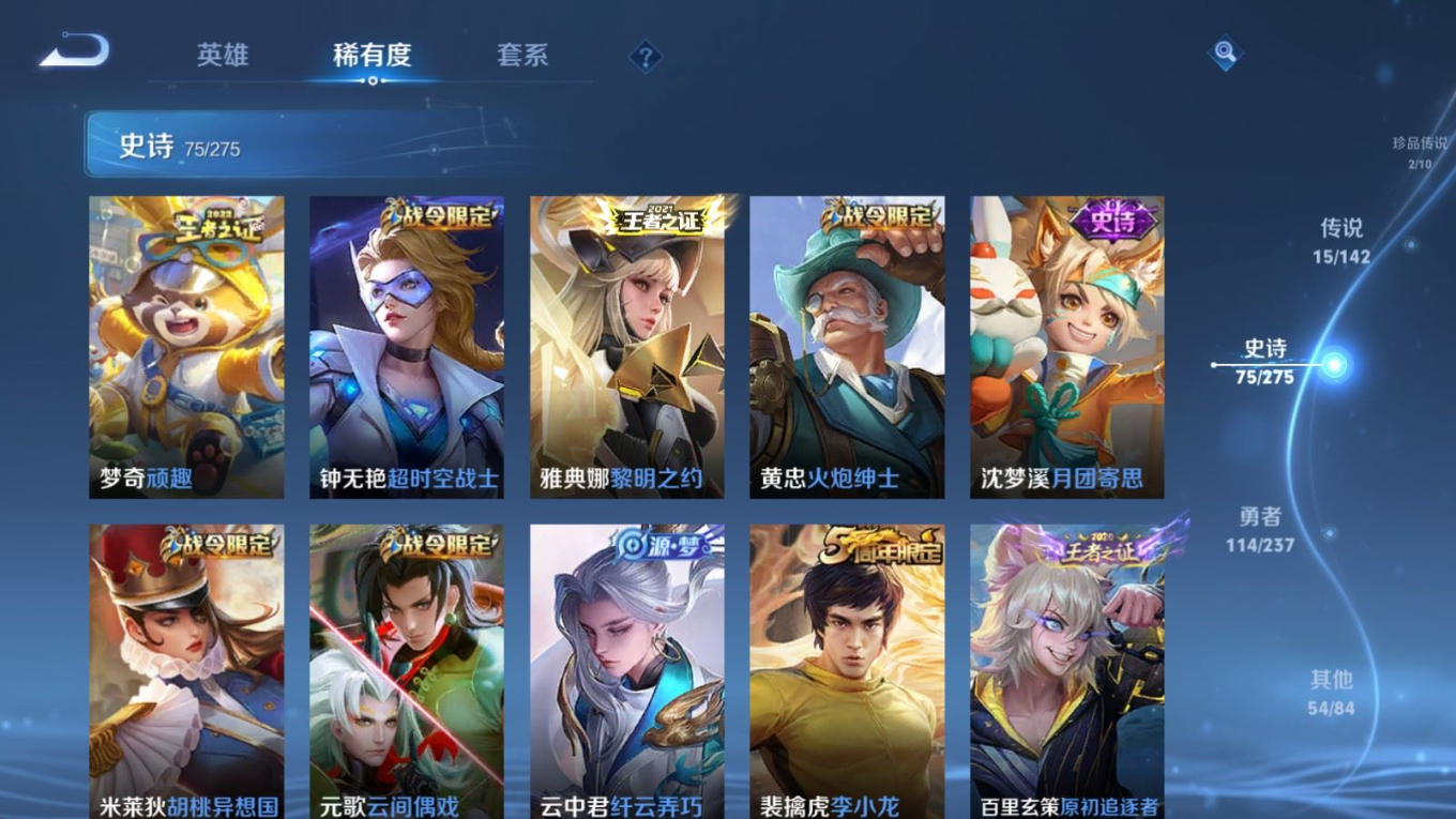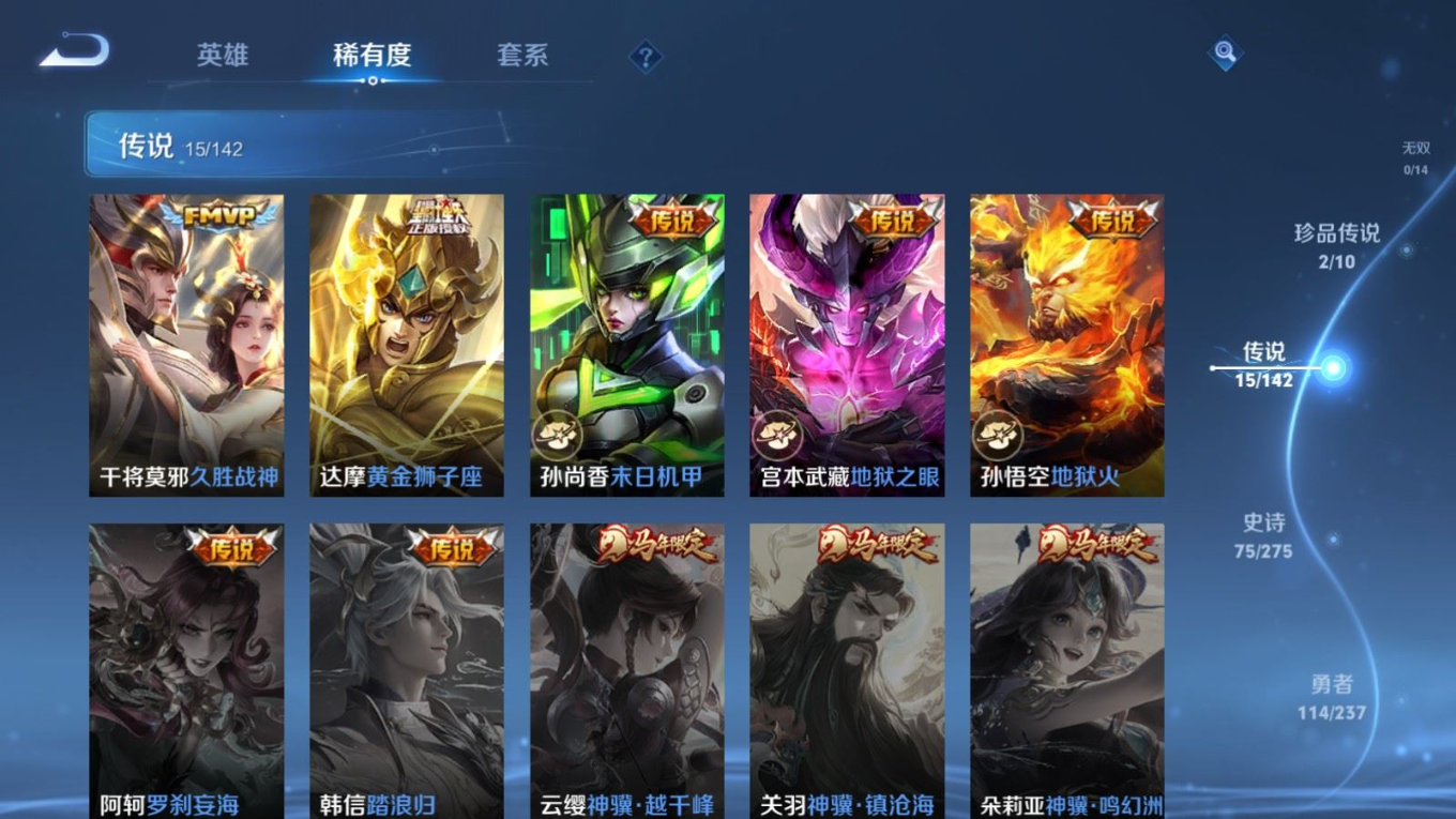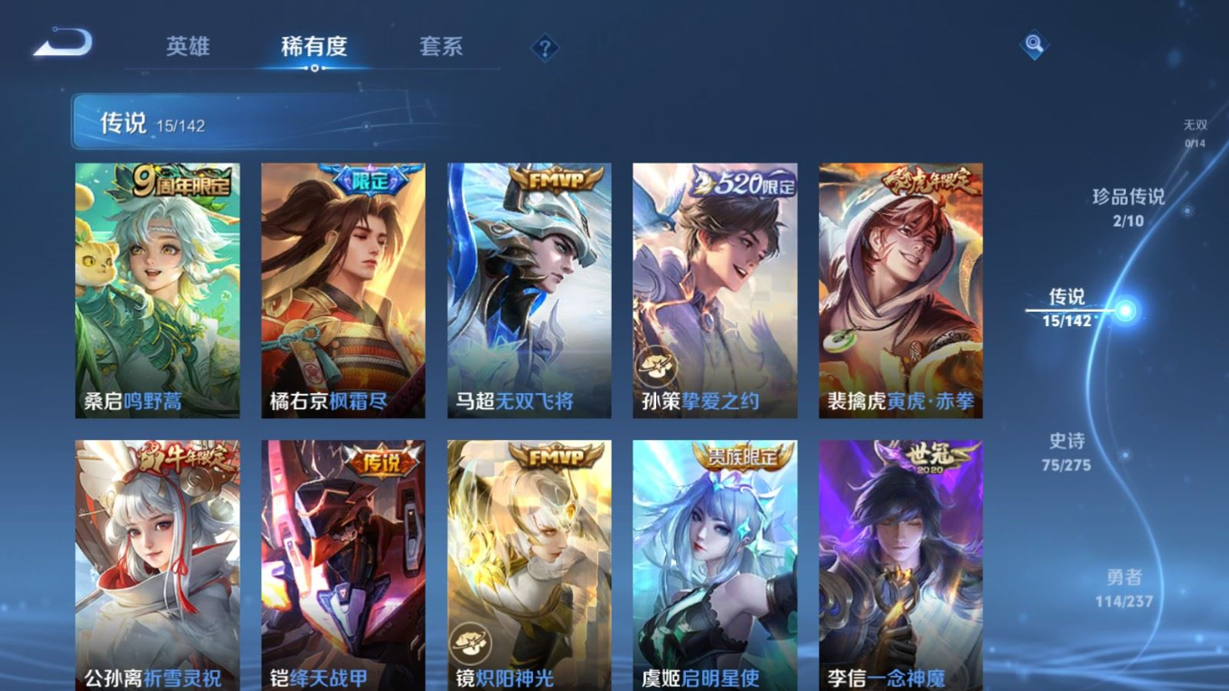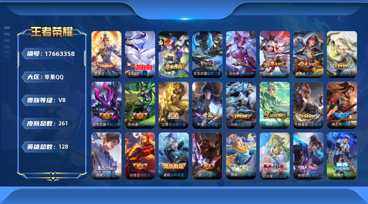 贵族等级:v8皮肤数:261生肖限定4 情人节限定1 传说品质15 荣耀典藏1 珍品传说2 英雄数:128