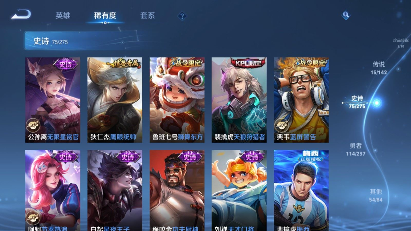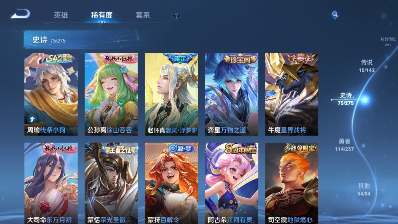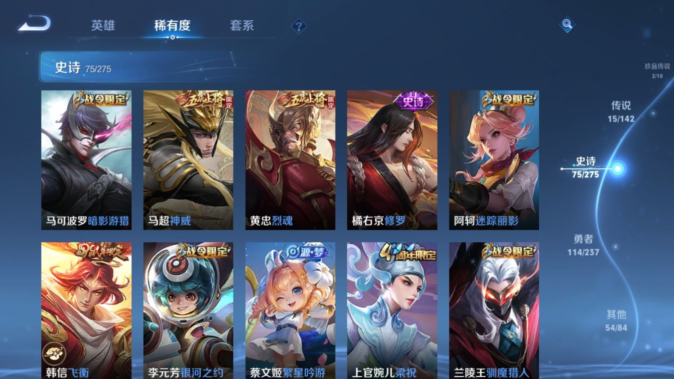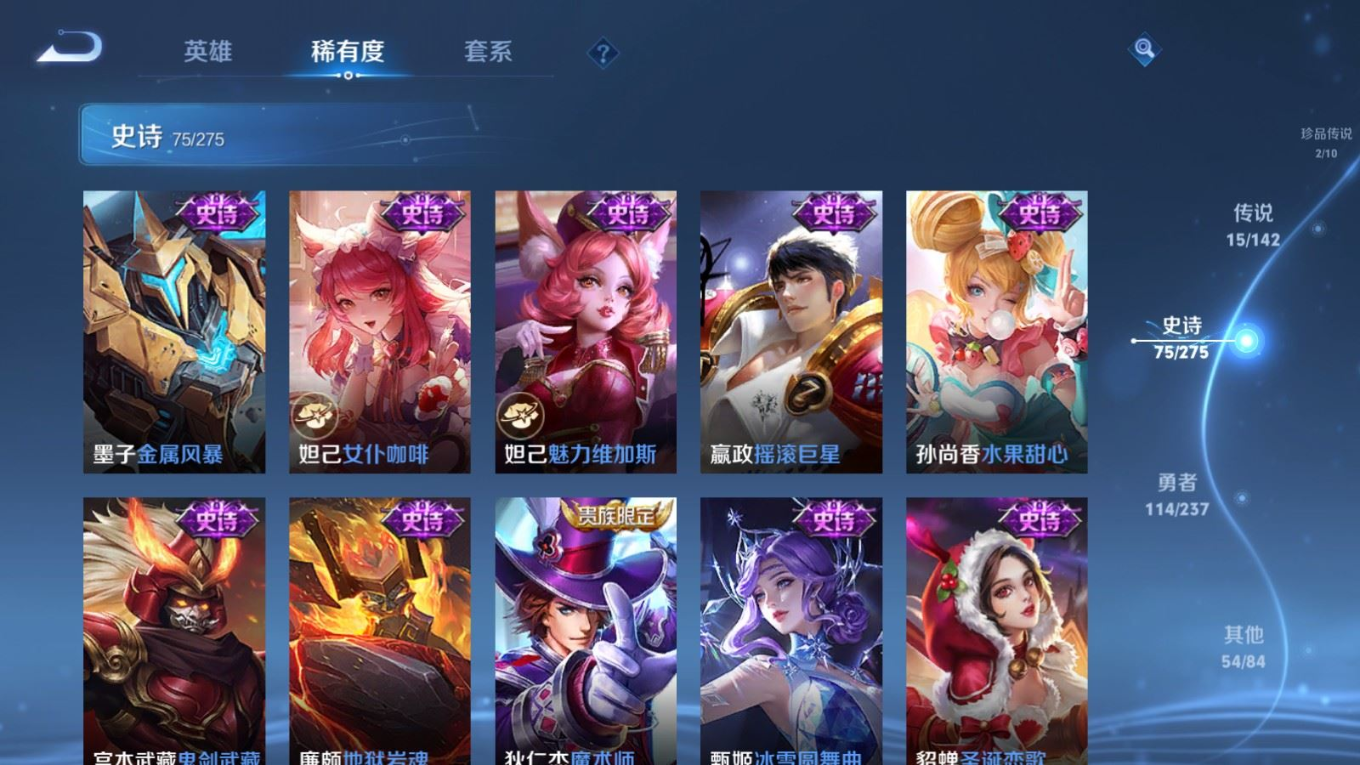 贵族等级:v8皮肤数:261生肖限定4 情人节限定1 传说品质15 荣耀典藏1 珍品传说2 英雄数:128
