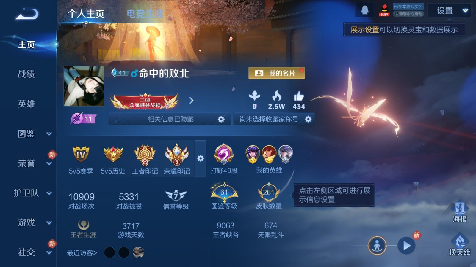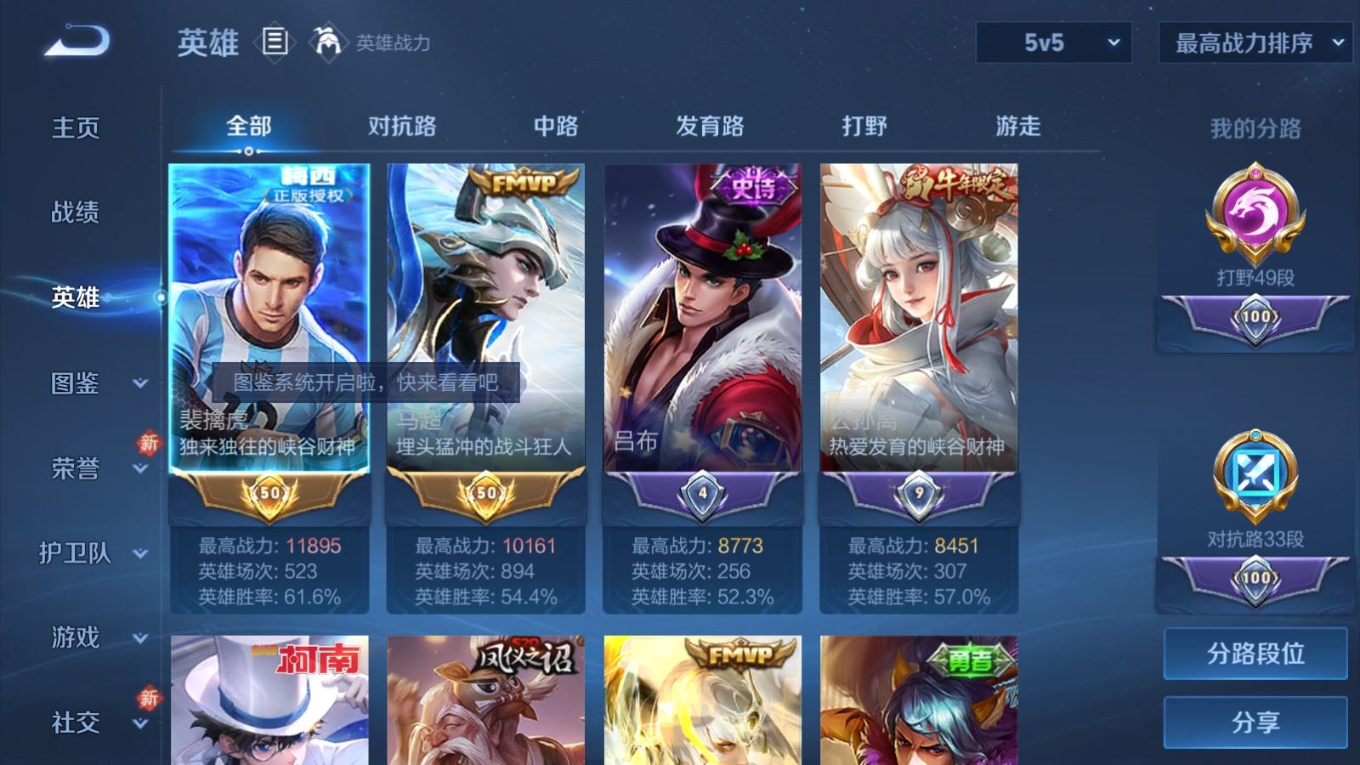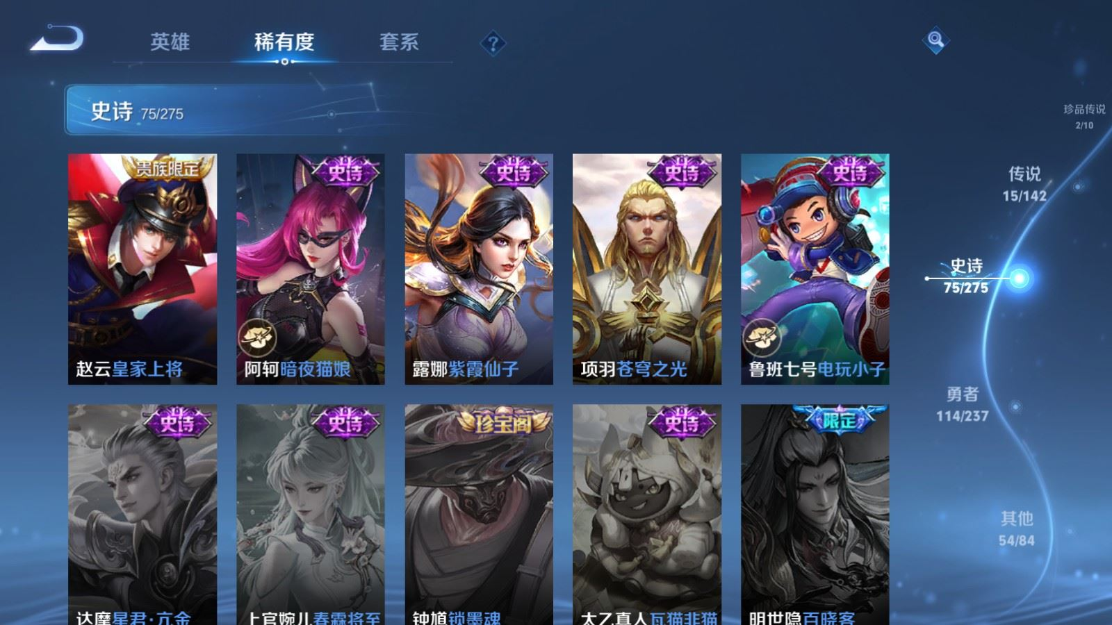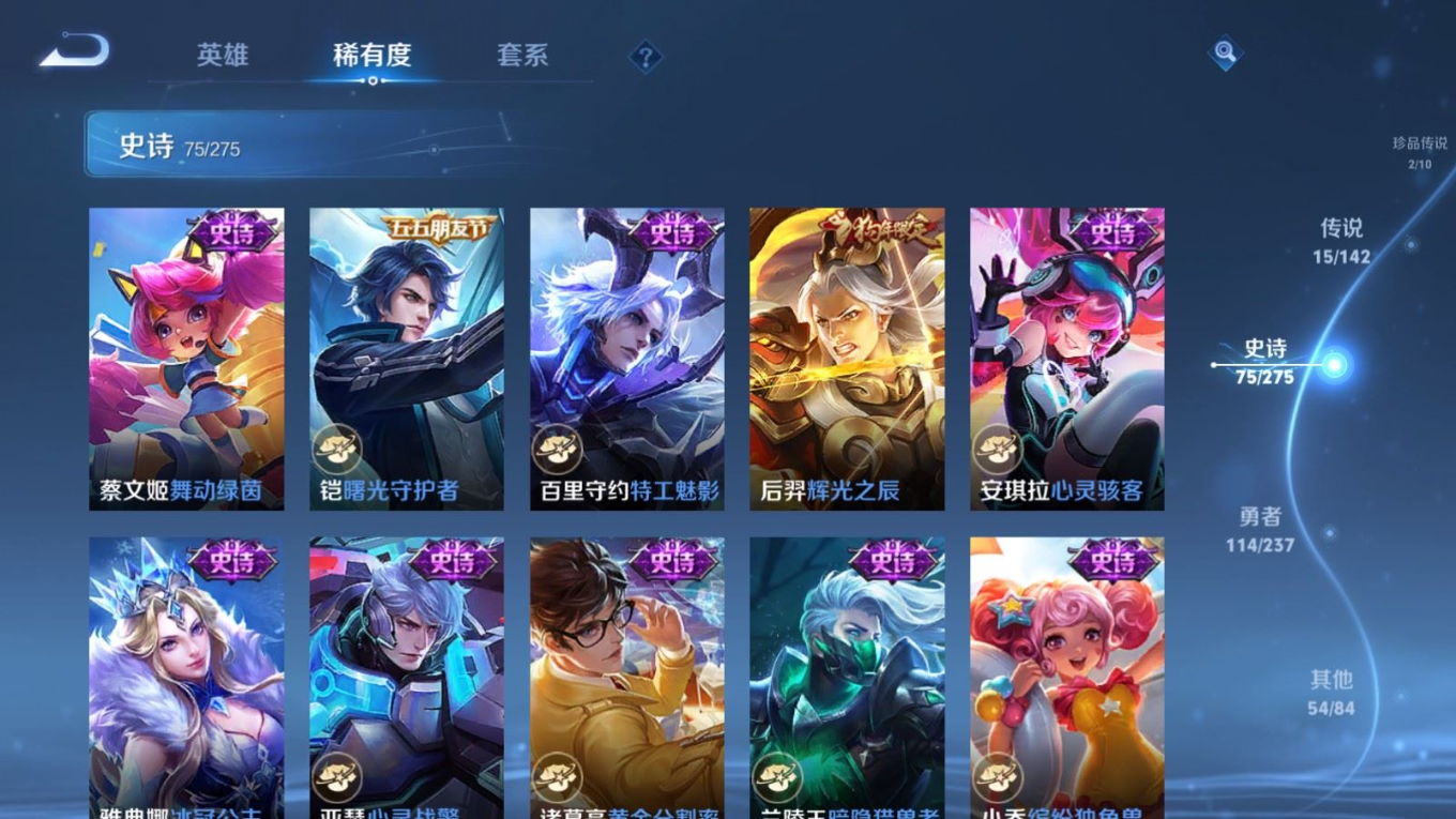 贵族等级:v8皮肤数:261生肖限定4 情人节限定1 传说品质15 荣耀典藏1 珍品传说2 英雄数:128