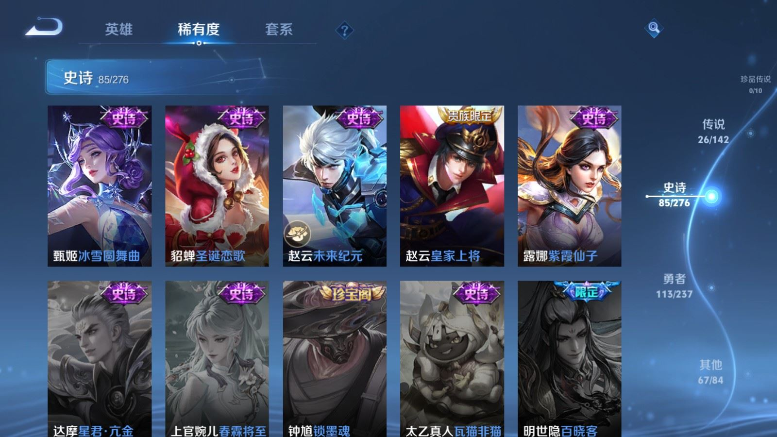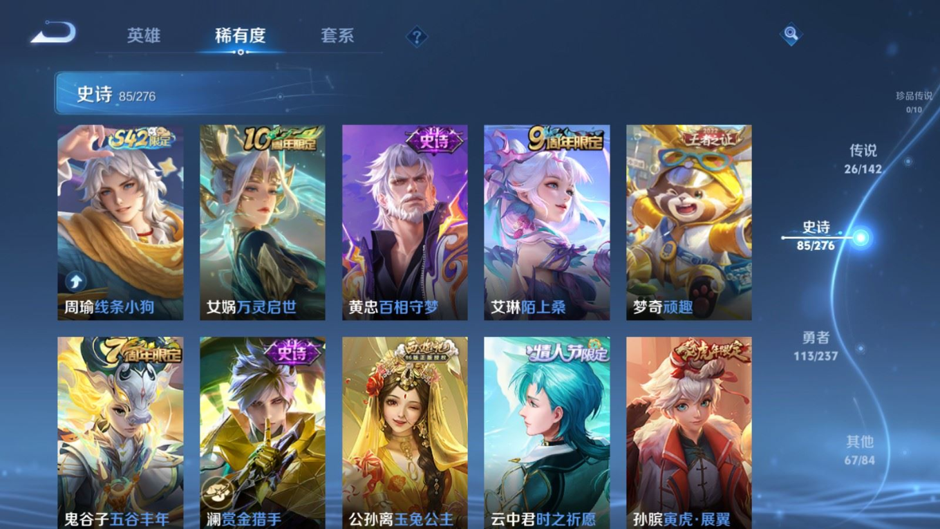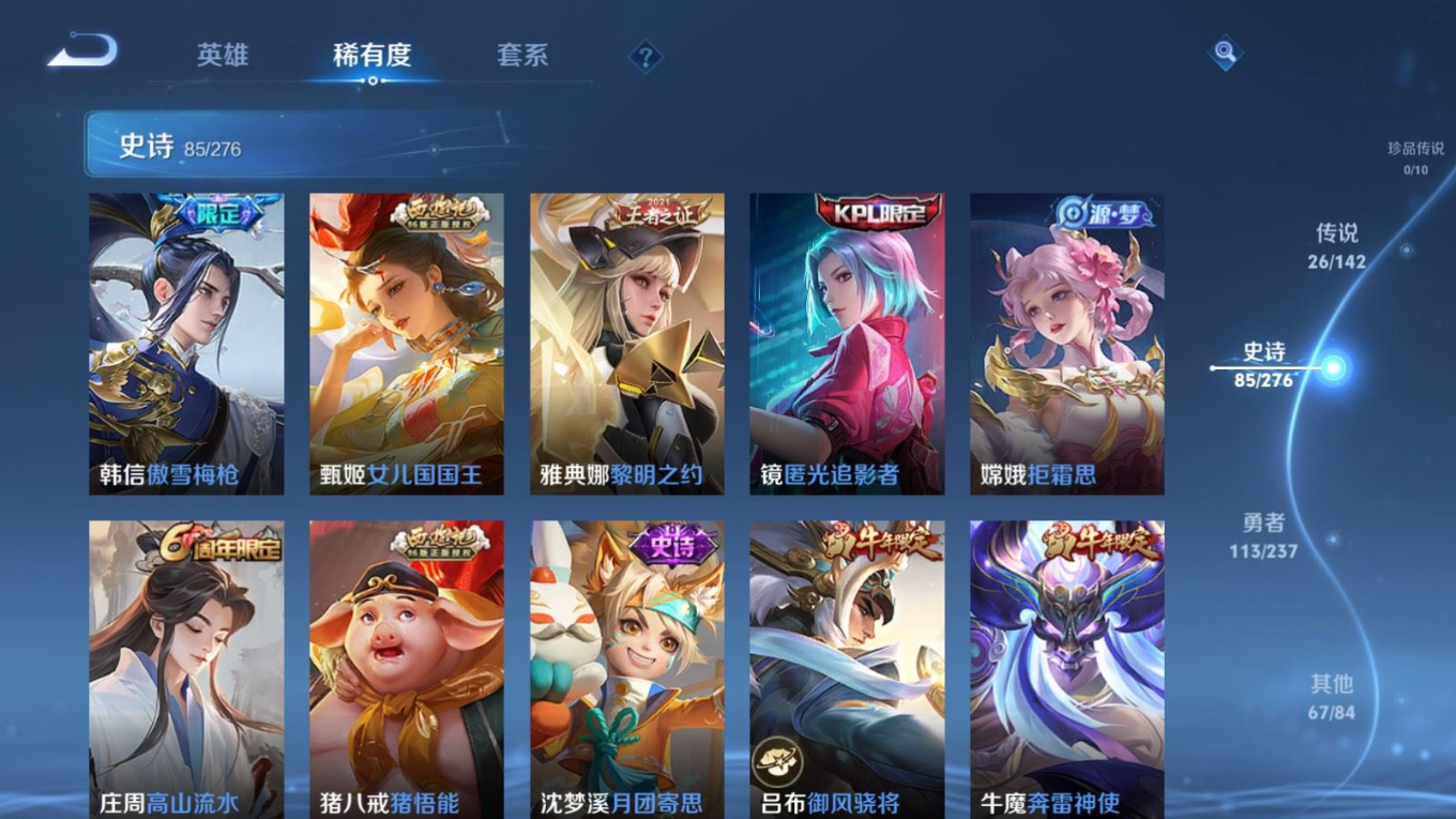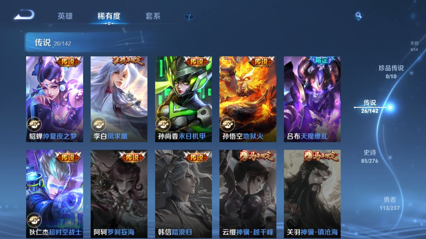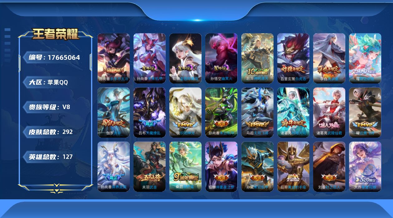 贵族等级:v8皮肤数:292生肖限定11 传说品质26 情人节限定6 荣耀典藏1 英雄数:127