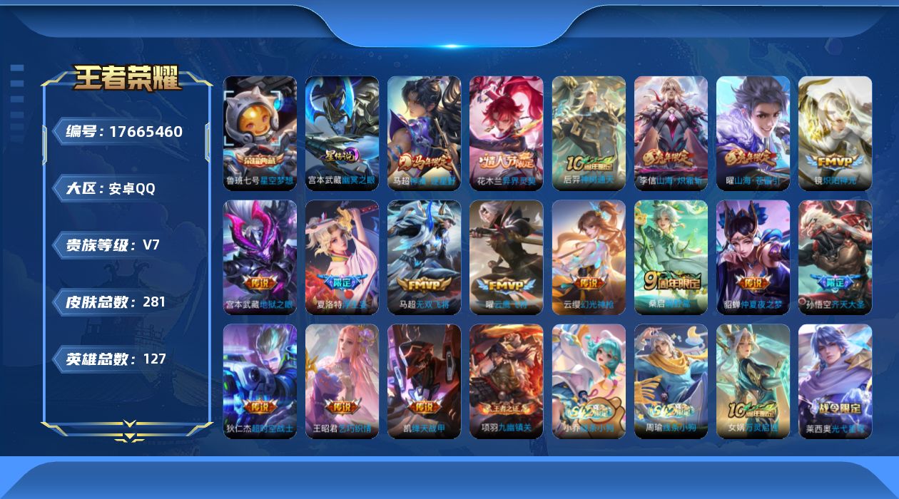 贵族等级:v7皮肤数:281传说品质17 情人节限定2 生肖限定4 荣耀典藏1 英雄数:127