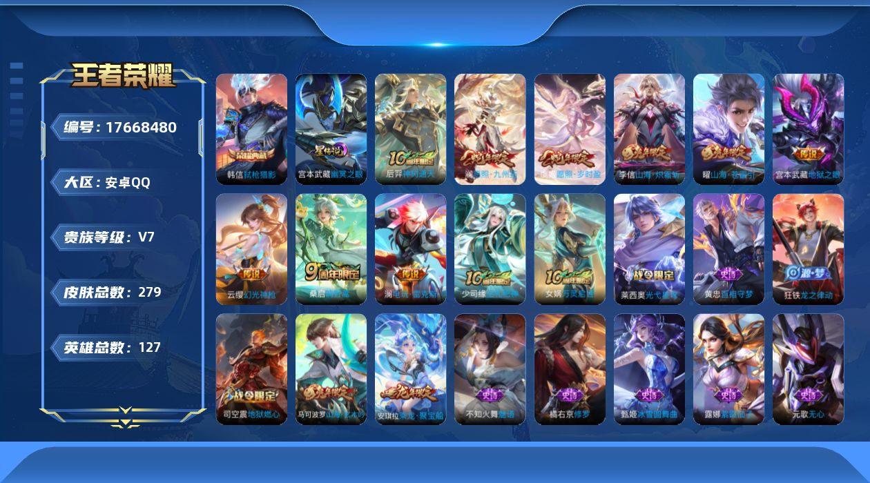 贵族等级:v7皮肤数:279传说品质9 生肖限定6 荣耀典藏1 英雄数:127