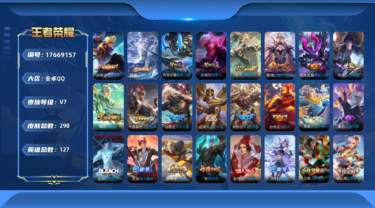 贵族等级:v7皮肤数:298传说品质10 情人节限定1 荣耀典藏1 生肖限定2 珍品传说1 英雄数:127