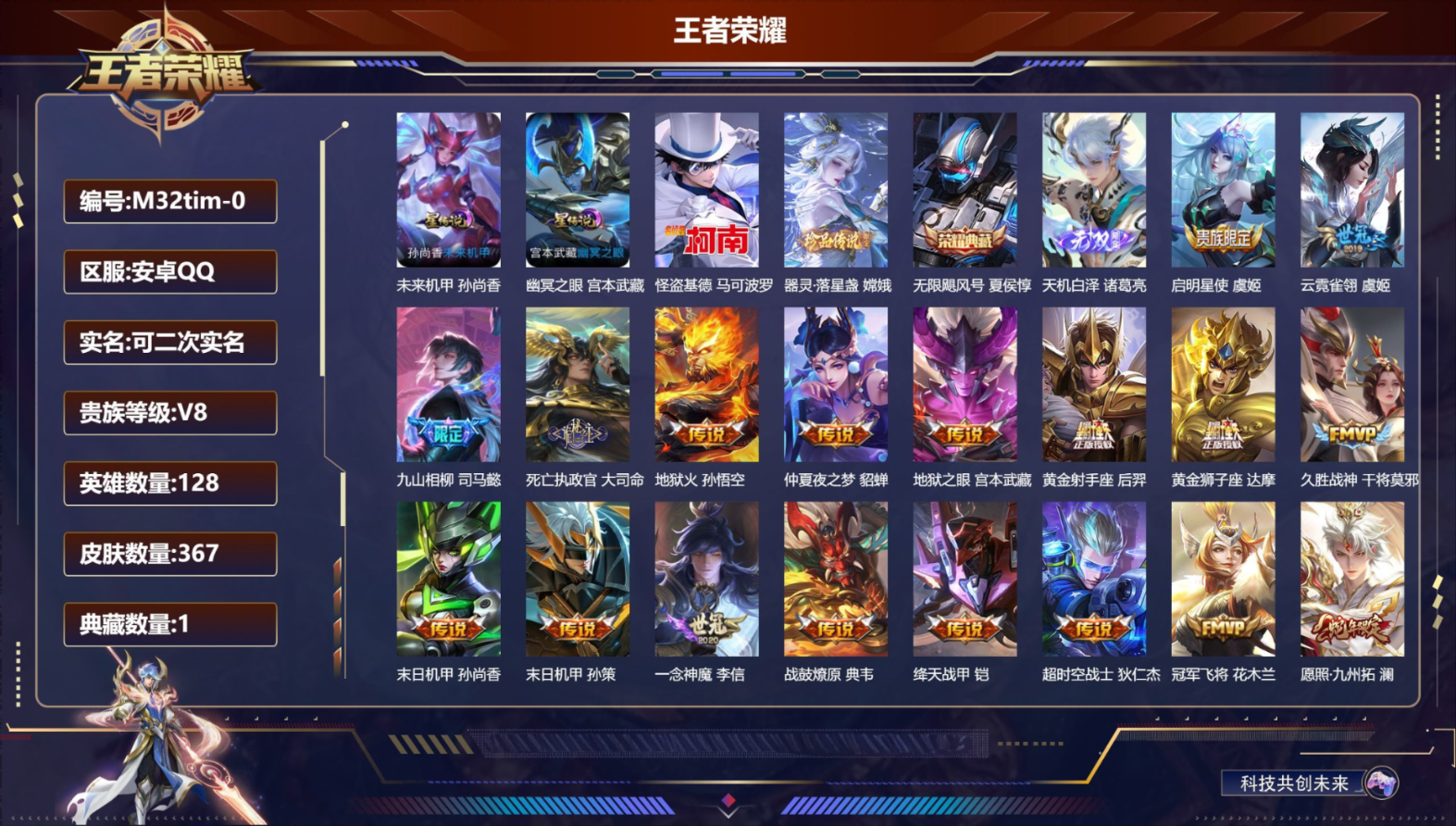 贵族等级:v8皮肤数:367传说品质21 生肖限定3 无双1 情人节限定1 荣耀典藏1 珍品传说2 英雄数:128
