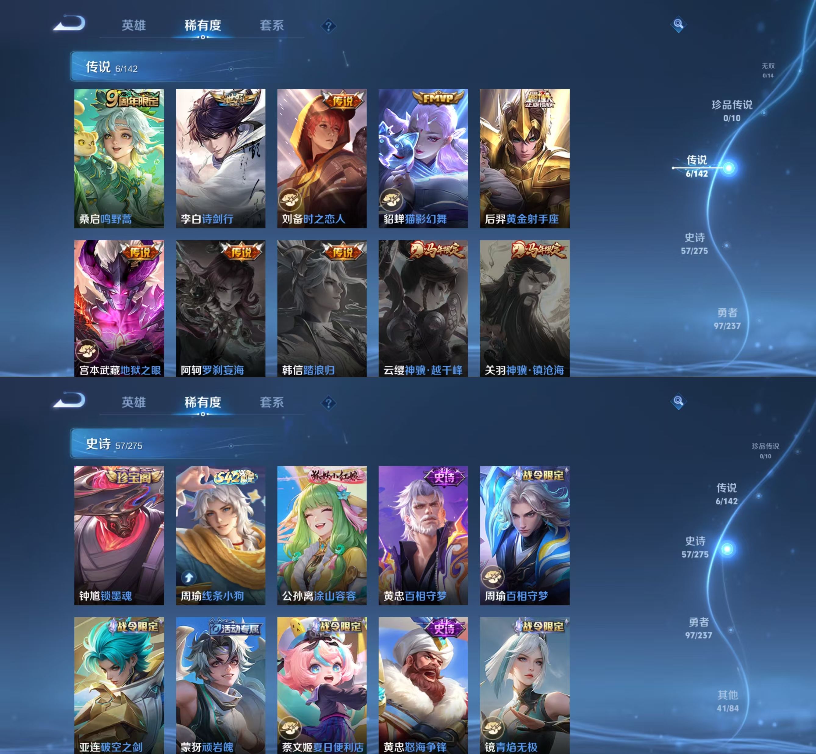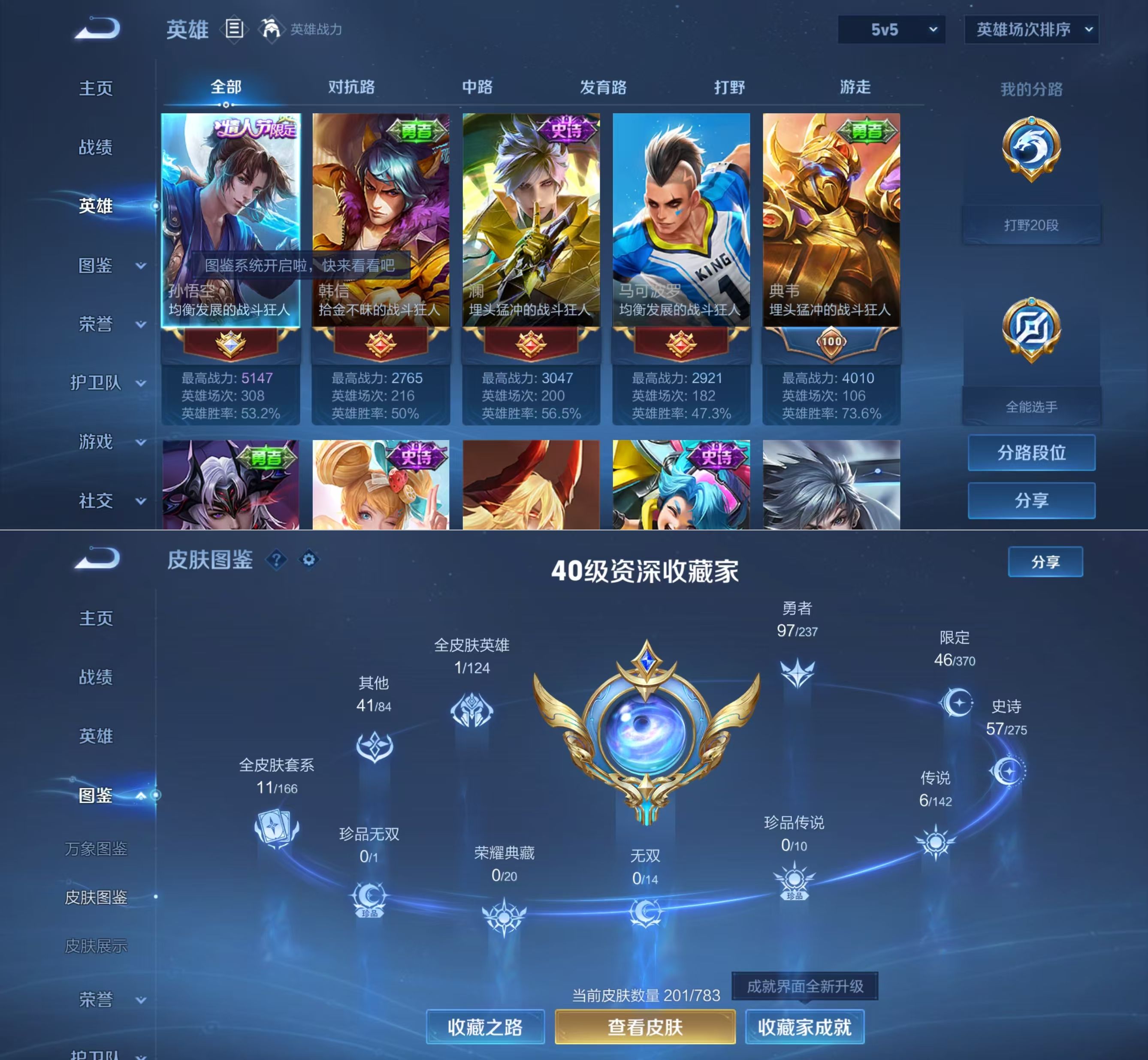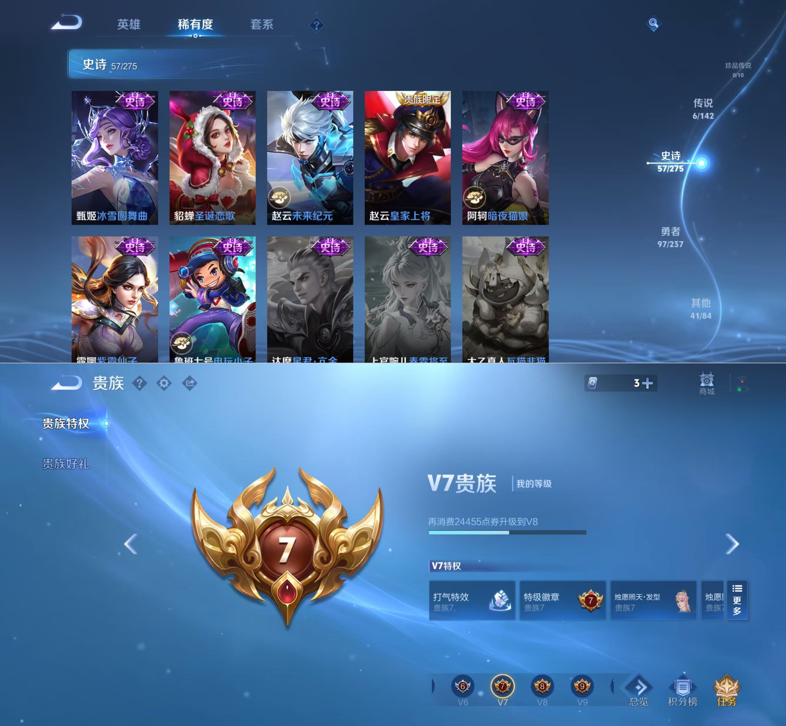 贵族等级:v7皮肤数:201传说品质6 情人节限定1 生肖限定1 英雄数:126